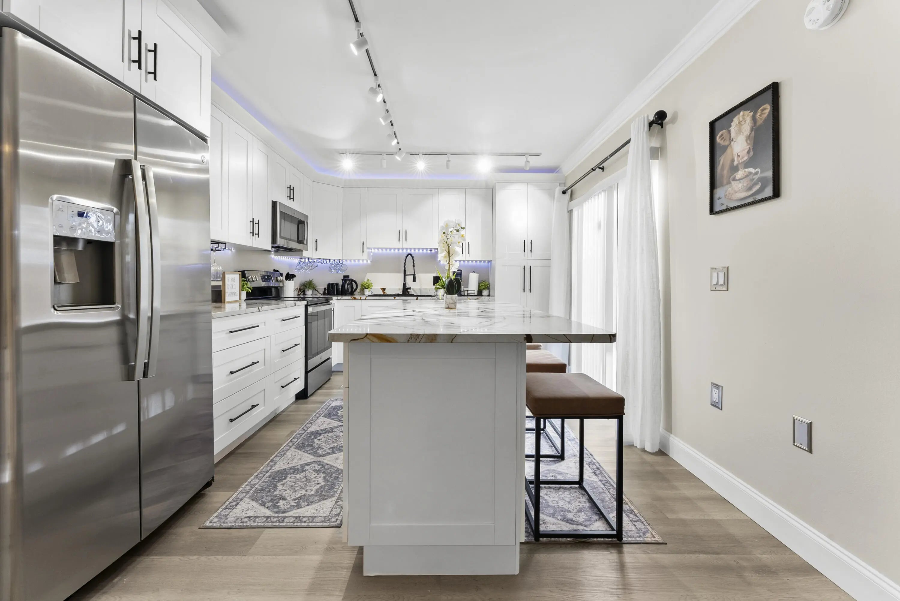 Sun-splashed, stylish, and move-in ready—this 2BR/2.5BA townhome in Delray Oaks West feels like a private retreat. Step inside to a designer kitchen with white shaker cabinets, quartzite counters, stainless appliances, and an oversized island that flows into the open living/dining area. Luxury vinyl plank flooring downstairs, updated baths, spacious bedrooms, and a full-size Maytag washer/dryer add comfort and convenience. Outside, your fenced patio overlooks a peaceful pond—perfect for morning coffee or sunset wine. All-age community with saltwater pool, fitness room, pickleball, tennis, and just minutes to I-95, beaches, and Atlantic Ave.