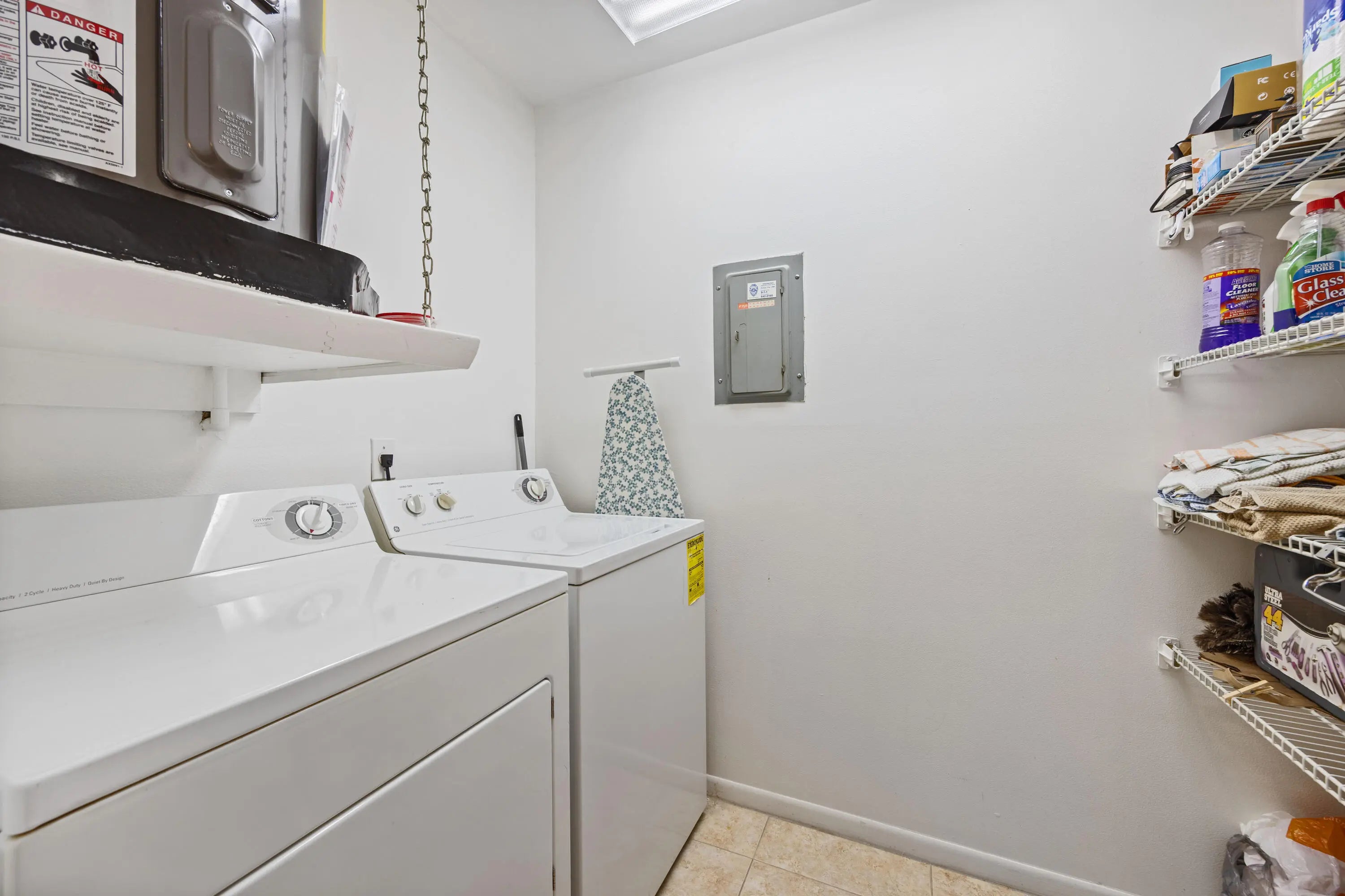 Low price for this fully-furnished 2nd floor 2 bedroom condo with a nice open floor plan! Spacious living and dining area. Each bedroom has its own walk-in closet. Full-size washer and dryer in separate laundry room. Accordion hurricane shutters for your protection. Screened patio with a convenient storage room. NEW ROOF 2025 without assessments. Located in La Pinata, a well-managed 55+ community with a clubhouse, pool, bocce, shuffleboard, a scenic walk-in path around a pretty lake, and close to the Turnpike. Condo fees include cable and internet.