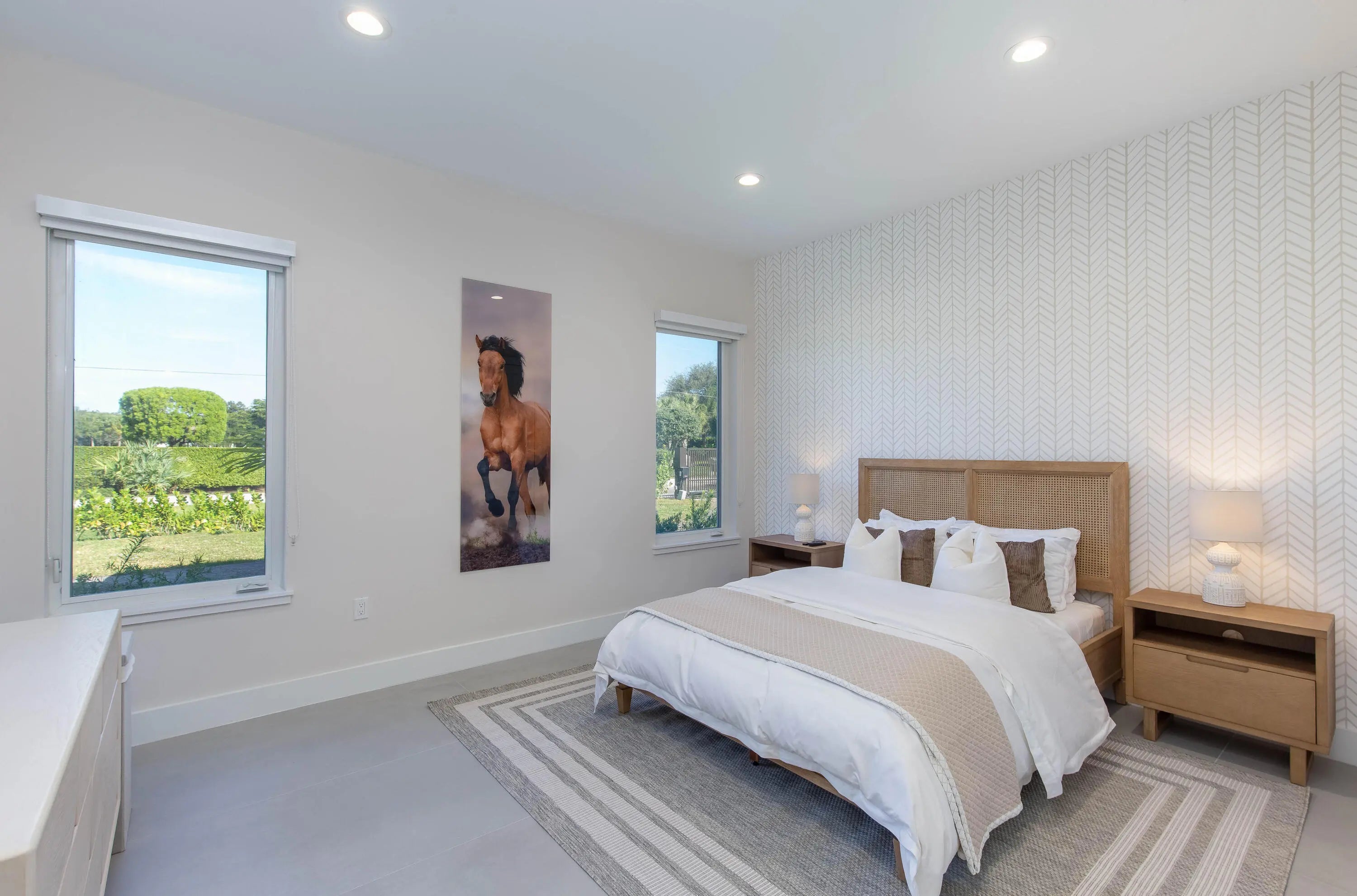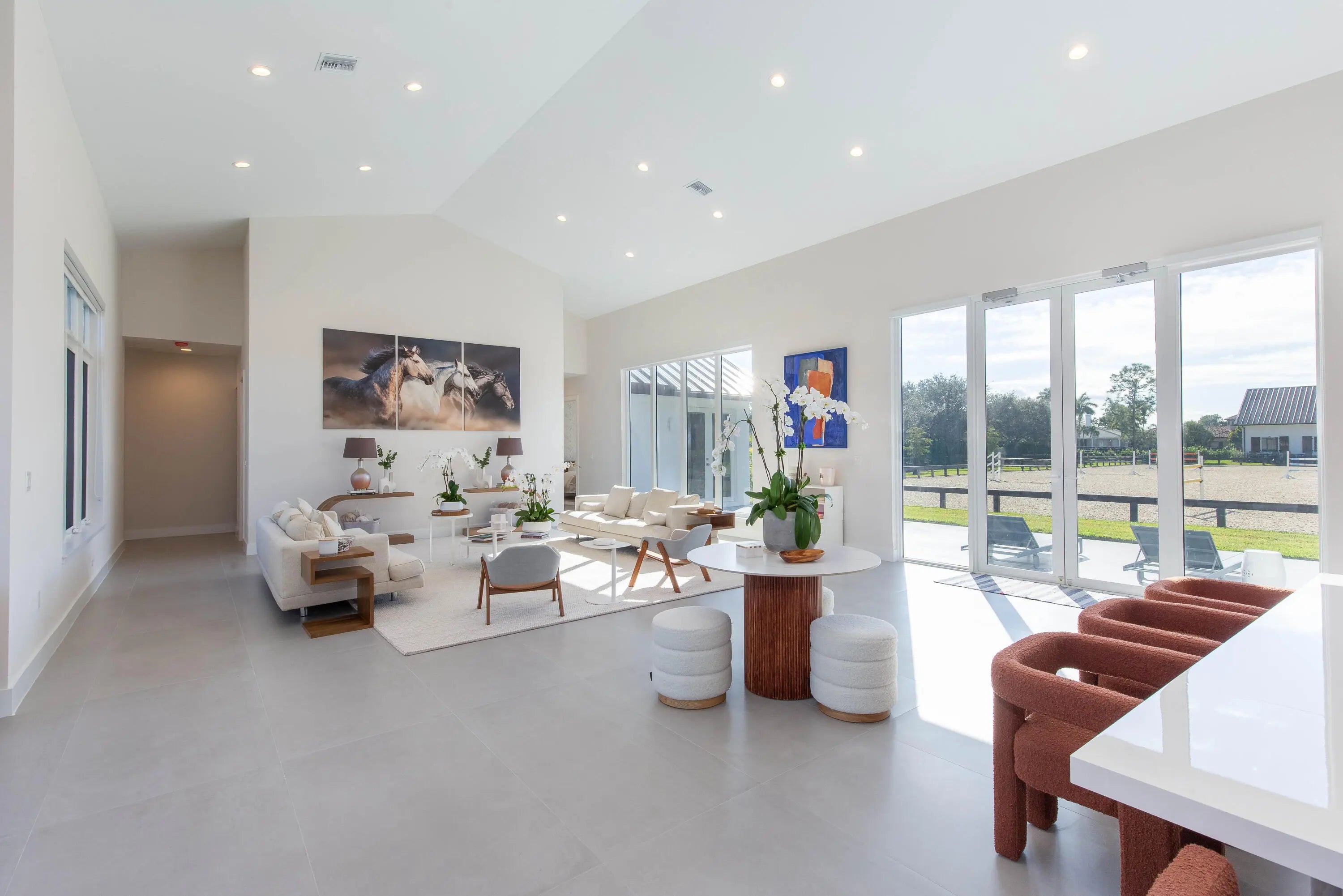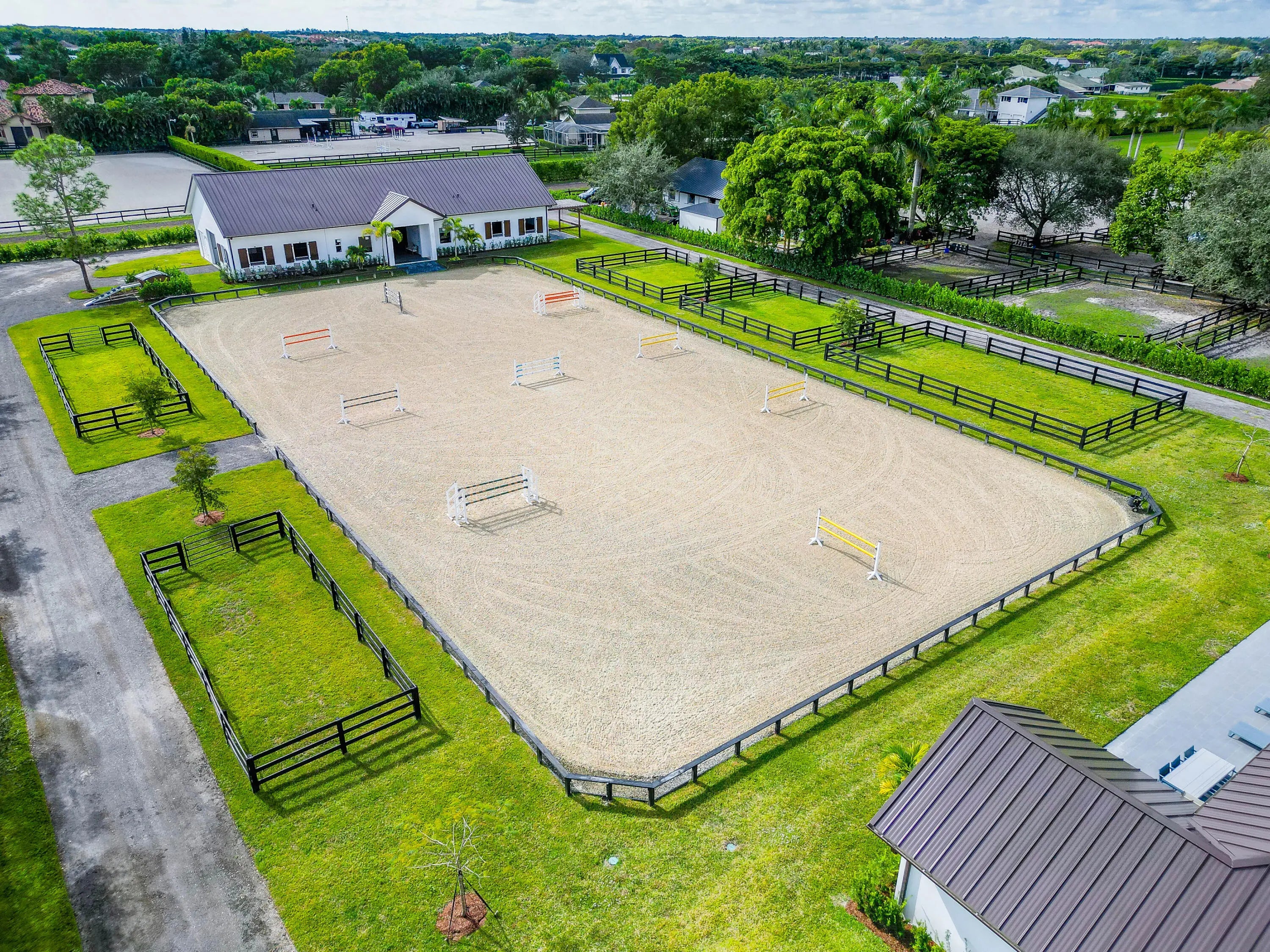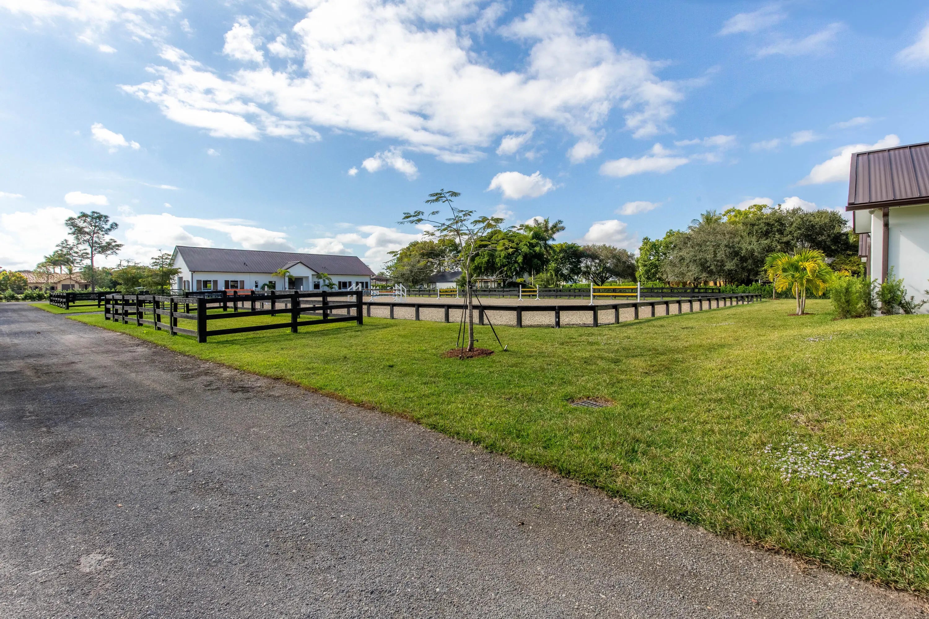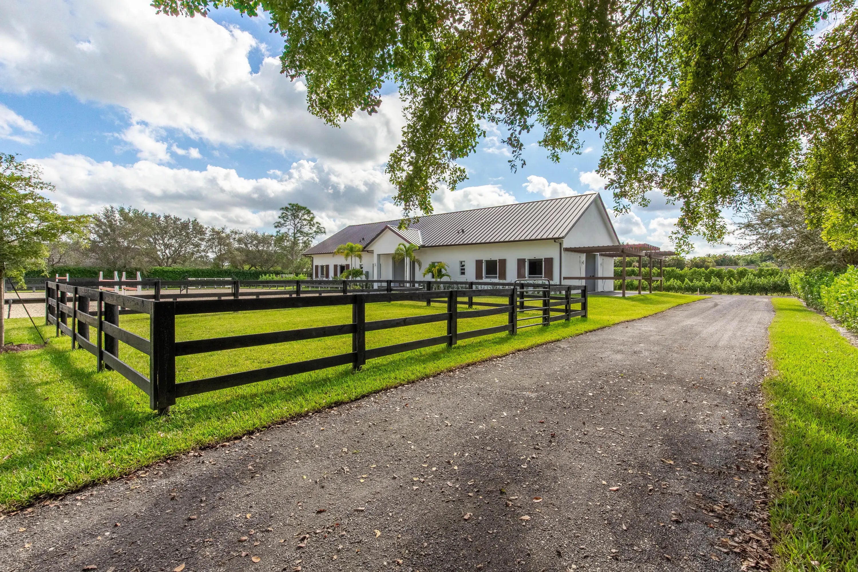 Exquisite seasonal lease in the coveted Saddle Trail neighborhood of Wellington. Modern, 4-bed, 4-bath residence crafted for comfort and convenience, with an expansive open-concept living area and high-end finishes. Each bedroom is large with its own en-suite bathroom. Gourmet kitchen featuring premium appliances, custom cabinetry, and a large island—perfect for entertaining. State of the art brand new 10 stall barn with a tack room, wash racks, feed room, 5 paddocks, and a lounge, all designed for top-tier horse care. Easy hackable access to the horse show, with many riding trails for days off makes for the perfect seasonal retreat! Entire property offered at $45,000 per month.