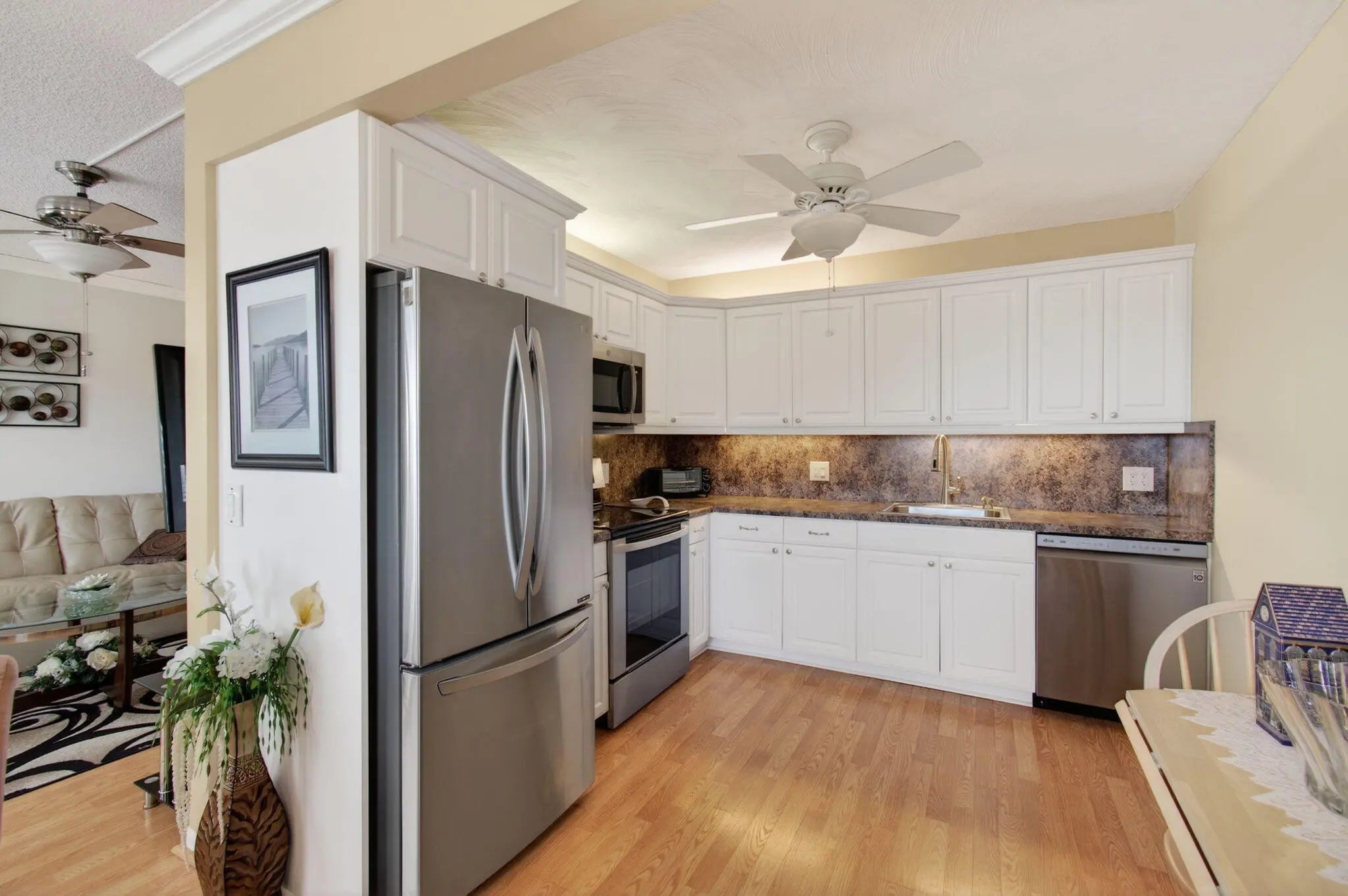 CENTURY VILLAGE--ACTIVE ADULT COMMUNITY. LOCATION! LOCATION! LOCATION! CLOSE TO THE GATE, THE CLUBHOUSE, AND THE PLACES OF WORSHIP. Welcome to 4082 Wolverton E, Boca Raton, Florida - an epitome of structured elegance and modern aesthetics. Upon entering this welcoming abode, you're immediately greeted by ubiquitous crown molding that accentuates the expansive living area, harmonious dining room, and well-curated kitchen. Immerse yourself in a warm ambience, highlighted by laminate flooring with a deeper tonal palette that echoes the allure of robustly grained wood-look laminate, admirably contrasted by plush carpeting in both bedrooms. The kitchen is a culinary aficionado's haven, celebrating style married with efficiency. Stainless steel appliances beautifully complement kitchen cabinets, providing an exquisite backdrop for polished countertops and a matching backsplash, creating an environment for preparing gastronomic delights. The master bedroom, your personal retreat, houses a generous walk-in closet ready to accommodate your wardrobe. An oversized window brings in ample natural light, enriching the space's visual narrative. The en-suite bathroom features a convenient yet commodious step-down shower, a high toilet, and a well-designed vanity. The second bedroom offers a gracious closet and direct patio access, creating a seamless indoor-outdoor flow. A second full bathroom mirrors the balanced aesthetics, featuring a shower-tub combination and a pocket door for a comfortable experience. As you navigate to the patio, you're gravitating towards the undeniable showstopper - a mesmerizing, unfiltered view of the lake, framed perfectly by the screened, glassed-in patio. Additional patio storage offers a practical solution for those seeking safekeeping. Fulfilling an impeccable union of precision, style, and tranquility, this dwelling stands as a testament to tasteful adult living at Century Village, promising an engaging, vibrant lifestyle in the heart of Wolverton E, Boca Raton, Florida. Rest assured, this locale offers nothing short of an immersive experience for its inhabitants, blending seamlessly with the rhythm of everyday life. Century Village residents enjoy access to world-class amenities. From 12 tennis and shuffleboard courts to pickleball and bocce ball courts and a well-equipped clubhouse featuring a fitness studio and social spaces, there's always a touch of the extraordinary to elevate your lifestyle. Enjoy long walks around the premises, dip into the communal swimming pool, or spend the day exploring nearby shopping centers, with easy access to major highways. Buy into a lifestyle centered on convenience, luxury, and activity. This highly motivated seller offers you the chance to experience the exclusive lifestyle of the Century Village community. NOTE THAT THERE ARE 2 SEPARATE MONTHLY HOA FEES. NO EXCEPTIONS. THAT GOES FOR THE ENTIRE COMMUNITY. Please take a look at the following. WOLVERTON MONTHLY HOA--$513.92.00 CEN-WEST MONTHLY HOA--$318.54 TOTAL TWO MONTHLY HOA FEES ARE $832.46 (WATER, BASIC CABLE, INTERNET & WiFi INCLUDED). AC2021, HWH2/22, KITCHEN FAUCET2023.