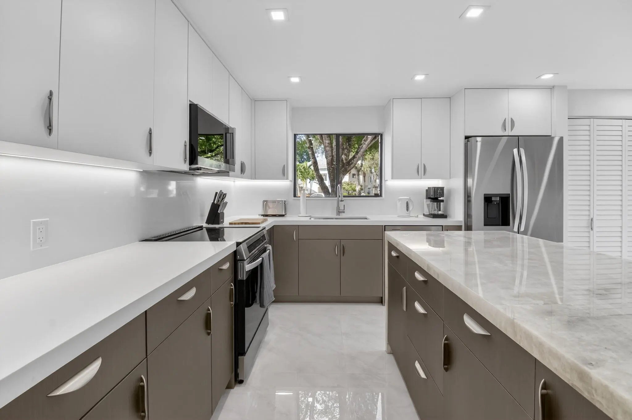 First Floor beautiful, totally renovated condo offering stunning views and a spacious open concept layout. The home Features two bedrooms, 2 baths and a Den. There is plenty of room to live and work comfortably. The home features a modern kitchen with a large center island and custom cabinetry for all your storage needs. Gleneagles Country Club is All Ages with all world class social and sports amenities, including two 18 hole golf courses, 19 har tru night lit courts, 3 restaurants, and sports amenities, including a state-of-the-art fitness center and spa.