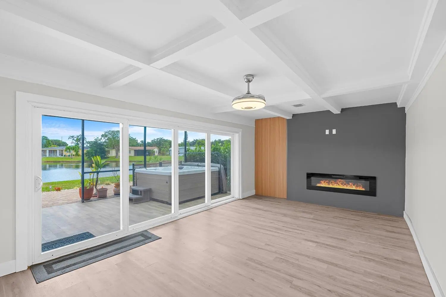 WATERFRONT - RENOVATED Home with private back yard, large patio, private Hot Tub Spa NS new Impact windows. Wake up to peaceful lake views and enjoy your backyard privacy in this recently renovated, single-story waterfront home. The split bedroom layout offers two spacious primary suites with en-suite baths on opposite sides of the home, ideal for a home office or guests. The home is move-in ready with impact hurricane windows, bright open kitchen with stainless steel appliances, modern family room with a fireplace. Relax on the large private patio with hot tub spa overlooking the water. This is an exceptional alternative to condo living, PET FRIENDLY, low HOA, community pool, fitness center, located just minutes to Atlantic Ave restaurants and the beach. Some photos virtually staged. Enjoy peaceful lake views, exceptional privacy, and effortless single-story living in this fully renovated waterfront home located in Delray Beach's highly sought-after Coco Wood Lakes, an established 55+ active adult community of single-family homes with no mandatory memberships and low monthly HOA fees. This thoughtfully designed residence offers a split-bedroom layout with two private primary suites, each with its own full en-suite bathroom, positioned on opposite sides of the home for maximum privacy - perfect for hosting guests, or creating a dedicated home office or retreat space. Renovated in 2023, the home is truly move-in ready, featuring impact-rated windows throughout, a bright white kitchen with stainless KitchenAid appliances, ample counter seating, and a modern, open-concept feel designed for comfortable everyday living and entertaining. Step outside to a large private patio with hot tub spa, overlooking tranquil water views and a generous backyard - an ideal setting to relax, entertain, or simply enjoy Florida's indoor-outdoor lifestyle. Unlike condo living, this home offers no shared walls, no elevators, and true backyard space, providing privacy that is increasingly hard to find in active adult communities. Additional highlights include a 2017 roof, tankless water heater (2023), open enlarged floorplan with impact hurricane windows (2023), attached garage, pet-friendly living with no weight or breed restrictions, and a low HOA that enhances lifestyle without overregulation. Coco Wood Lakes is known for its welcoming, social atmosphere and excellent amenities. The community clubhouse features a well-equipped fitness center, large theater for entertainment and meetings, card room, and game room with billiards and ping pong. Residents enjoy a spacious community pool with ample seating and shaded areas, ideal for relaxing and socializing, along with a newly updated hot tub and spa completed in 2025. Sidewalk-lined streets, pickleball, and organized activities support an active yet relaxed lifestyle. Rental flexibility is permitted with no waiting period, allowing up to two leases per year with a minimum term of 90 days, offering future flexibility for seasonal residents. Community guidelines require at least one permanent occupant to be 55 years of age or older, with no full-time residents under 18. Ideally located just minutes from Atlantic Avenue dining, shopping, medical facilities, and Delray Beach's sandy coastline. This home delivers the perfect balance of waterfront serenity, privacy, convenience, and low-maintenance living all within one of Delray Beach's most desirable 55+ communities. Some photos virtually staged.