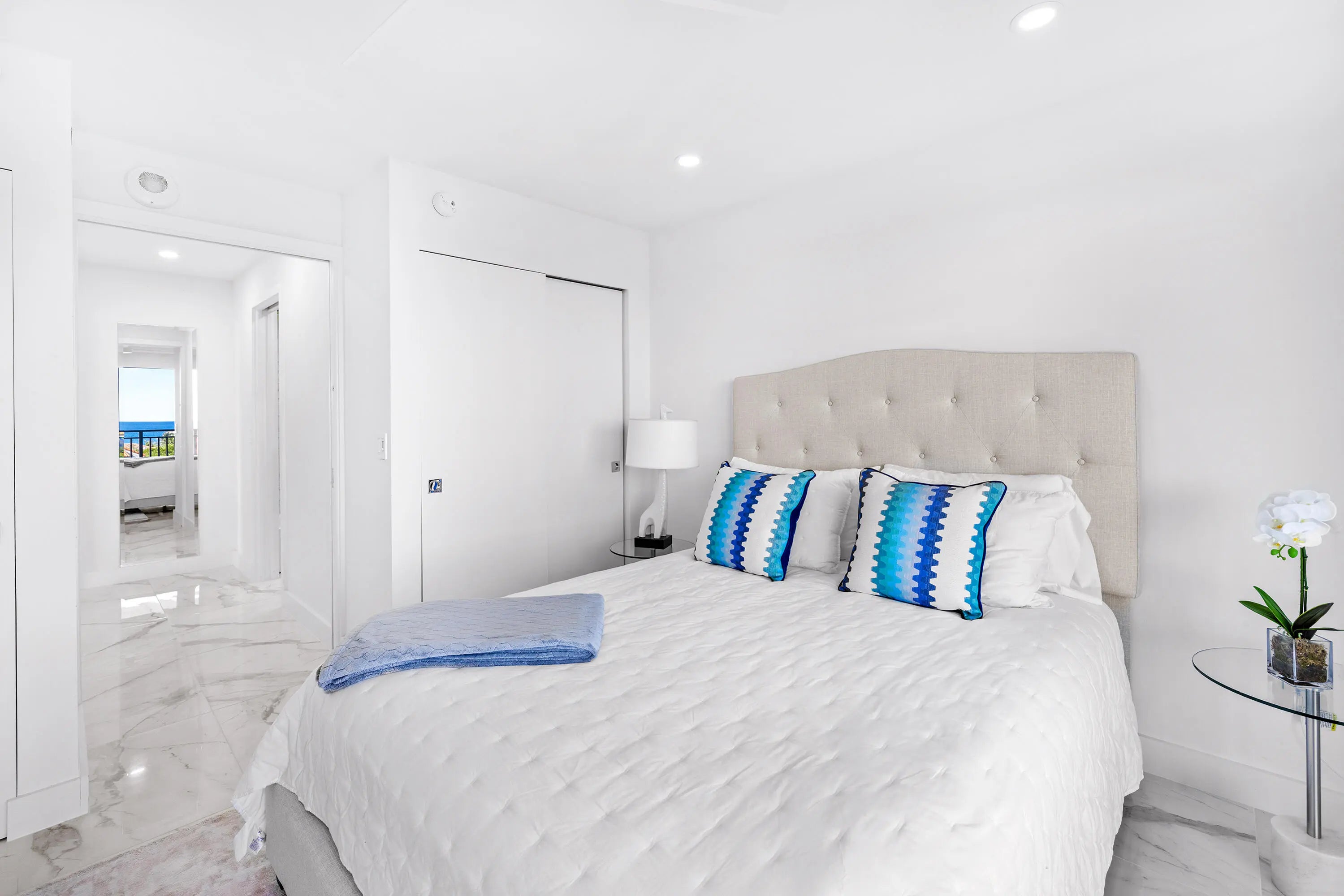 Welcome to effortless coastal elegance in this exceptional 3-bedroom, 2.5-bath waterfront condo in gorgeous Highland Beach, Florida. Completely renovated and reconfigured in 2022—down to the studs, this residence offers a thoughtfully redesigned floor plan that is both highly functional and strikingly contemporary. This desirable corner condo is flooded with natural light and showcases breathtaking views of both the Intracoastal Waterway and the Atlantic Ocean. Enjoy peace of mind with hurricane impact windows and sliders and the convenience of deeded beach access just steps away. The gourmet kitchen is a showpiece, featuring sleek quartz countertops, all-new high-end appliances, and a clean, modern aesthetic perfect for entertaining. (continued in more) Skim-coated ceilings enhance the contemporary feel, while highest-quality porcelain flooring flows seamlessly throughout the home. The European custom-designed bathrooms deliver spa-like sophistication. Interior doors have been replaced, with the addition of multiple pocket doors to maximize space and functionality. Handcrafted contemporary built-ins create a stylish office/third bedroom combination, ideal for today's flexible lifestyle. Located in a waterfront community offering amenities for relaxed coastal living, this move-in-ready condo is a rare opportunity to own a fully transformed residence in one of South Florida's most desirable beachfront towns. Luxury. Views. Design. Location. This Highland Beach condo truly has it all.