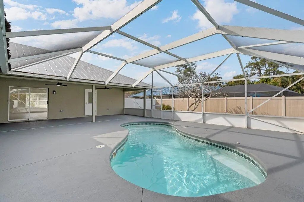 Beautifully renovated 4-bedroom, 2-bath pool home in desirable Holiday Pines! This move-in-ready property features a metal roof (2012), brand-new AC (2024), and water heater (2019) for peace of mind. The updated kitchen offers crisp white cabinets, granite countertops, and stainless steel appliances. Both bathrooms have been tastefully remodeled with new vanities, tile, and modern fixtures. Enjoy new luxury flooring throughout, a screened-in pool perfect for relaxing or entertaining, and a large yard with plenty of space to enjoy the Florida lifestyle. A must-see home!