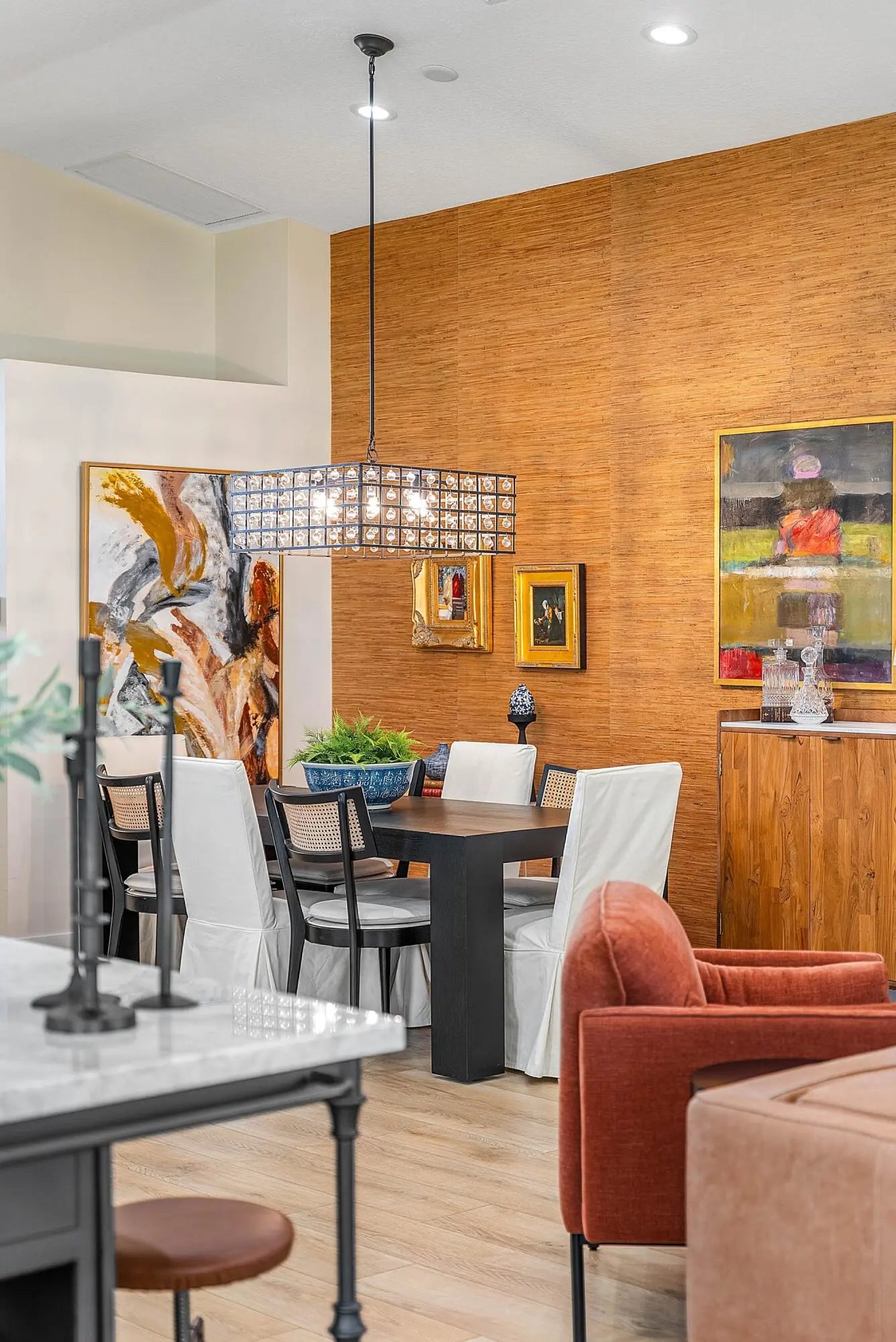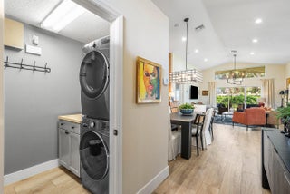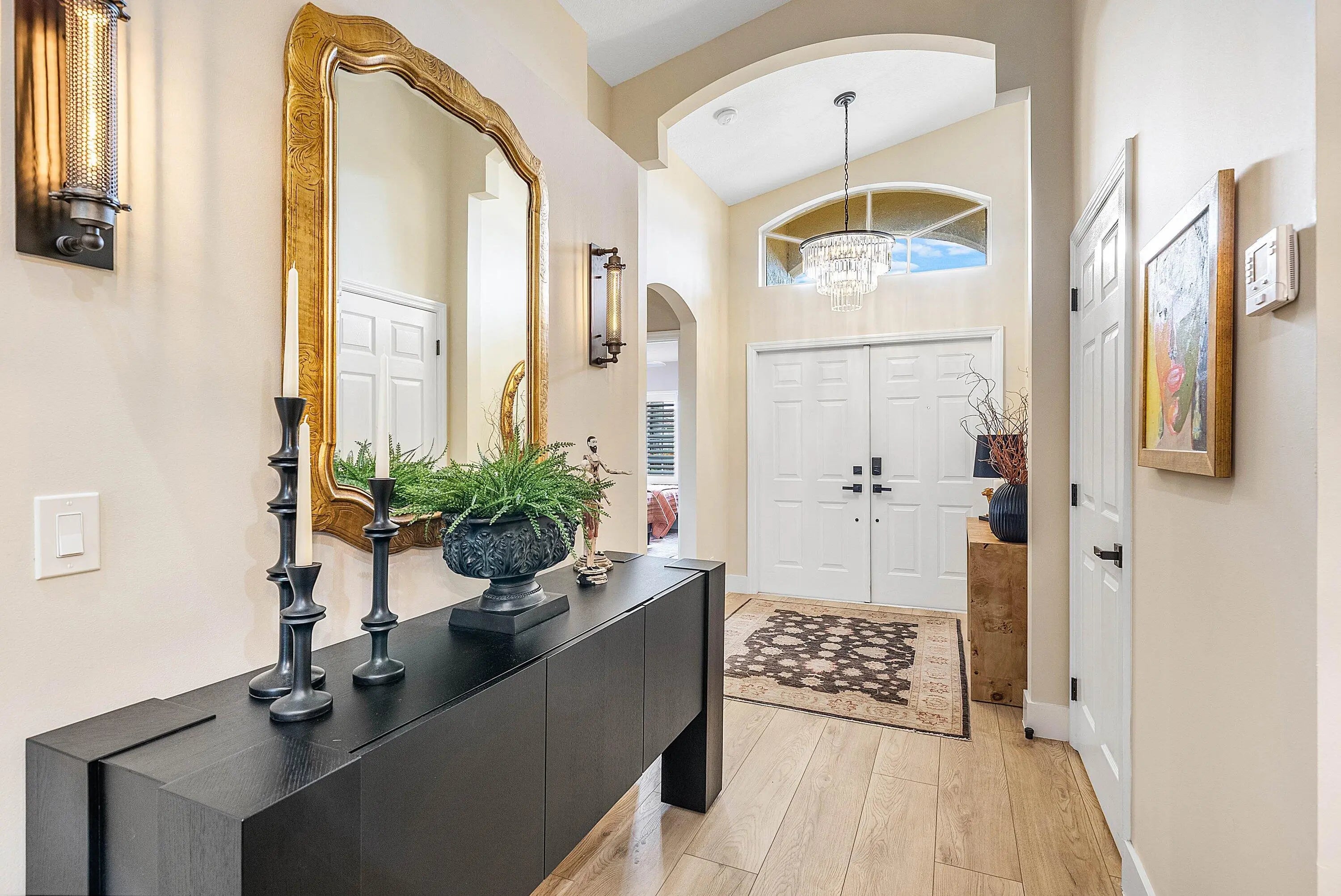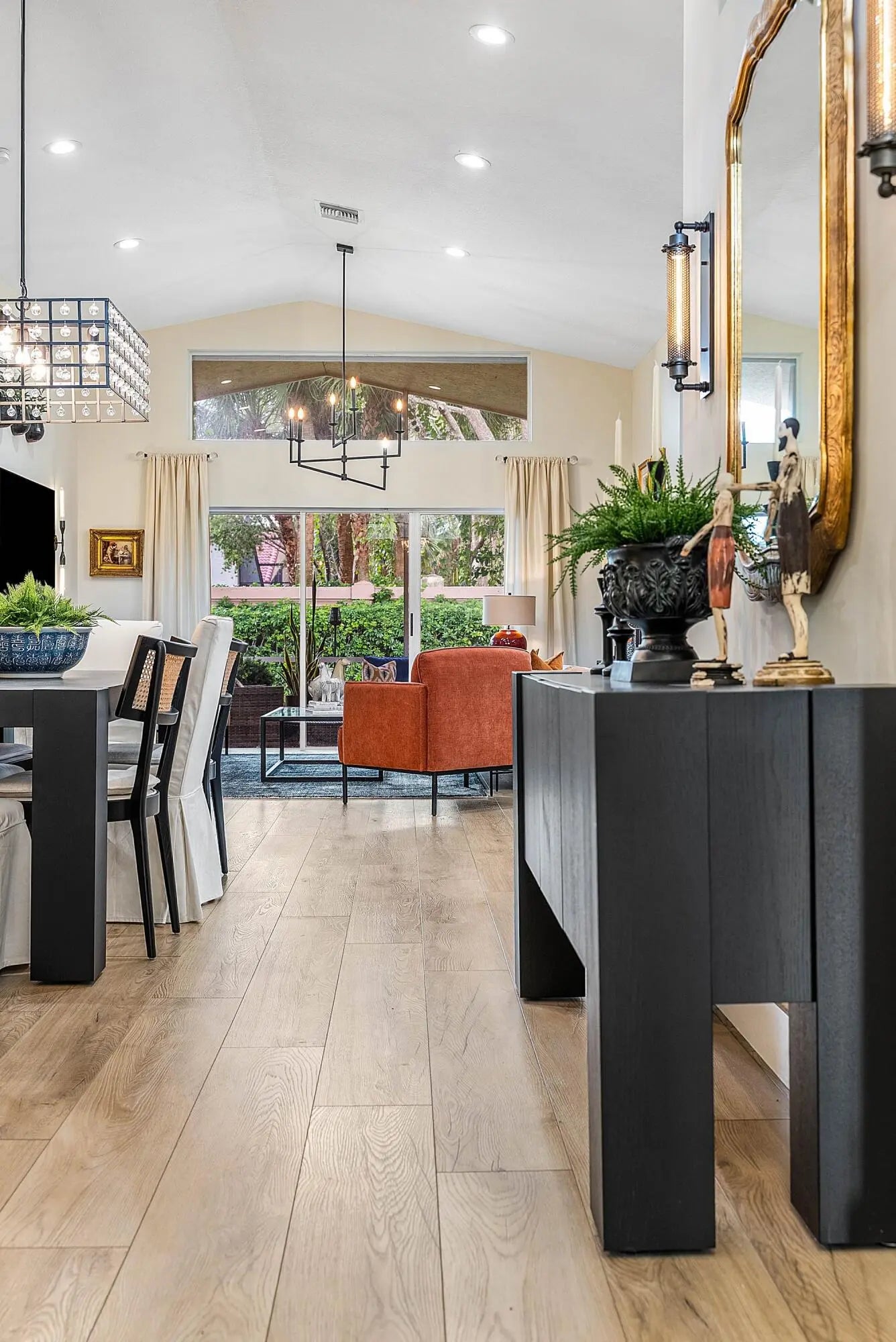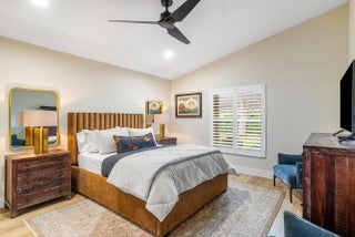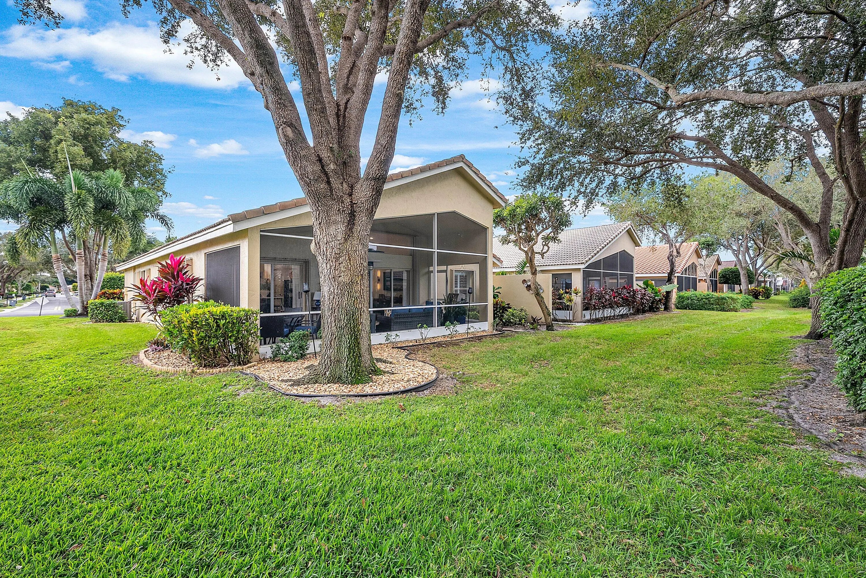 Welcome to 6847 Viale Elizabeth, an exceptionally renovated, magazine worthy single family home in Villa Borghese, an active 55+ community with a 24/7 manned guard gate. This home features 3 bedrooms or 2 bedrooms plus a den/home office and 2 baths, with modern design finishes and comfort. The entry sets the tone: wide plank wood like floors, designer lighting from Pottery Barn, Arhaus and RH, fresh paint and an expansive sightline that draws the eye directly to the private, oak tree lined backyard, with beautiful side easement . The kitchen is a masterpiece— a free standing marble and iron island, sleek black modern soft close cabinetry, induction stove top, KitchenAid SS appliances, all open concept. New AC in 2024 with 10 year warranty, private laundry with LG washer and dryer. The primary bedroom is oversized and features an en suite with roman tub and double sinks. Plantation shutters throughout, for an elegant touch. Further, new door and hinge hardware throughout! Every window on the exterior has accordion hurricane protection shutters. Enjoy this property this season relaxing on the private screened in lanai with TV and fan, and outdoor side space to add an herb garden or BBQ grille. This property is one of a kind! Monthly HOA fee includes AT&T Direct TV plus internet, landline, monitored ADT home security system, lawn maintenance, pressure wash roof and driveway. The community offers a beautiful and active clubhouse, full-time on-site management, a resort style pool, fitness center, billiards, library, bocce, pickleball and tennis courts.