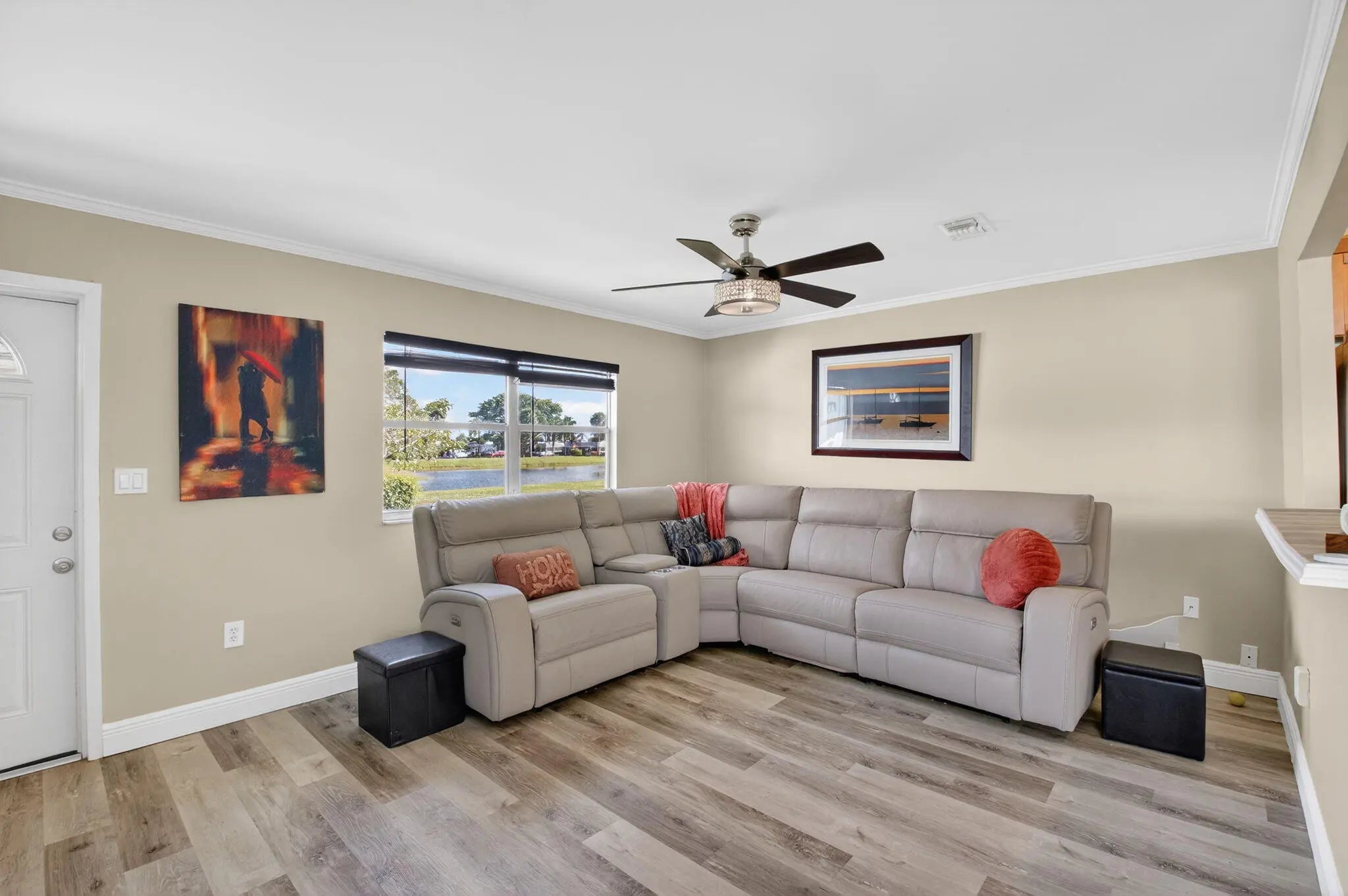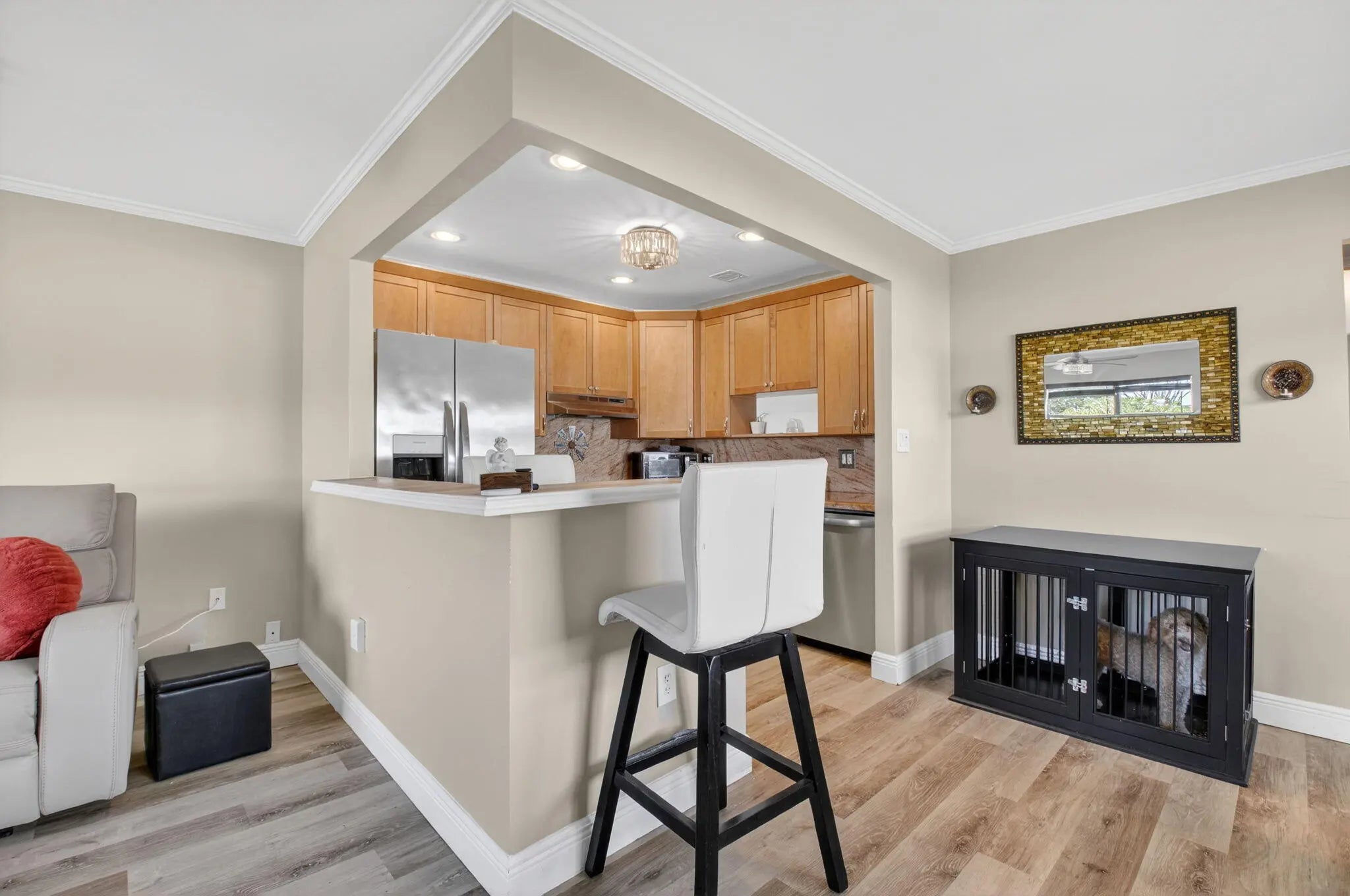 Light-filled corner condo-villa offering one of the most inviting villa-style opportunities in the sought-after Valencia section of Kings Point. Seller offering $1,000 toward buyer closing costs. Windows on three sides create a bright, airy feel throughout. This 1-bedroom, 1.5-bath residence features an updated kitchen with island, updated baths, new laminate flooring, updated lighting and doors, and an enclosed Florida room with porcelain flooring and a full-size washer and dryer. A/C replaced April 2021 with air purifier. Furnishings negotiable. Residents enjoy extensive community amenities and are minutes to shopping, dining, downtown Delray Beach, and the ocean.