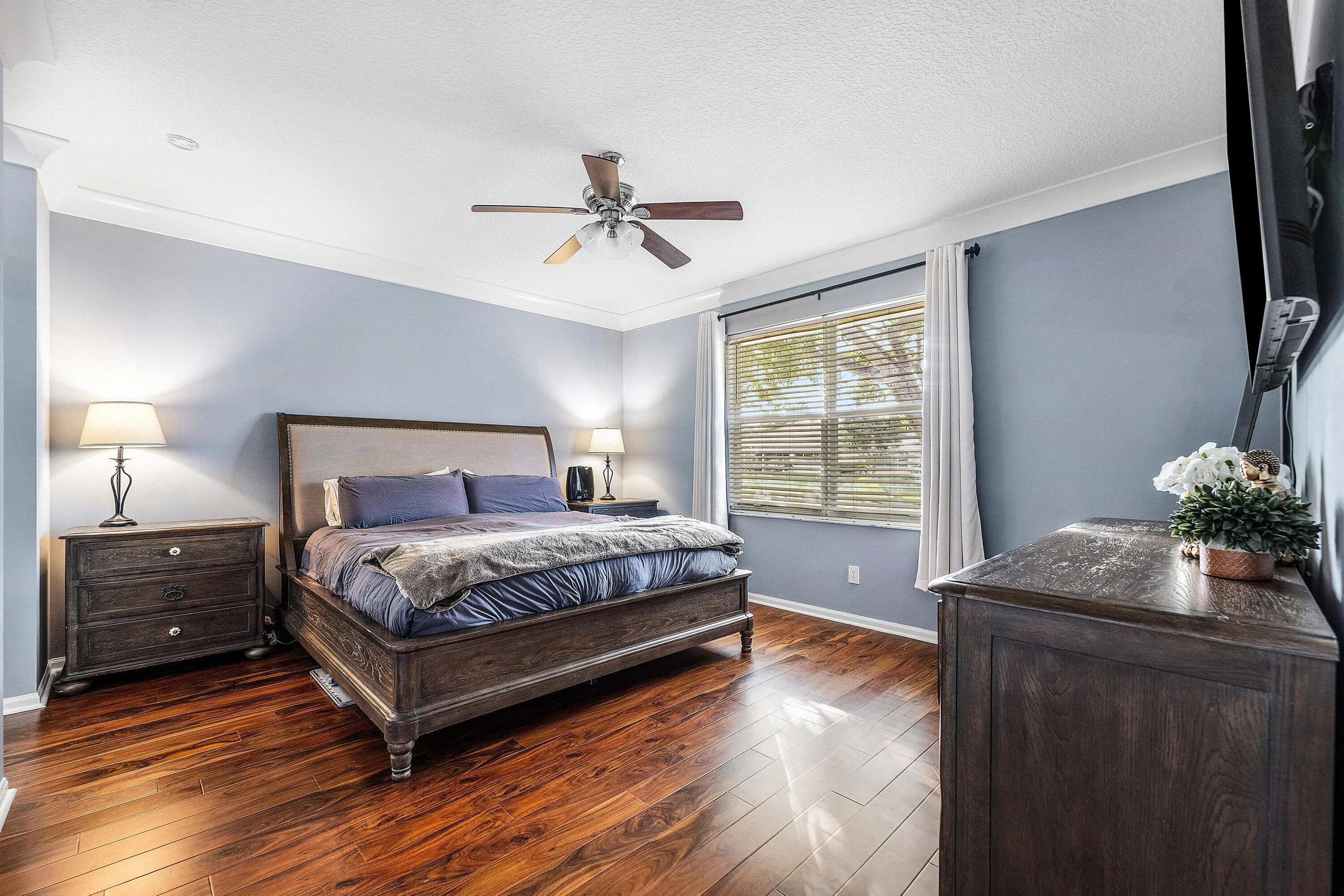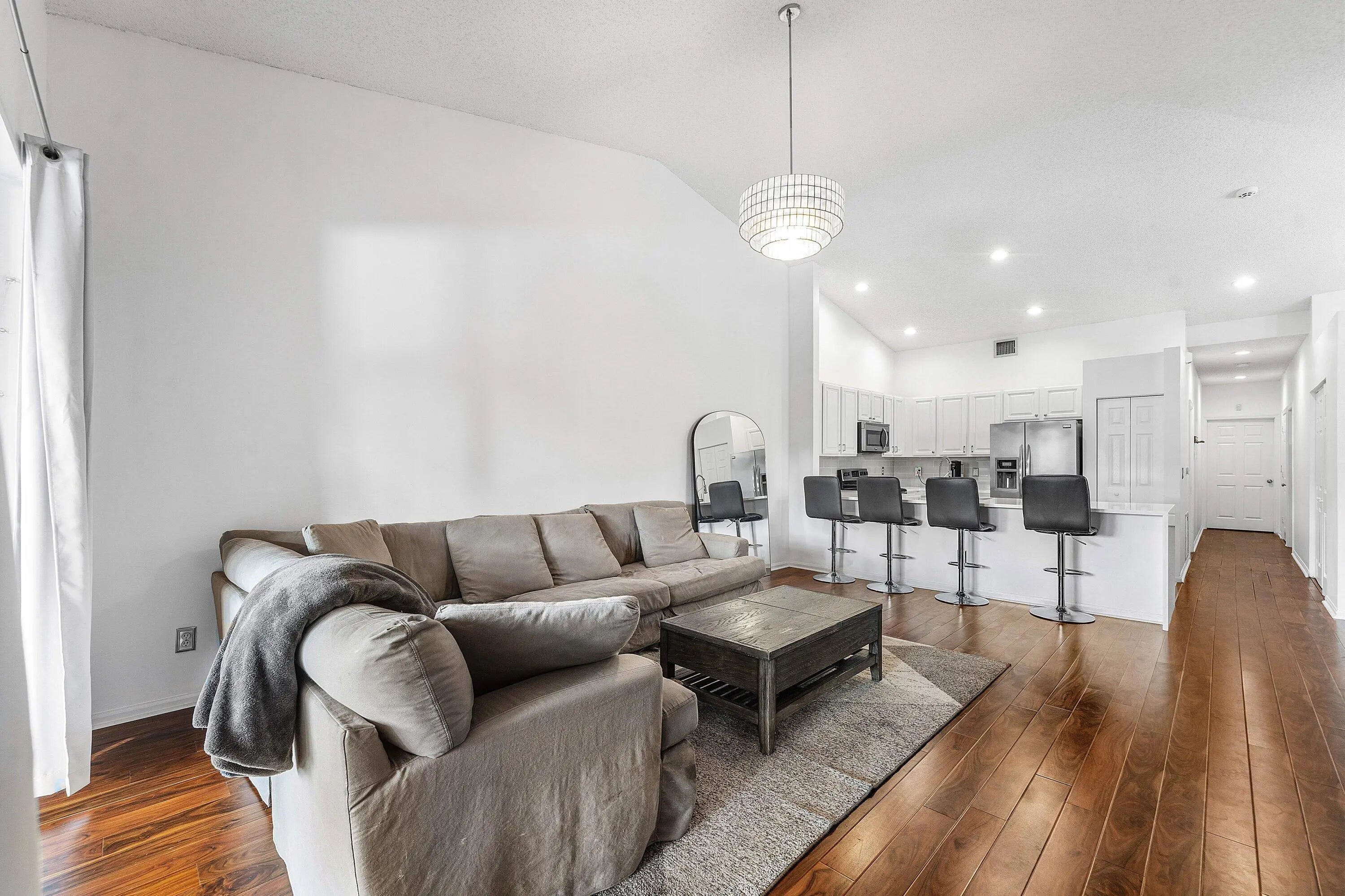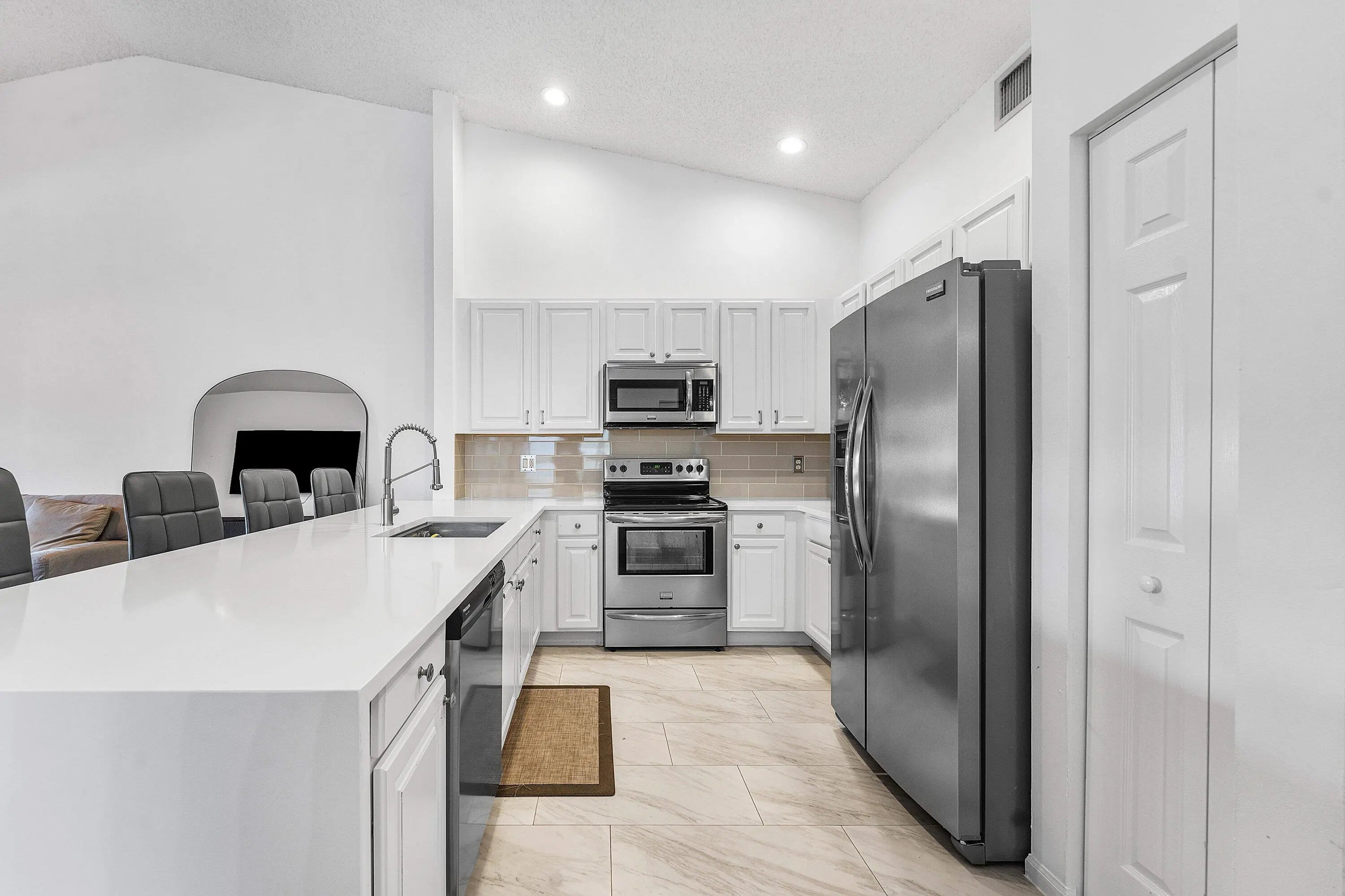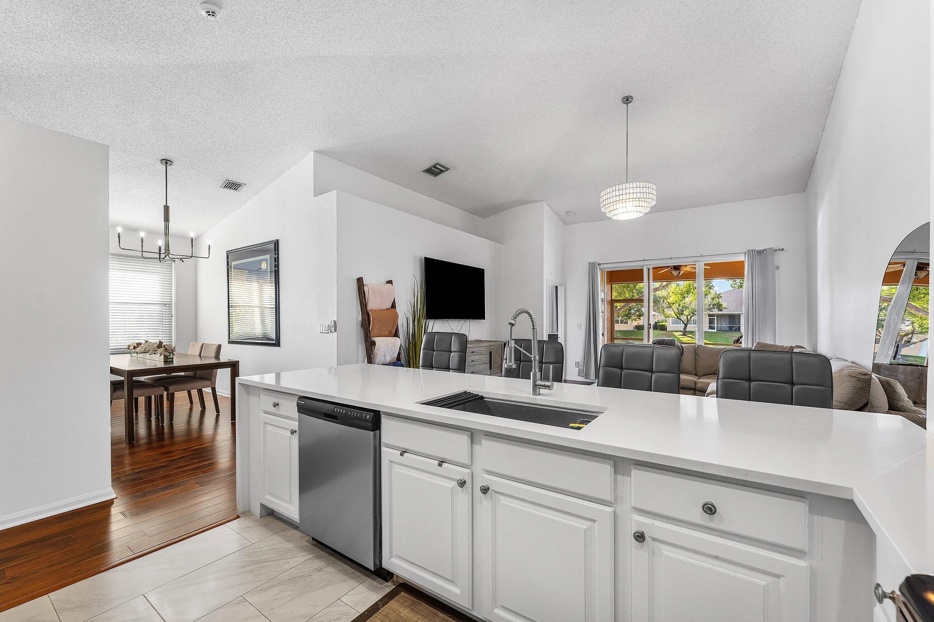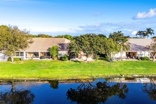 Welcome home to this beautifully updated three-bedroom, two-bath waterfront villa with a one-car garage, located in the desirable gated community of Coral Trace. The thoughtfully designed split floor plan offers both privacy and functionality. Just a five-minute drive from vibrant downtown Delray Beach and its stunning beaches, this home is also within walking distance to Atlantic High School. Enjoy serene lake views, low HOA fees, and the peace of mind that comes with a well-maintained neighborhood. As you enter, you'll immediately notice the refined finishes throughout, including dark wood-look laminate flooring in the main living areas and oversized tile laid in the foyer and kitchen. The home features a fully renovated kitchen, vaulted cathedral ceilings, recessed lighting, and a bright, open feel enhanced by abundant natural light. The updated kitchen is a standout, showcasing expansive quartz peninsula countertops with a waterfall edge and bar-top seating, solid wood shaker cabinetry, a dedicated pantry, an oversized Kraus sink with disposal, gray subway tile backsplash, and stainless steel appliances. A conveniently located laundry closet is situated just off the kitchen. The primary bedroom is generously sized and features wood-look laminate flooring that flows seamlessly from the main living area, updated trim, and large windows with peaceful lake views. The spacious walk-in closet includes custom built-ins. The primary bathroom is updated with quartz countertops, a solid wood vanity with dual sinks, modern hardware and lighting, an oversized Roman soaking tub, and a fully tiled floor-to-ceiling walk-in shower with a framed glass door. The open-concept living and dining areas flow effortlessly from the kitchen and feature updated fixtures, trim, cathedral vaulted ceilings, and decorative niche shelving, making the space ideal for both everyday living and entertaining. Both secondary bedrooms are ample in size and offer wood-look laminate flooring, updated trim, generous closet space, and plenty of natural light. A well-appointed second bathroom serves guests comfortably. The low HOA fee includes landscaping, common area maintenance, cable and internet, trash removal, and upkeep of the community amenities, which include a pool and spa, tennis courts, fitness center, billiards room, library, and a fenced playground. Coral Trace offers a quiet, well-maintained residential atmosphere while remaining conveniently close to downtown Delray Beach and beautiful beaches, just a five-minute drive away. Schedule your private showing today!