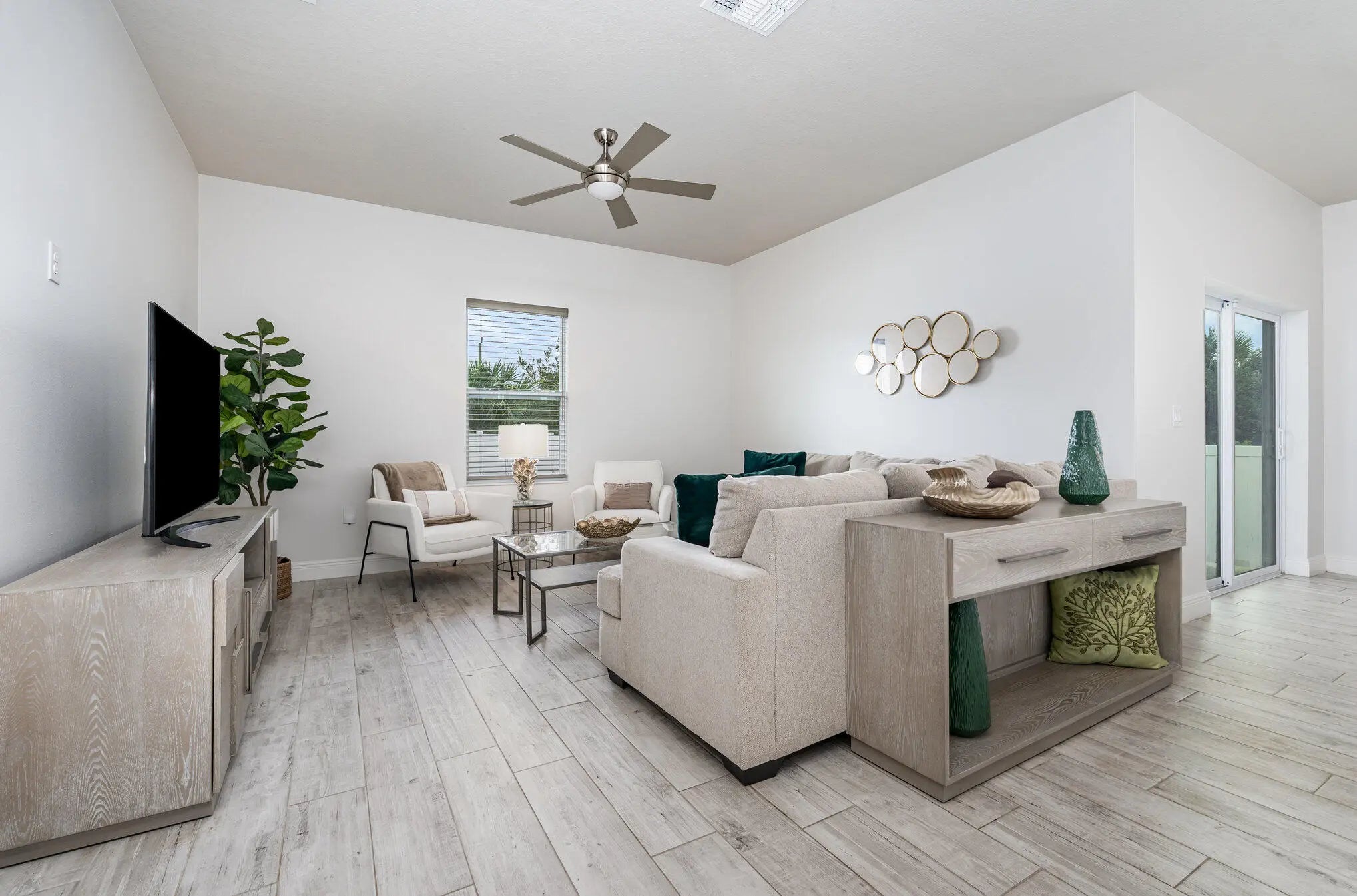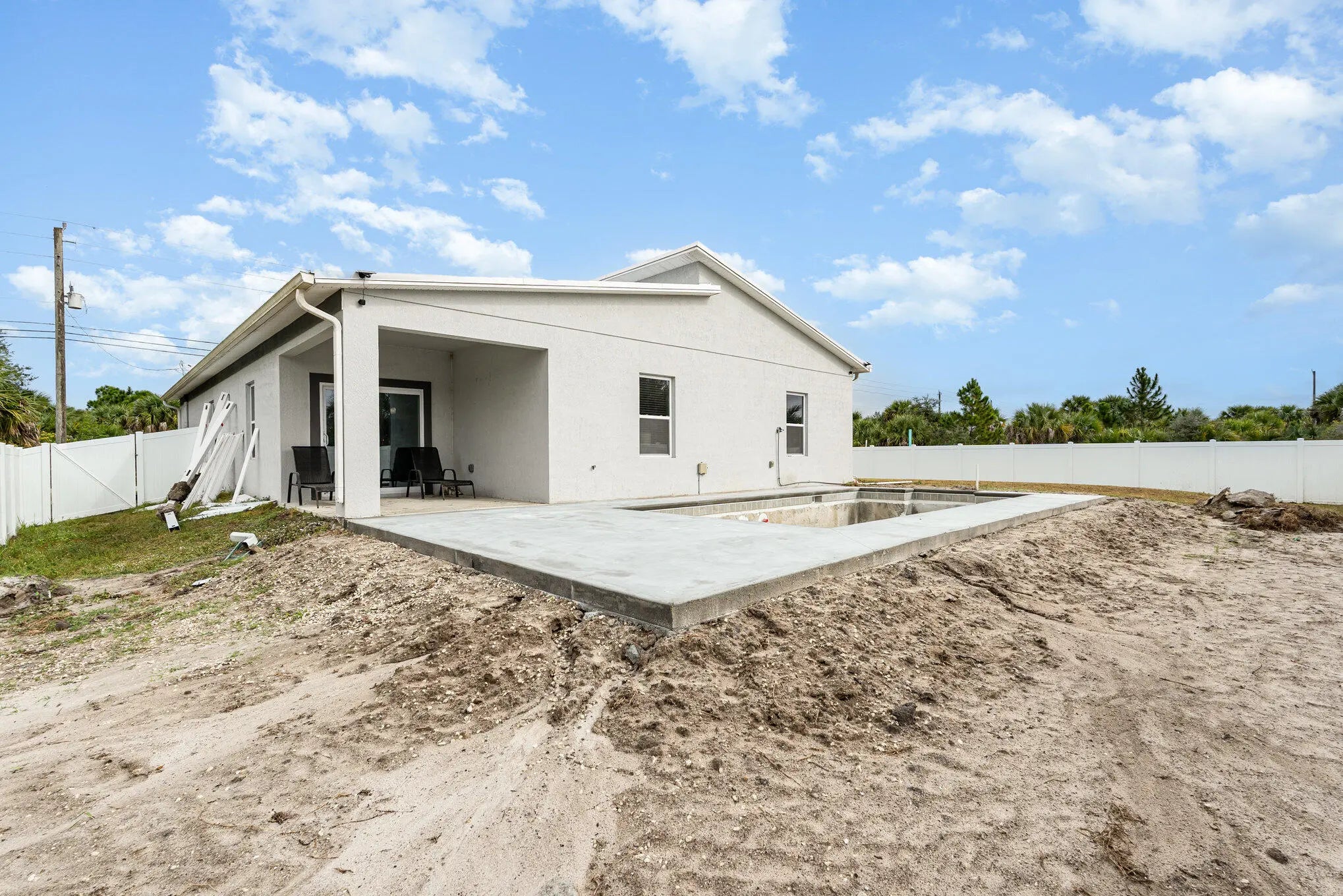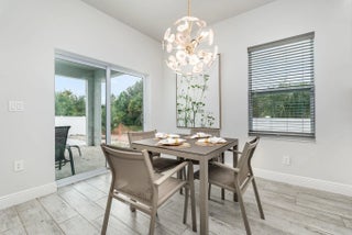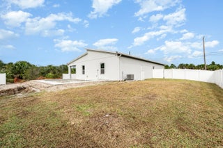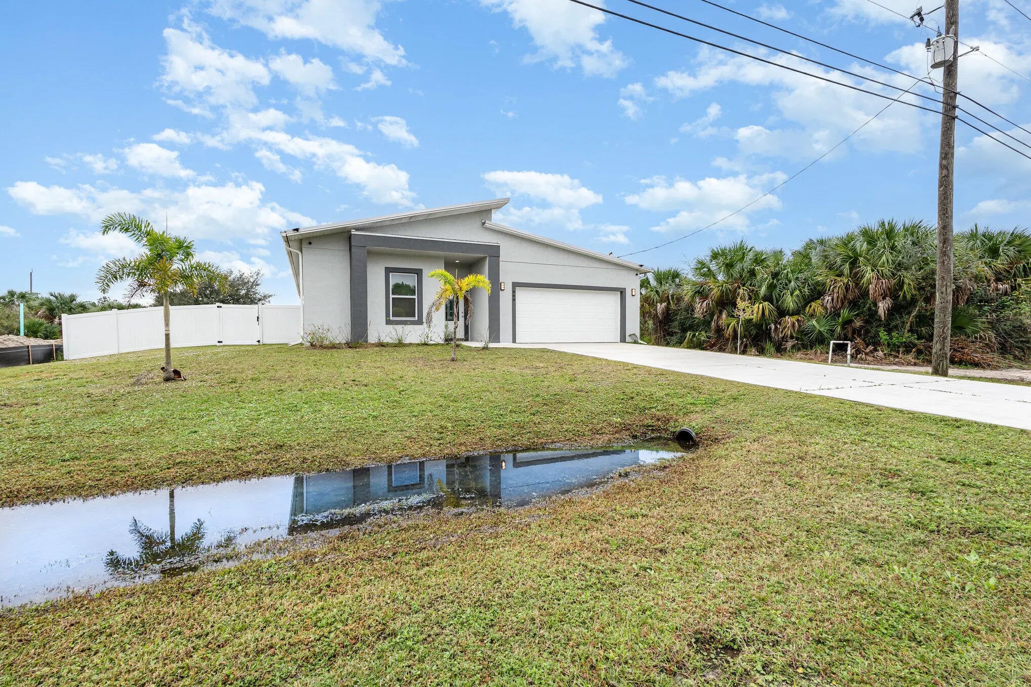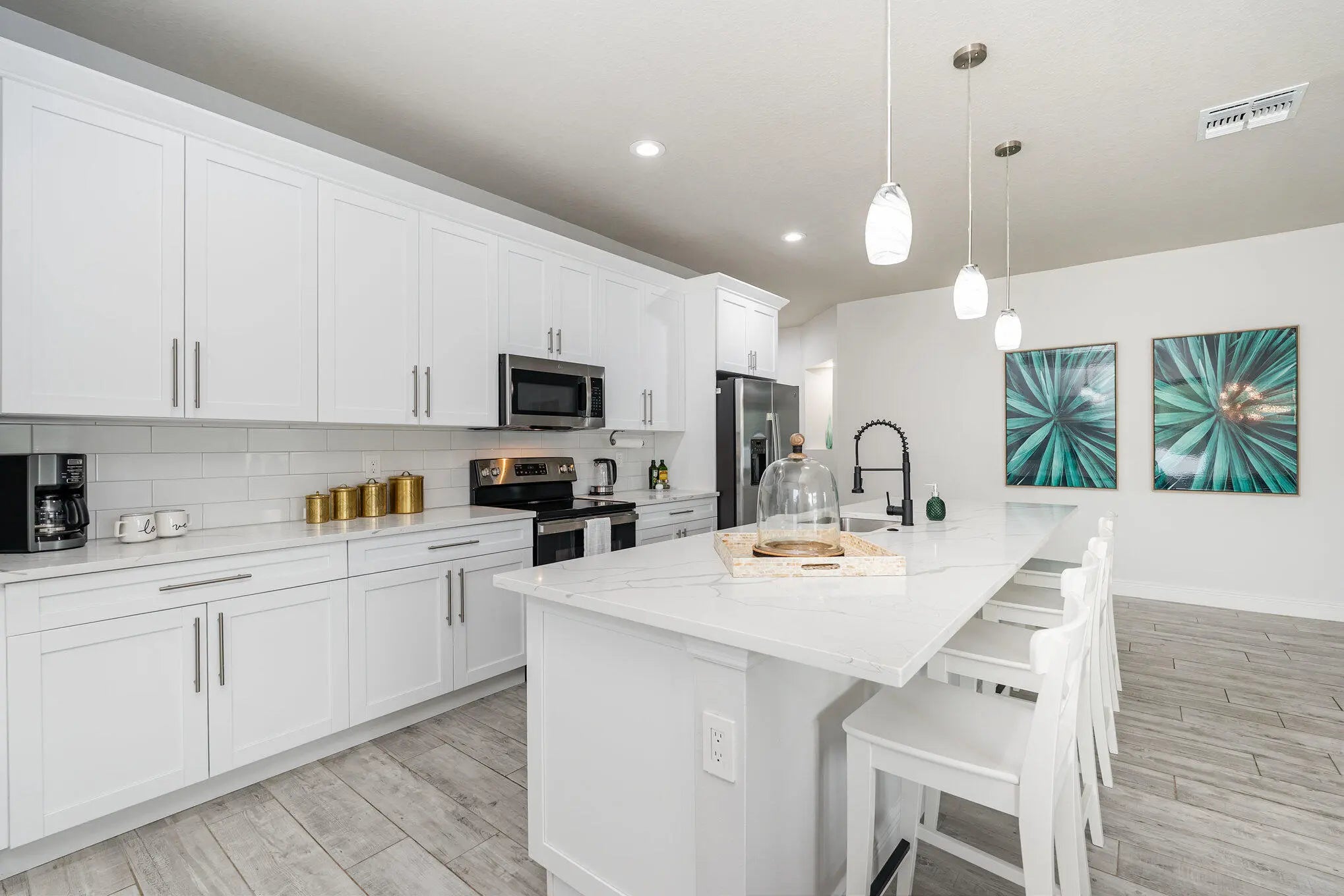 Beautiful 4-bedroom, 2-bath modern home featuring high-end finishes and an open-concept floor plan. Interior offers 10-foot ceilings and wood-plank tile flooring throughout. The kitchen includes white cabinetry with wine rack, quartz countertops, and stainless steel appliances, with pendant and recessed lighting providing a bright, open feel. The primary suite features a large walk-in shower with glass enclosure and dual shower heads, double sinks, and ample counter space. Both bathrooms include custom vanities and quartz countertops. Spacious walk-in closet with access from both the bedroom and bathroom. Additional features include impact windows and doors, new metal roof, new A/C, and new vinyl fence with gated access. Property shows like a model home.