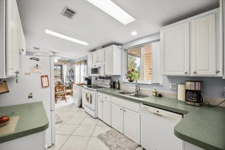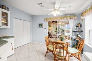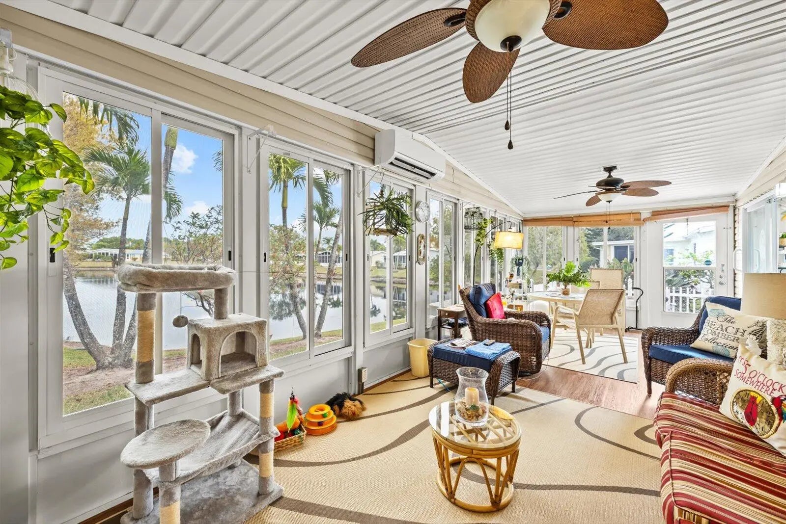 Welcome to Savanna Club, a sought-after 55+ amenity-packed community where resort-style living meets everyday comfort. This popular Coral Reef floor plan offers 2 BR's, 2 BA's, plus a versatile den perfect for an office, hobby room, or guests. Enjoy serene lake views from the 27' enclosed glass porch with its own mini-split A/C, ideal for year-round relaxation. The home is fully furnished turnkey—just bring your suitcase. Features include acc. shutters, 2015 roof, 2023 A/C, cost-saving irrigation well, and laminate and tile flooring thru-out. Start your mornings on the open patio with sunrise views and coffee in hand or take a short walk to Savanna Club's pools, clubhouse, fitness center, golf, activities, restaurant and more! Land Lease Property