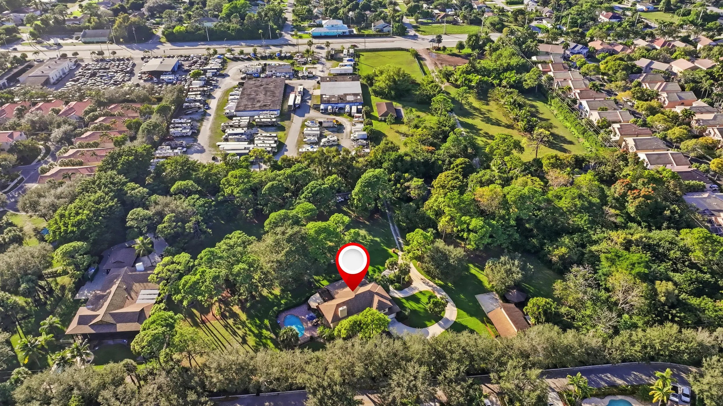 Situated on a rare 3.4-acre residential parcel in Delray Beach, this property offers privacy, space, and flexibility, minutes from the beach and downtown Atlantic Avenue. The single-family residence features 4 bedrooms and 3.5 bathrooms, 3,498 sq ft under air, real wood floors, a wood-burning fireplace, gas stove, dual primary suites (one on the first floor), office, loft, separate laundry room, and locking storage area. Interior systems include a central vacuum, water softener with reverse osmosis filtration, and full hurricane protection. Outdoor amenities include a pool, gazebo, covered patio with French doors, balcony, fruit trees, a fenced residential area, and a boat house with electric and water. No HOA. Future redevelopment potential for up to 17 single-family homes.