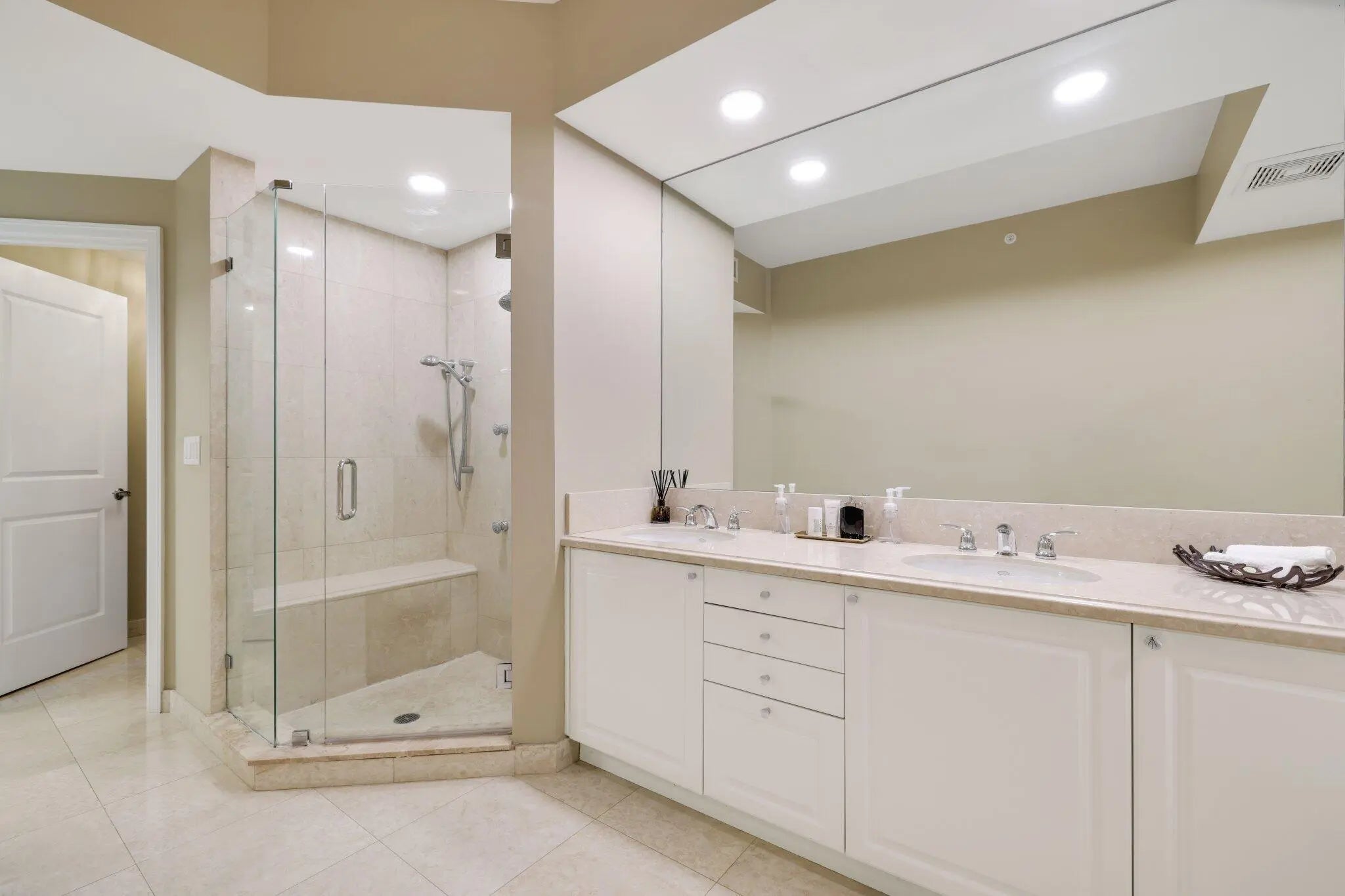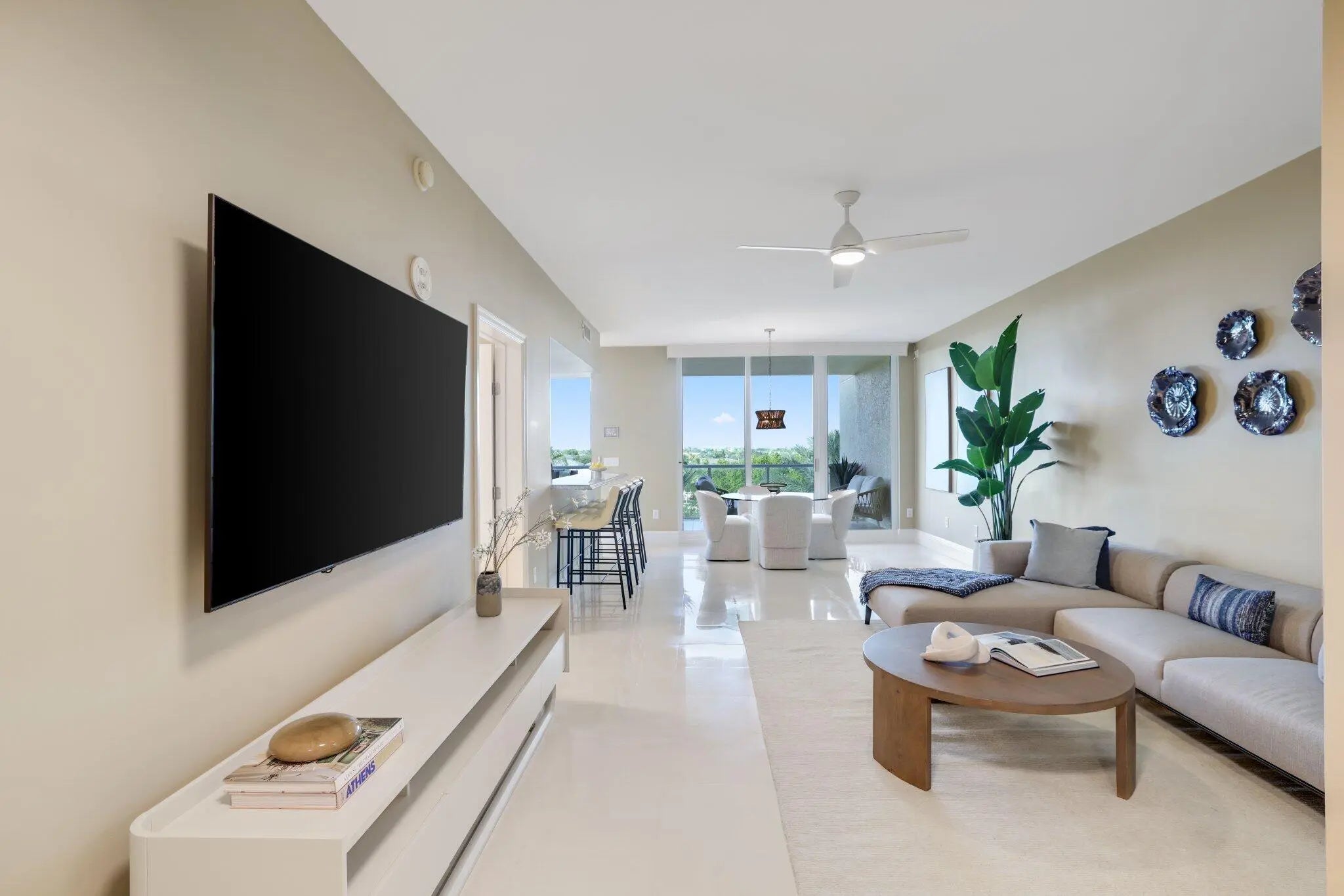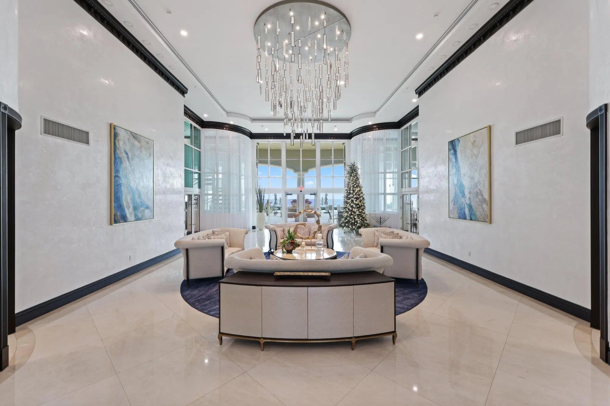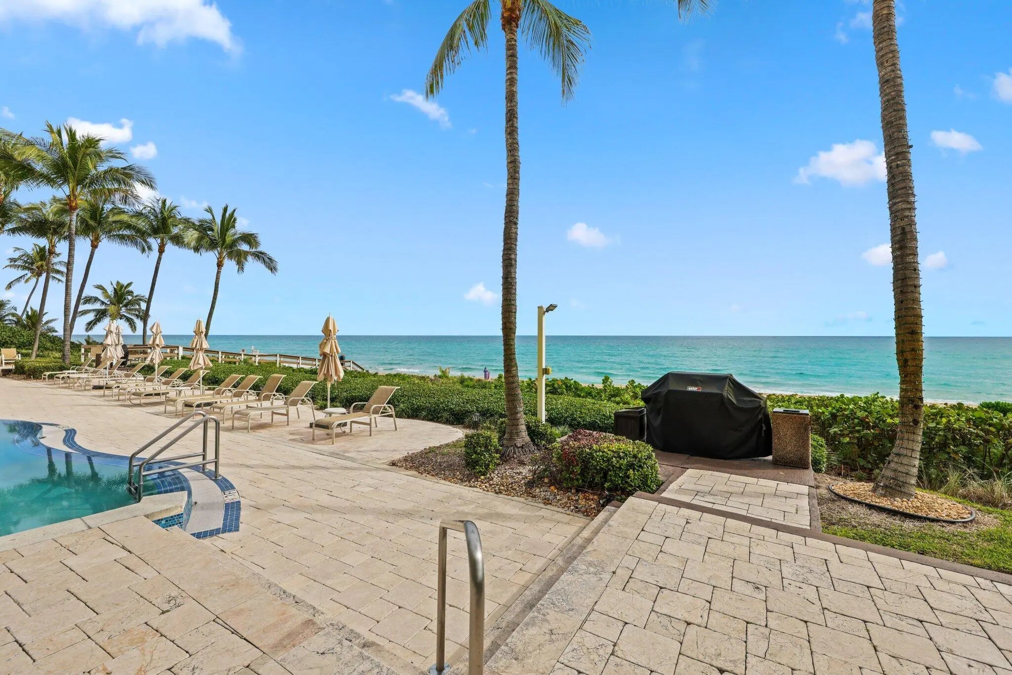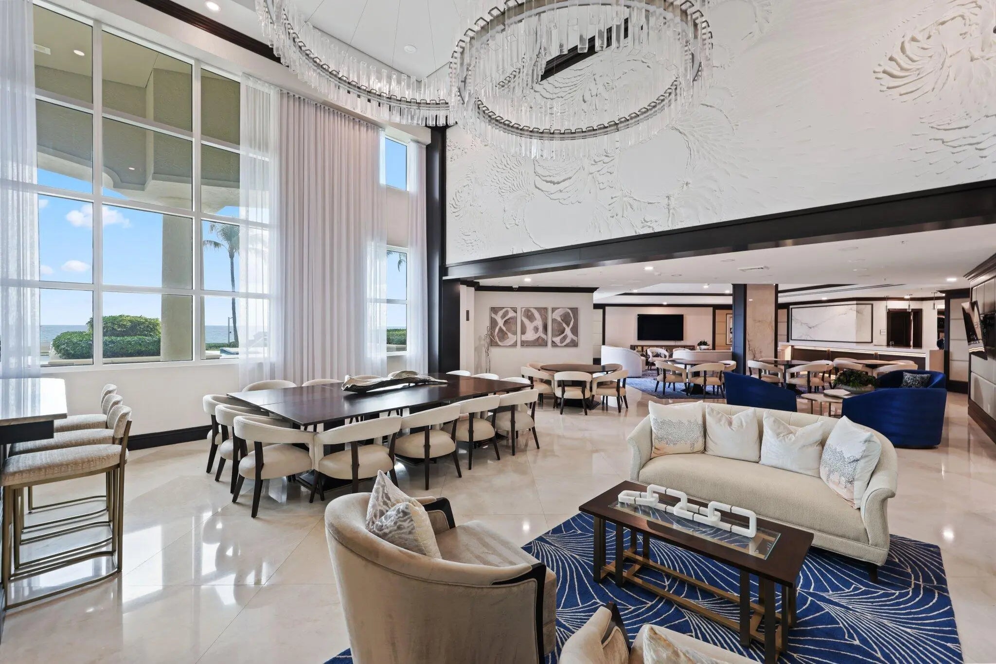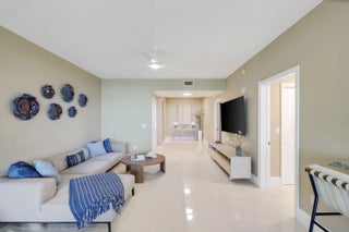 Experience refined coastal living at Ocean Grande, a boutique oceanfront condominium of just 74 private residences on the prestigious Hillsboro Mile. Unit 404 offers a thoughtfully designed layout with dual exposures—Intracoastal and sunset views, and direct Atlantic Ocean views. This spacious 2-bedroom plus den, 2.5-bath residence spans approximately 2,380 square feet and is accessed via a private elevator entry. The open, light-filled floor plan features 9-foot ceilings, marble flooring throughout, and floor-to-ceiling impact windows that enhance both natural light and privacy. Ocean Grande's resort-style amenities include full-service valet and concierge, a two-level fitness center overlooking the pool and ocean, club and business rooms, billiards room, an oceanfront pool, and more