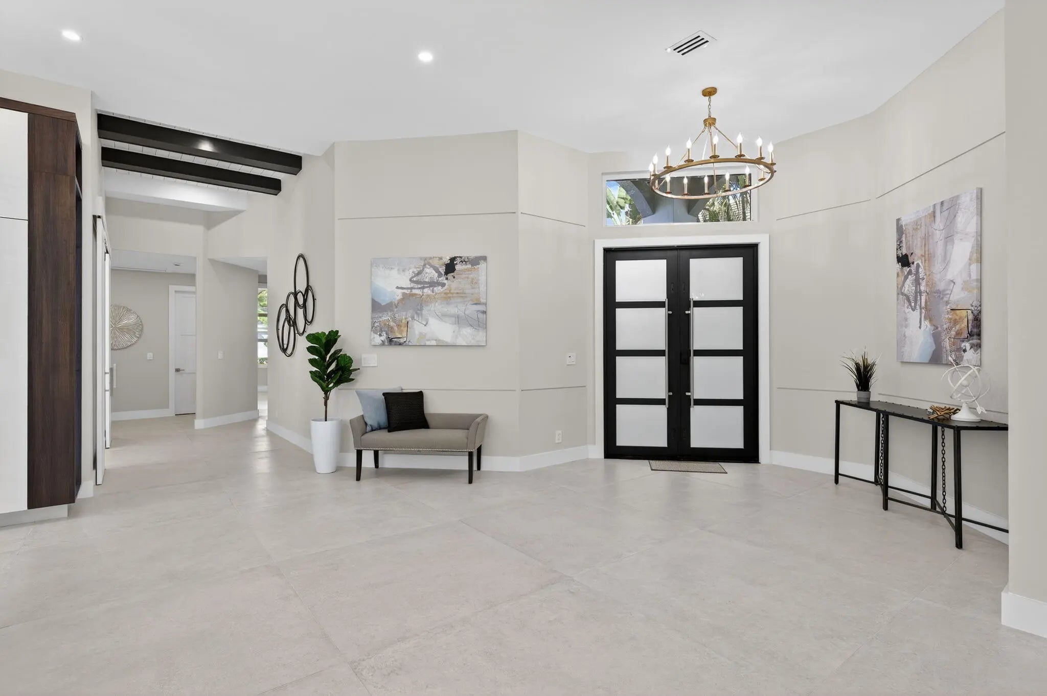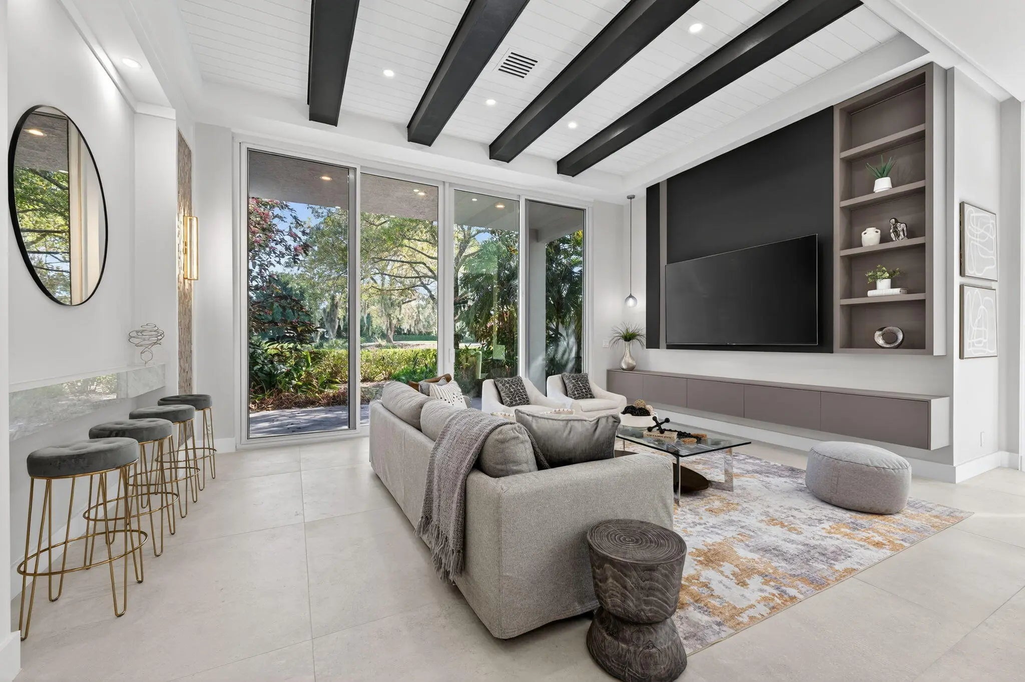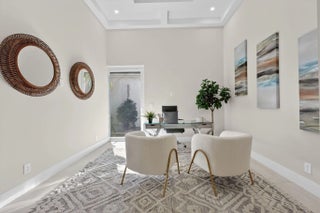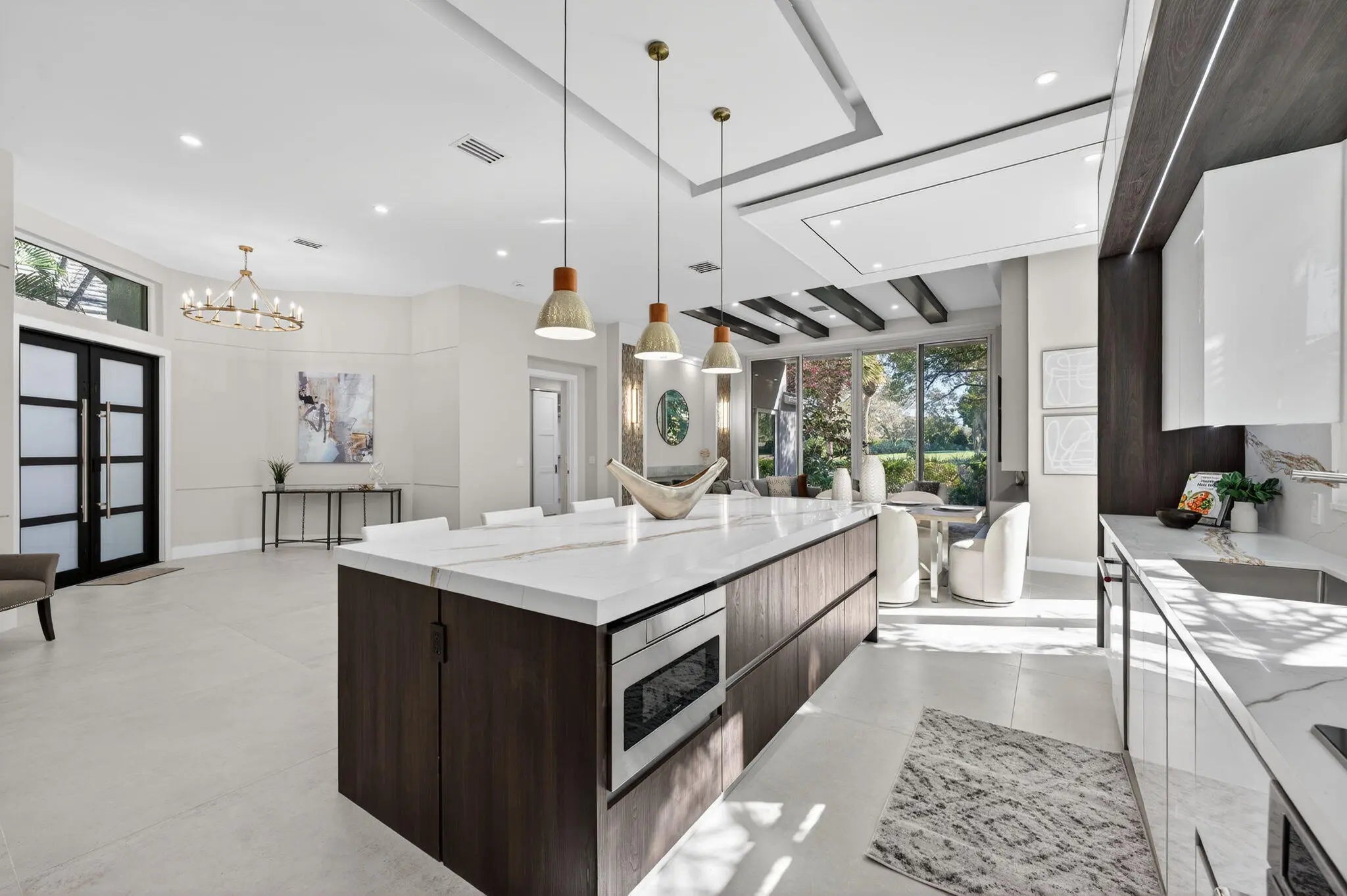 Fabulous, fully redesigned and updated home featuring 3 bedrooms, 3 bathrooms (all ensuite), plus a private office/den. This residence offers complete impact glass windows and doors, a full-house generator, and a quick-recovery hot water heater. Additional upgrades include a new roof with gutters. Enter through double glass doors into a spacious foyer that opens to a large Great Room. The kitchen showcases an oversized center island, abundant storage, brand-new stainless steel appliances, a microwave drawer, and elegant quartzite countertops. The family room features a custom built-in wall unit and 12-foot impact glass sliding doors that lead to an extended patio deck with stunning golf course views. This home features a partial golf membership.