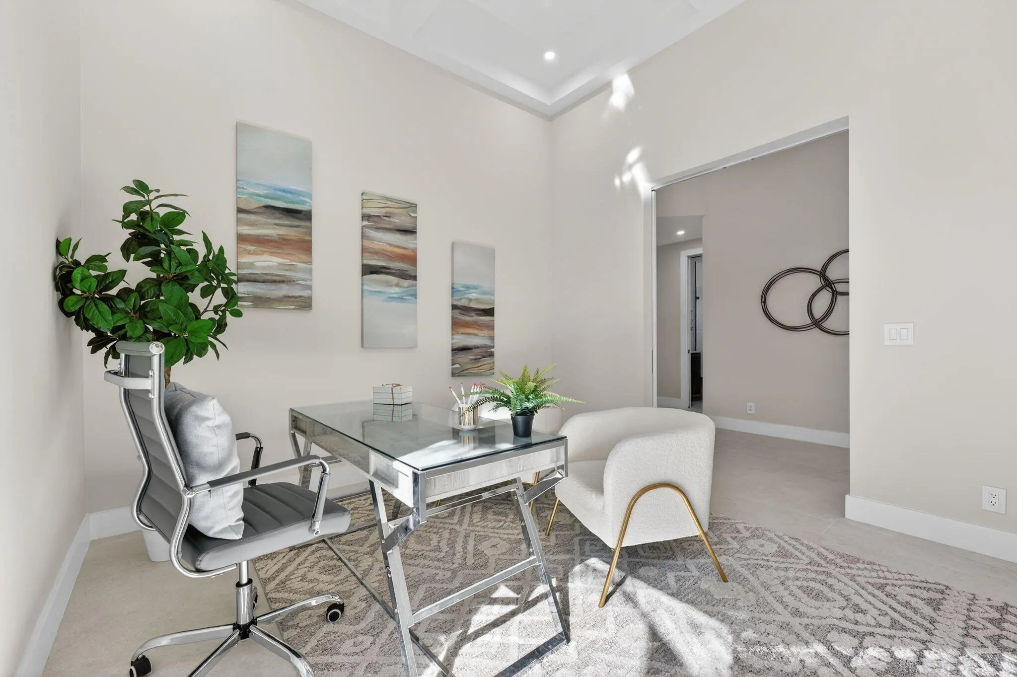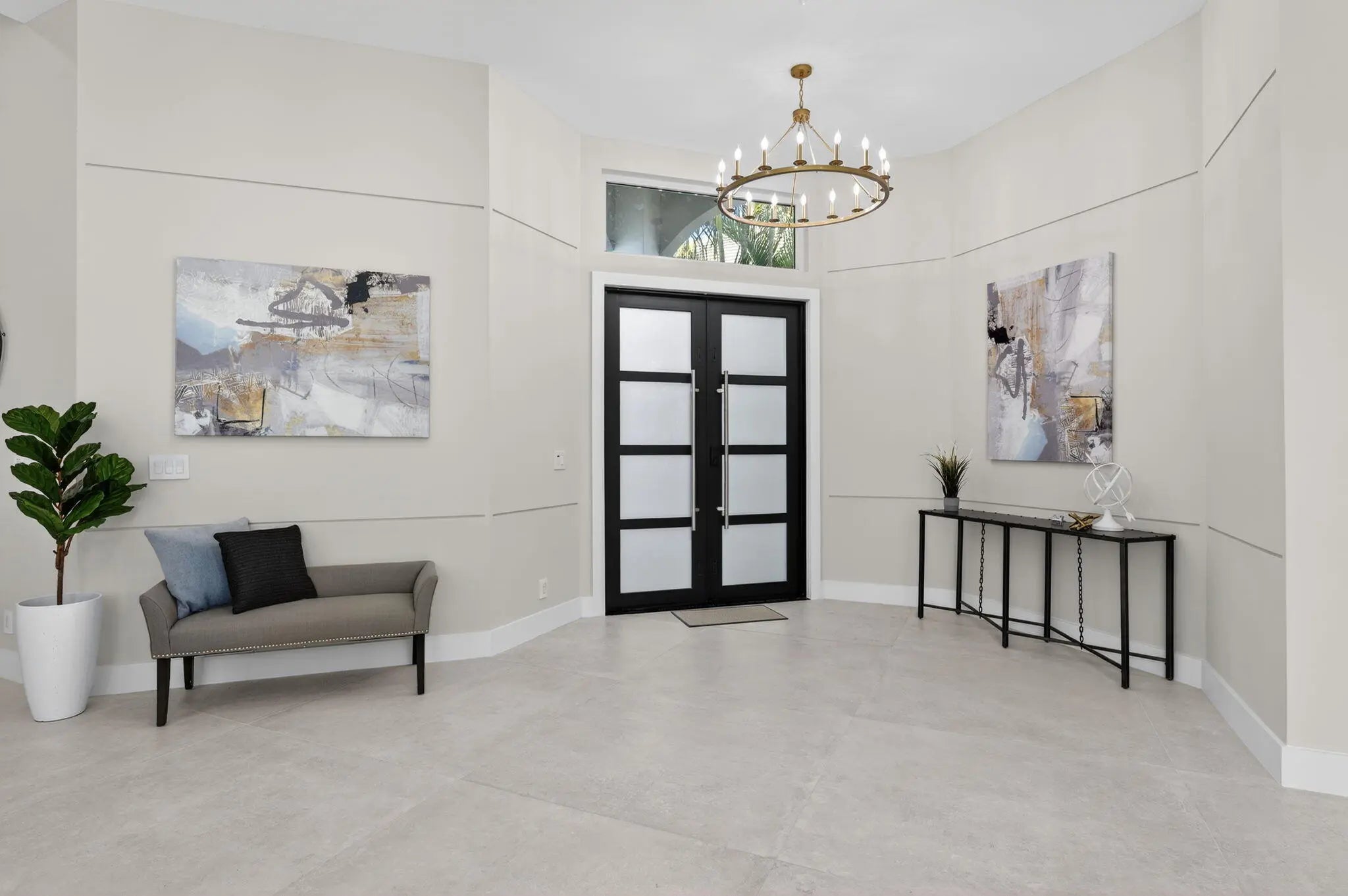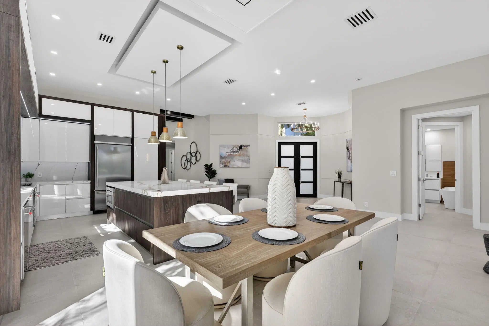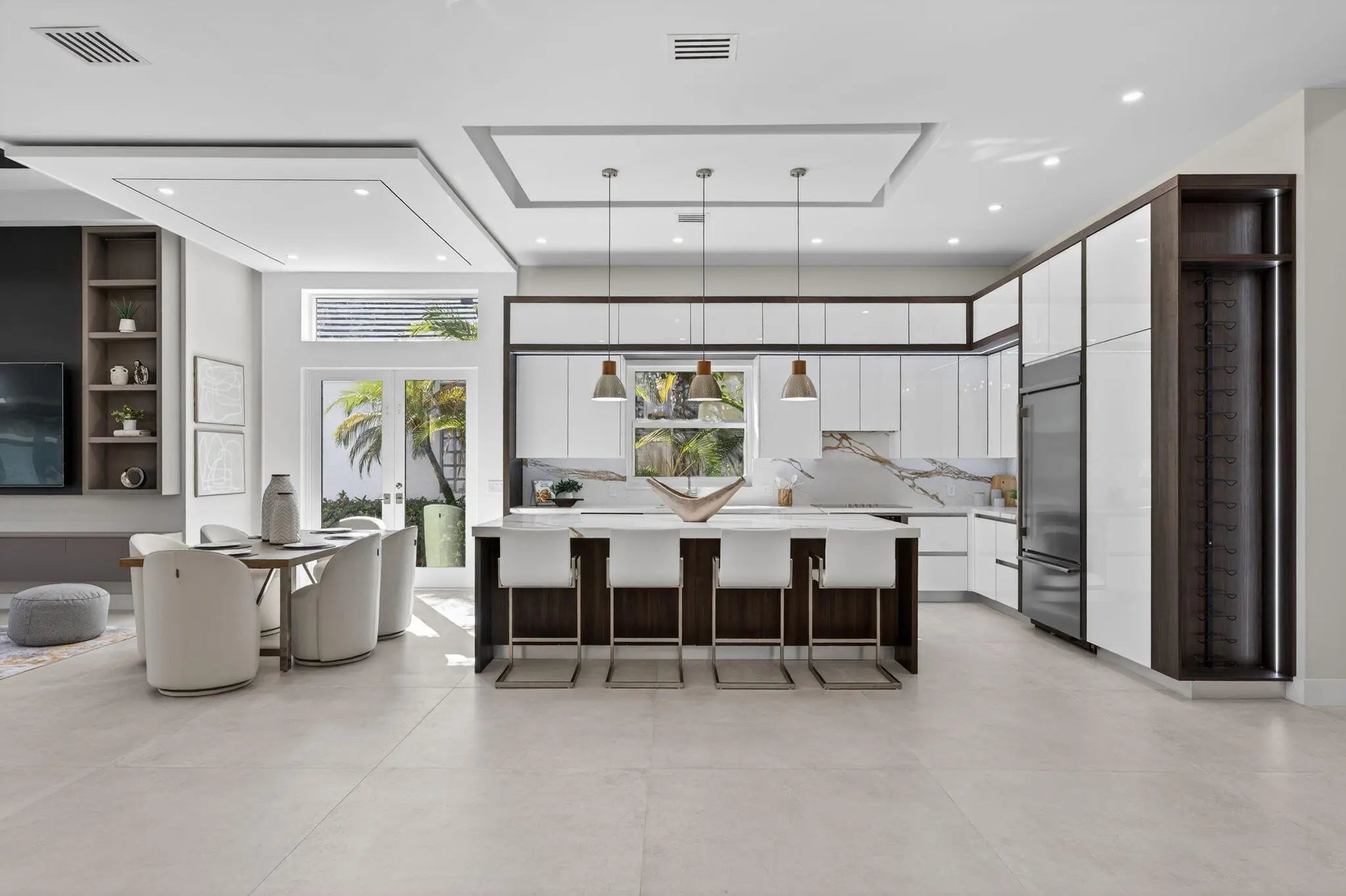 Fabulous, fully redesigned and updated home featuring 3 bedrooms, 3 bathrooms (all ensuite), plus a private office/den. This residence offers complete impact glass windows and doors, a full-house generator, and a quick-recovery hot water heater. Additional upgrades include a new roof with gutters. Enter through double glass doors into a spacious foyer that opens to a large Great Room. The kitchen showcases an oversized center island, abundant storage, brand-new stainless steel appliances, a microwave drawer, and elegant quartzite countertops. The family room features a custom built-in wall unit and 12-foot impact glass sliding doors that lead to an extended patio deck with stunning golf course views. This home features a partial golf membership.