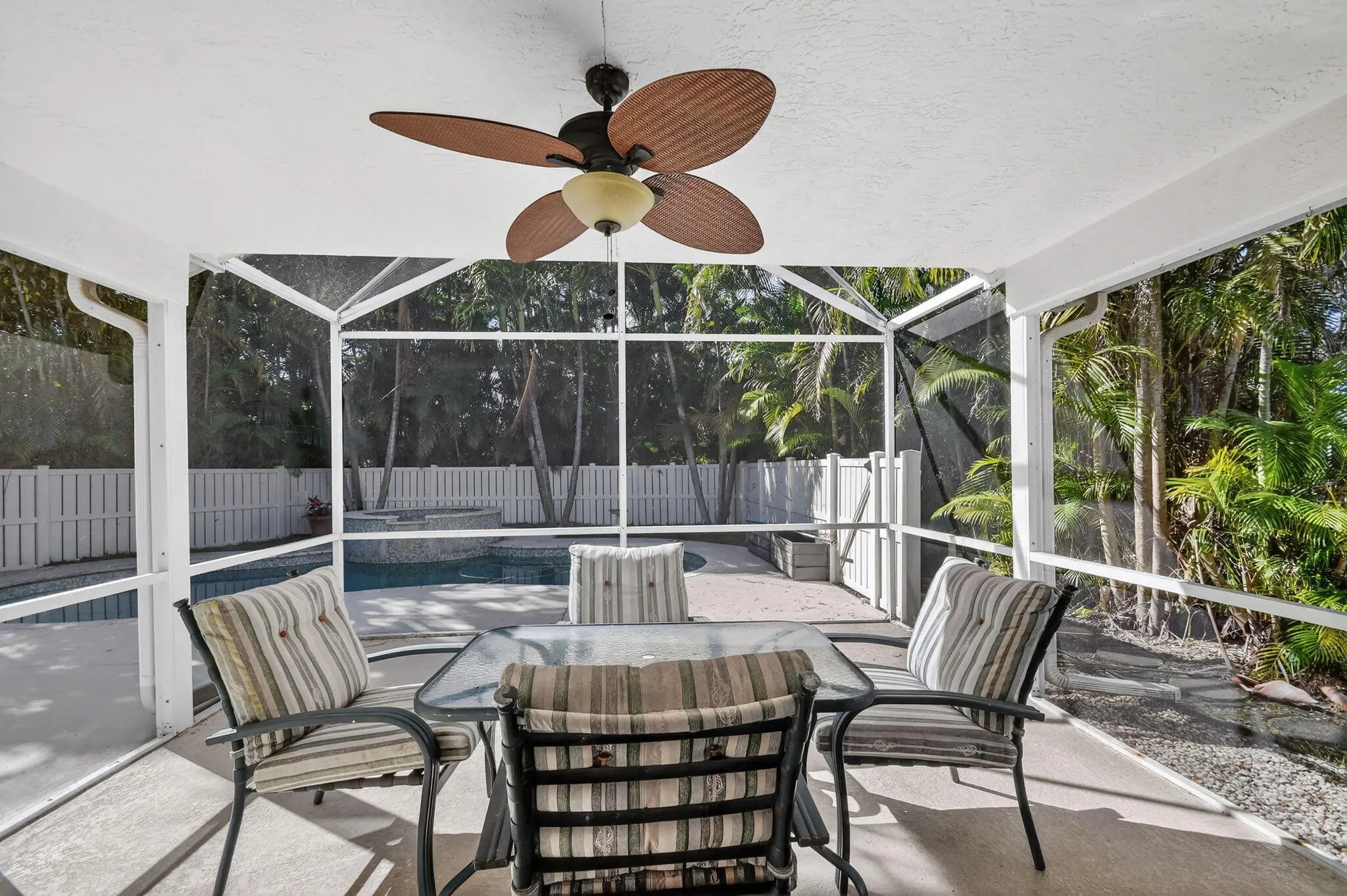 Located in a beautiful gated community with mature trees, this light-filled 3BR, 2BA home offers an open, airy layout designed for comfortable Florida living. Bamboo wood floors flow through the expansive great room, while the spacious kitchen and generous bedrooms provide room to live and grow. The primary suite features dual walk-in closets. Step outside to a screened patio and private backyard with pool, perfect for relaxing or entertaining. With 2,544 total sq ft and a thoughtful layout, this home is conveniently located near shopping, dining, parks, and major roadways.