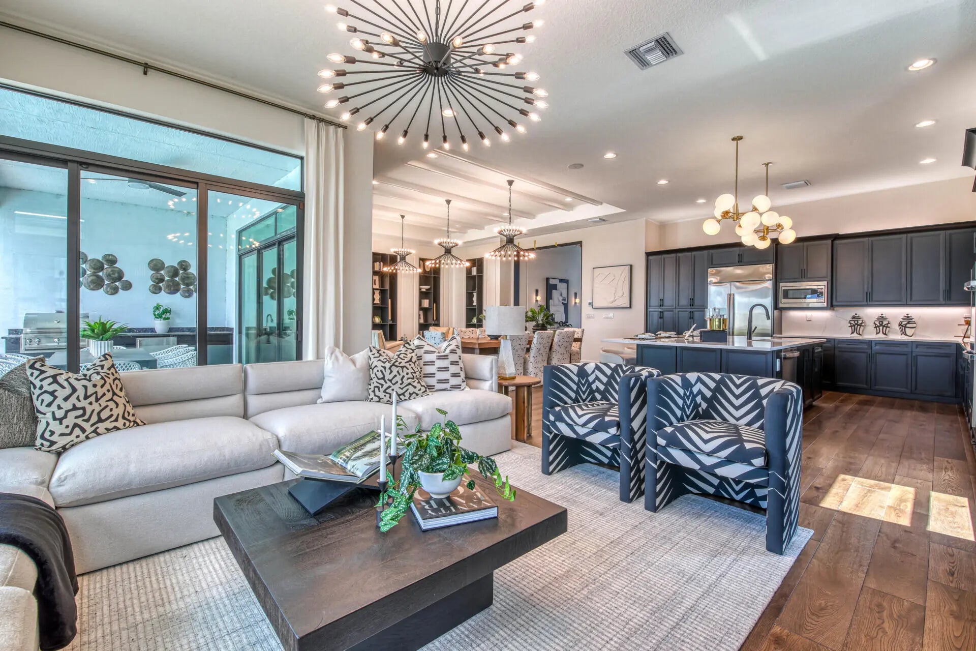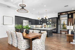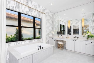 Reduced $50,000 - Fully-Furnished & Designer-Decorated Model Home with 3 Bedrooms, a Club Room, Family Room, Living Room, 3.5 Baths, Split 3-Car Garage, a Pool w/Sheer Descent and a Summer Kitchen on a stunning lakefront lot. The Sonoma model features 14-foot ceilings, rich engineered wood floors, a gourmet kitchen, with sleek matte black cabinetry, glass accents, a custom wood hood, and a 42'' built-in refrigerator. The primary suite features a floor-to-ceiling upholstered headboard, designer lighting, and a spa-style bath with a soaking tub. A stylish club room with custom built-ins. Amenities include a full service restaurant, Indoor pickleball, 44,000 square foot clubhouse with a spa and salon, indoor/outdoor bar, multiple pools, tennis & more