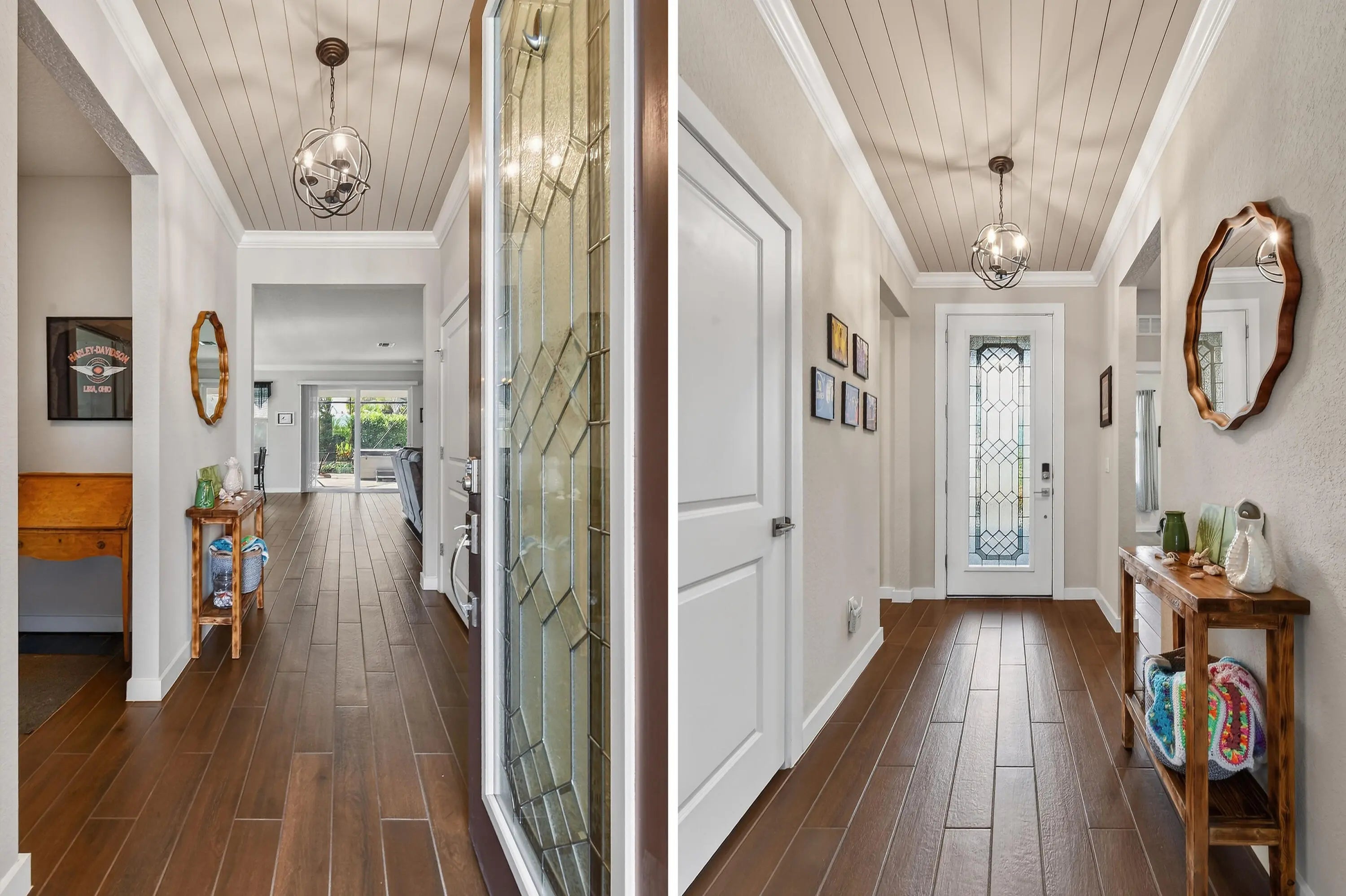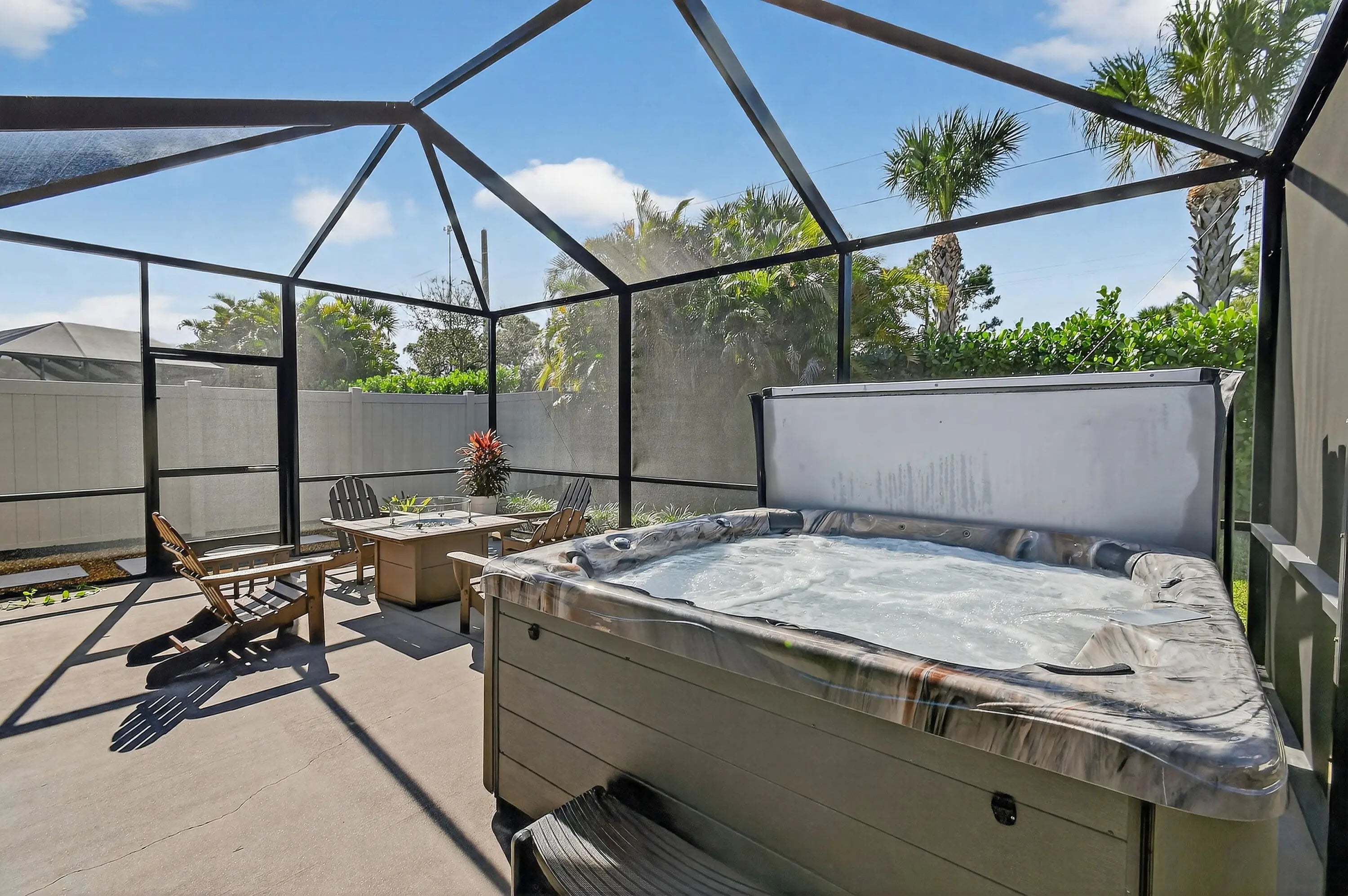 Immaculate, stunning 3 bedroom, 2 bath home built in 2019 located in desirable TidewateR Pointe. Beautiful open floor plan with split bedrooms.Exquisite wood-look title flooring throughout main living area. Large kitchen with island and tons of cabinets overlooking the family room featuring a custom built-in wall unit. Huge screened-in lanai with hot tub, perfect for entertaining. Fully fenced backyard with vegetable garden.Very low HOA. Upgrades include completely renovated bathrooms, hardwood floors in all bedrooms, gorgeous shiplap in the foyer, crown molding, 4 CCTV cameras, ADT alarm panel ,new refrigerator in 2024 and microwave in 2025. Excellent location close to shopping, dining, golf and major highways. TURNKEY AND MOVE IN READY.A MUST SEE !!