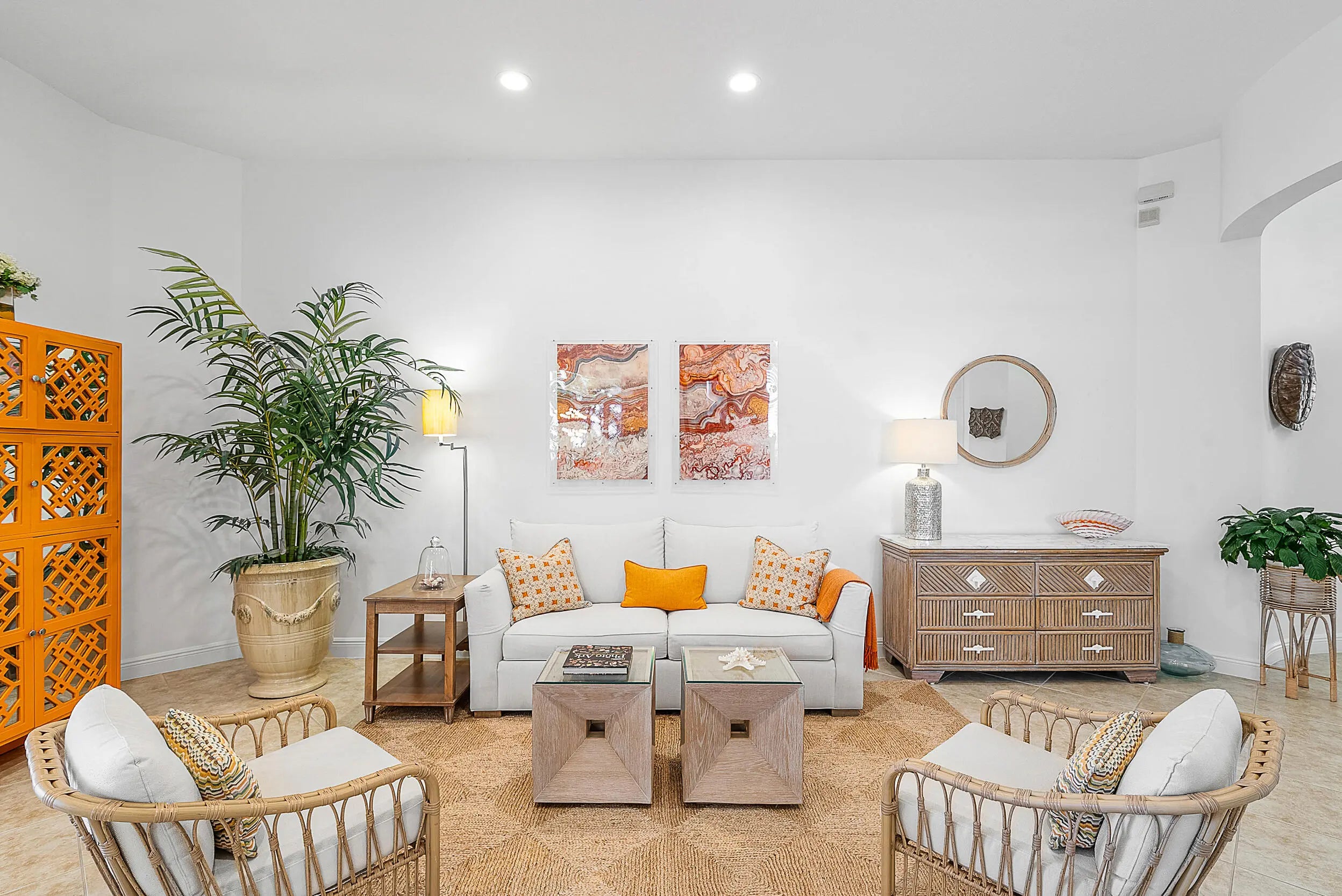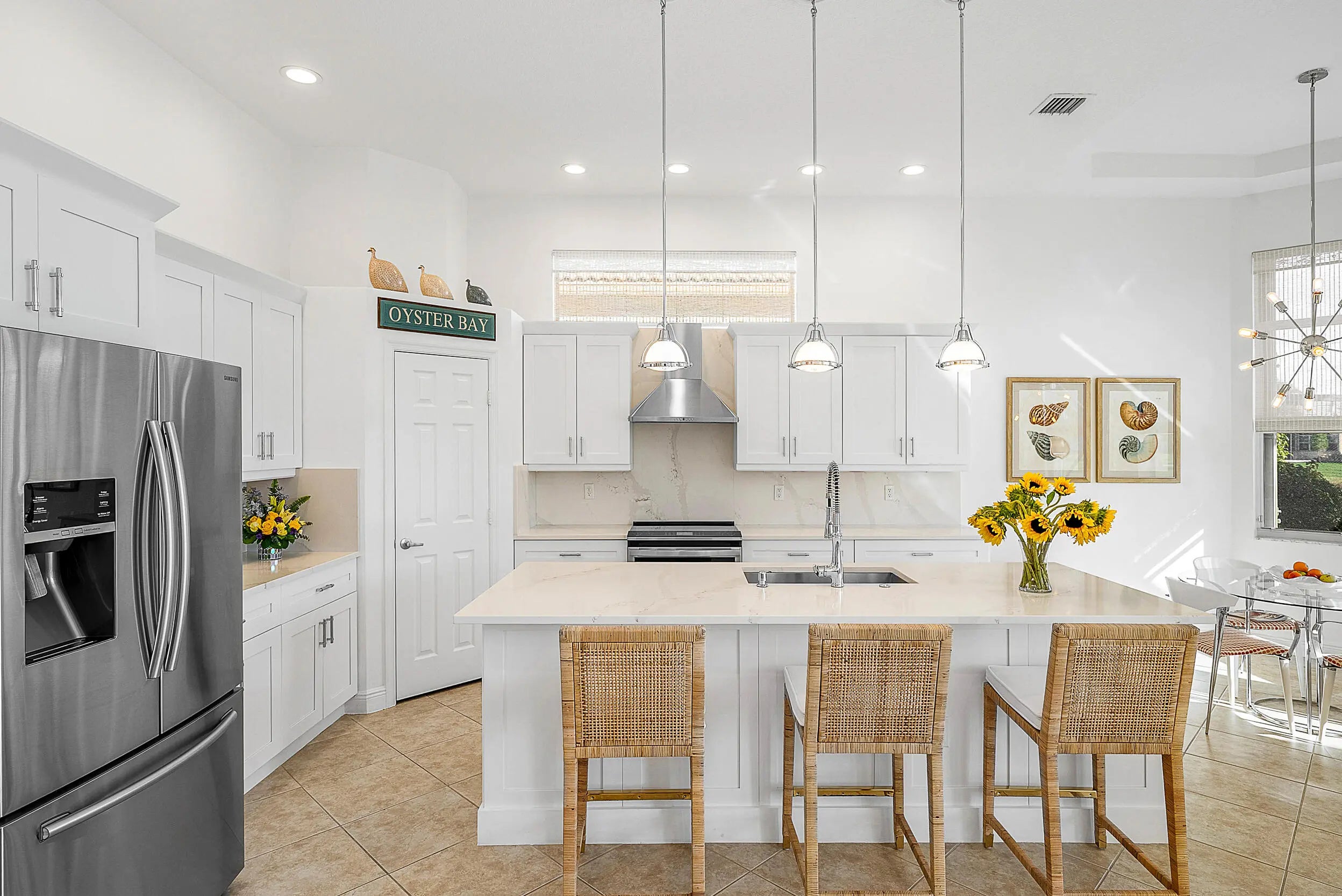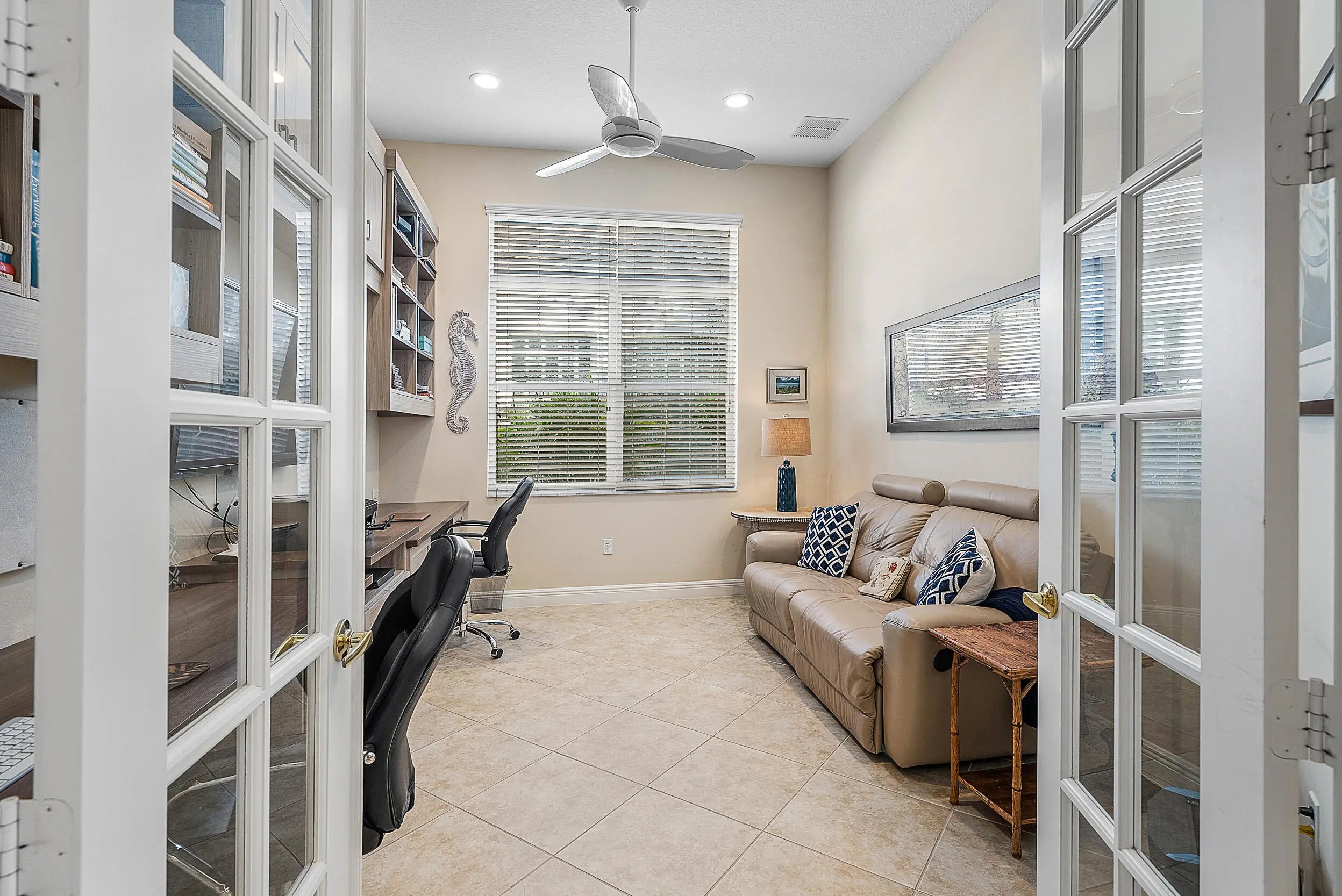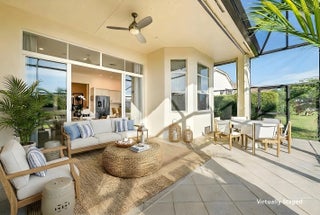 Experience easy lakefront living in Buena Vida, Wellington's only gated 55+ resort-style community. This beautifully appointed 2 bed, 2.5 bath home plus den/office offers tranquil water views, lush tropical landscaping, and a bright open layout made for entertaining. French doors, formal living and dining, and an inviting family room flow into the upgraded kitchen with solid wood cabinetry, quartz countertops and backsplash, stainless steel appliances, oversized island, walk-in pantry, and sunny breakfast nook. The primary suite feels like a private retreat with soaking tub, double vanities, and enclosed shower. Guest bedroom features an ensuite bath. Unwind on your extended screened-in patio overlooking the lake. Newer HVAC 2019 and hurricane patio shutters 2024. Enjoy resort amenities including pools, spa, café, fitness, tennis, pickleball, and a full social calendar. Minutes to dining, parks, equestrian, and PBI.