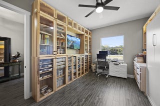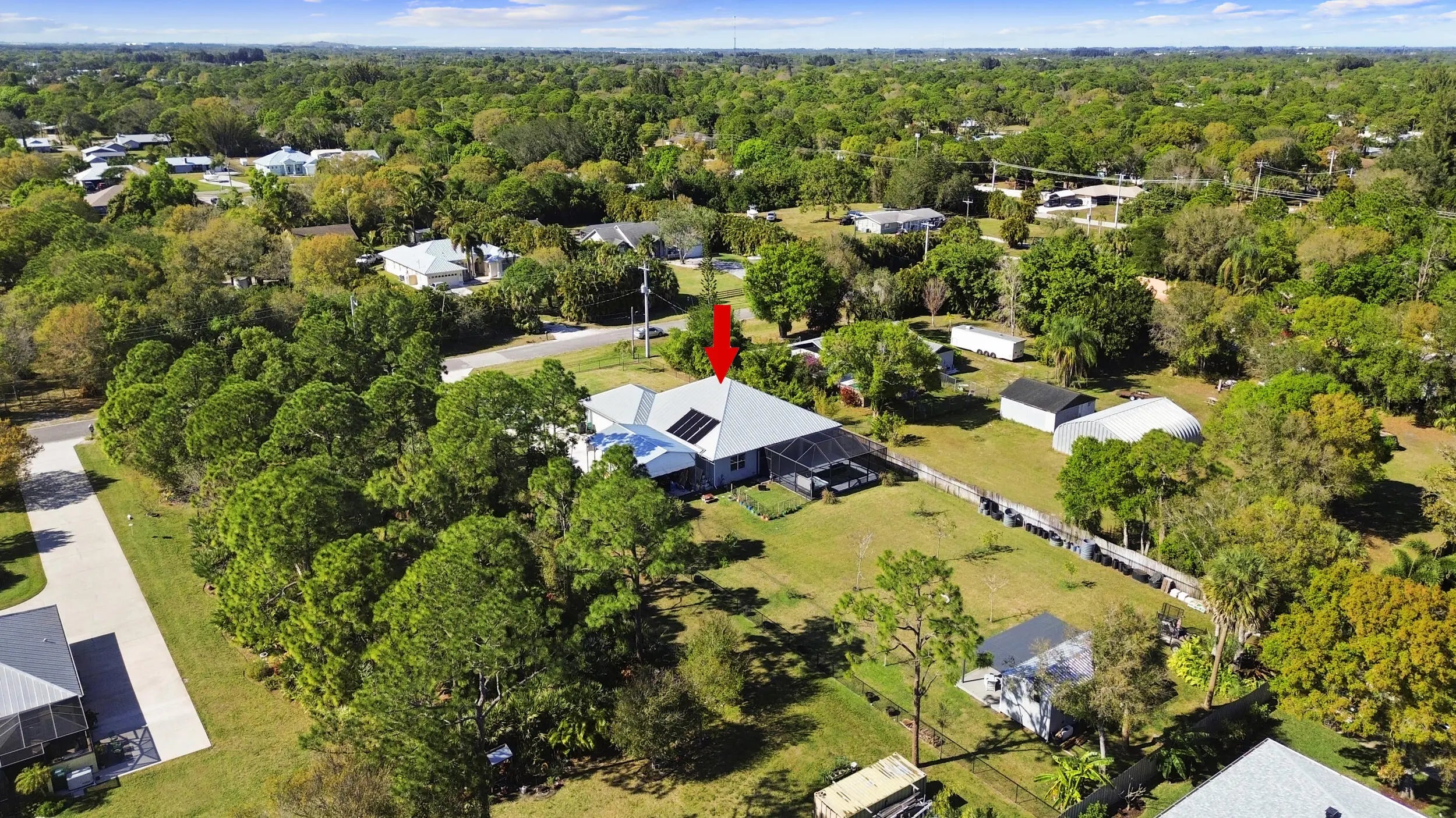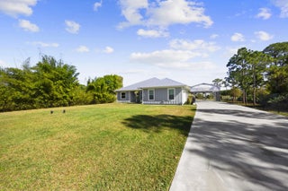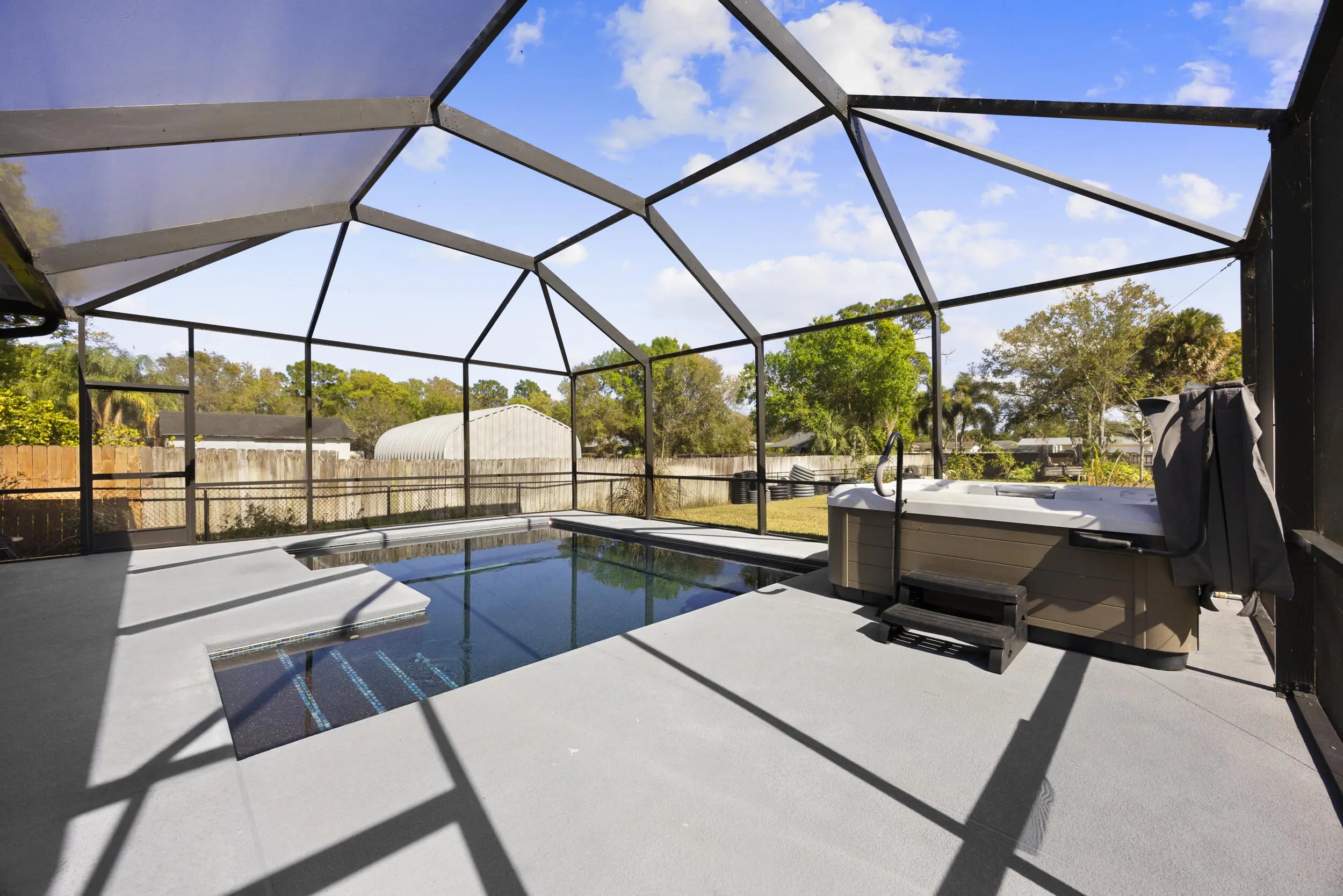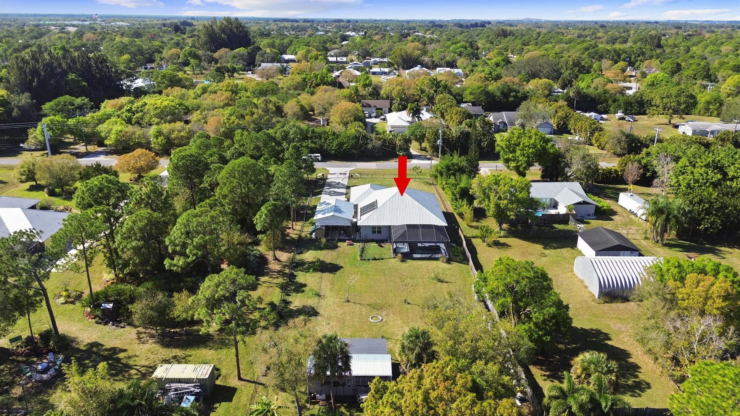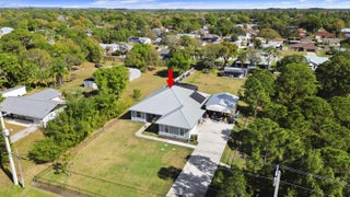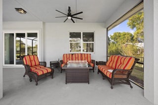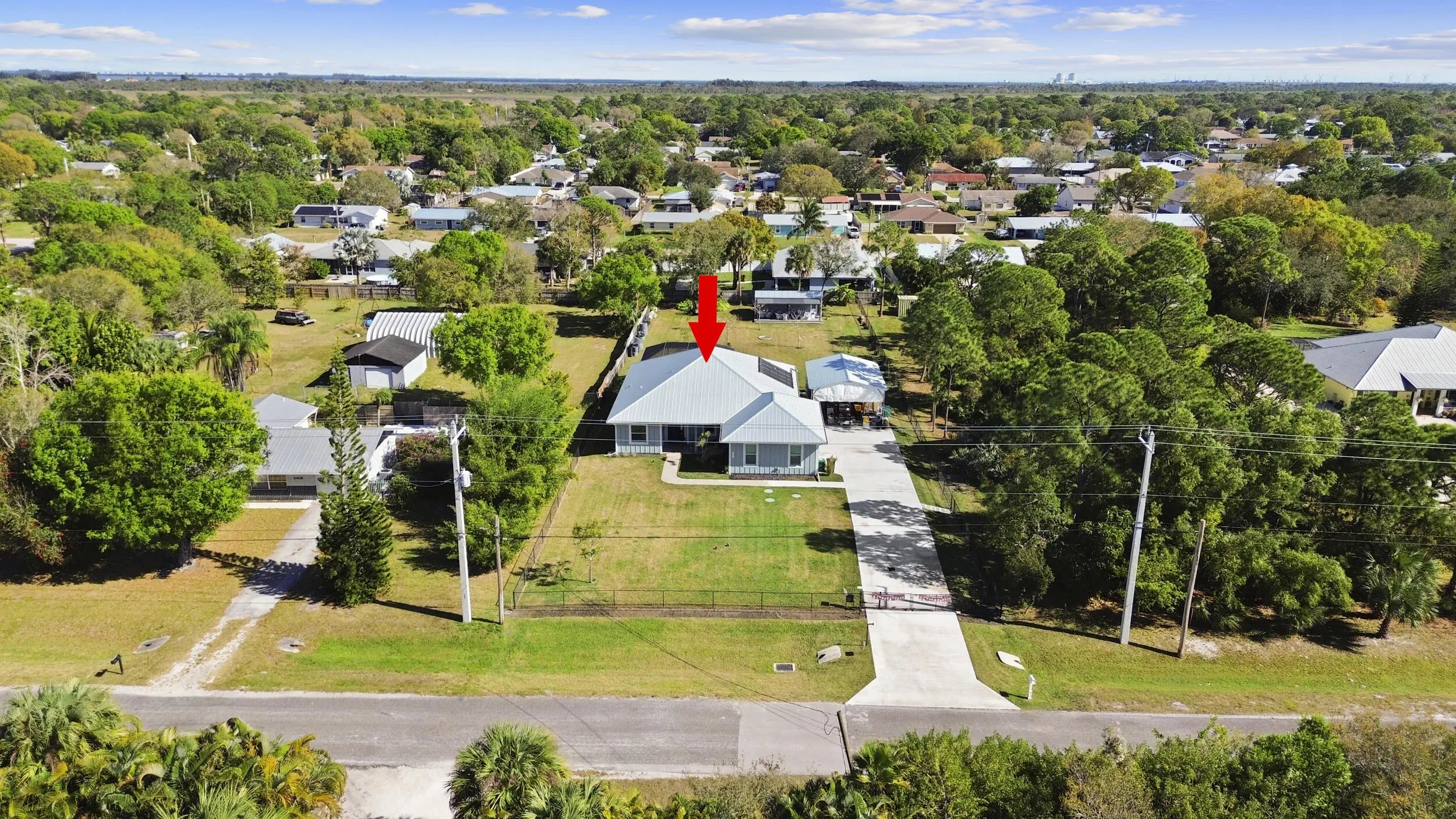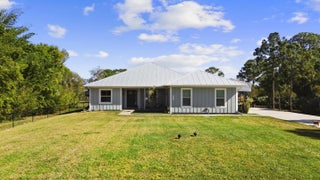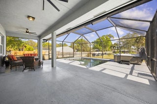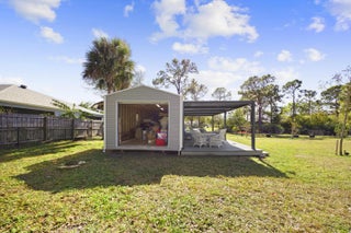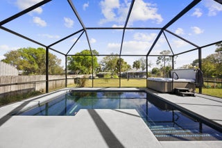 WELCOME HOME. This well-appointed 2022 build gem resting on a premium .68-acre lot and boasting 3 bedrooms, 2 bathrooms, oversized 3 car attached garage with epoxy flooring saltwater pool, Bullfrog Spa, upgrades and designer touches galore, hurricane impact windows and doors throughout, metal roof, 250-gallon propane tank, solar pool system, a massive 18X150 concrete drive leads to a 14hx18w30w steel carport perfect for boat or RV storage. In addition, a full beautiful powder coated black chain link fence encloses the entire .68 acres to include electric gate. The grounds are irrigated by a 12-zone rain bird system. The back yard includes a 12X30 permitted building complete with metal roof, gutters electric, windows, entrance door, utility roll up door to include a 12X30 sitting porch Upon entering this beautiful split floor plan you have a beautiful view of the massive outdoor space to include the saltwater solar heated pool and massive screened outdoor space. The kitchen is a chef's dream to include a 48"double electric oven dual range with gas cook top, pot filler, and range hood vented to exterior, 42" white custom soft close cabinets, pullouts galore, pantry, black stainless-steel appliances, under the counter microwave. The kitchen island is oversized for a large family or entertainer's delight. To make entertaining a breeze a 2025 custom built in buffet with 11X24 buffet with pull out storage, local live edge countertop. The living area is bright an airy as it opens to lanai and pool it. The living area includes a gorgeous slate fireplace floor to ceiling with live edge mantel and hearth. The fireplace is flanked by solid cherry wood lighted cases locally handcrafted. Relax in your primary suite with private access to the solar heated pool/spa, his and hers walk in closets 6X5 and 5X11. The beautiful well-appointed en-suite bathroom boasts dual sinks, custom lighting, white cabinets with shite marble countertops and a walk in 5X6 shower spa. There are two additional bedrooms with one offering a murphy bed flanked by built in floor to ceiling shelving. A laundry room, solid wood cabinet storage, mud room is off the garage. This home needs nothing and is move in ready. WELCOME HOME!!