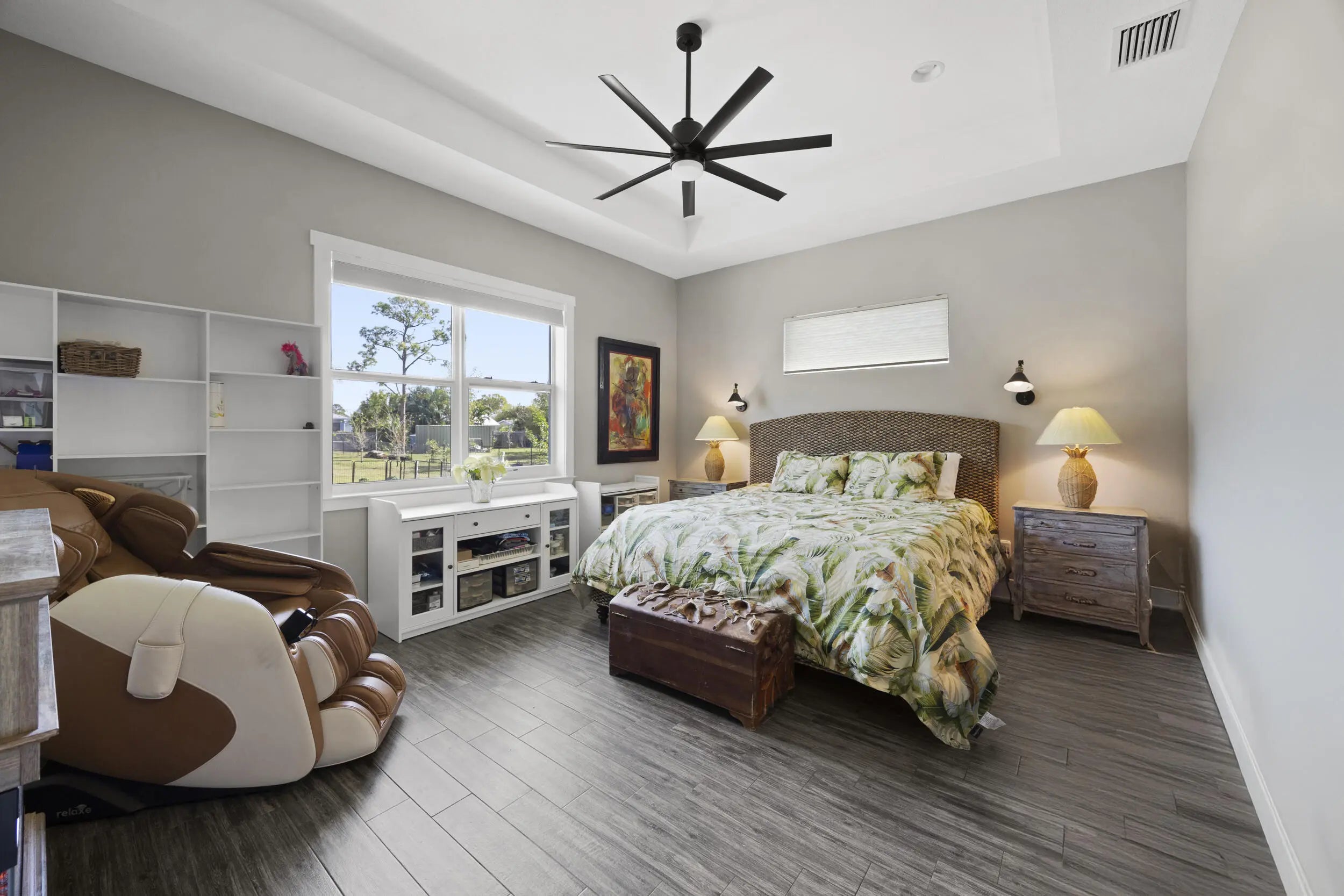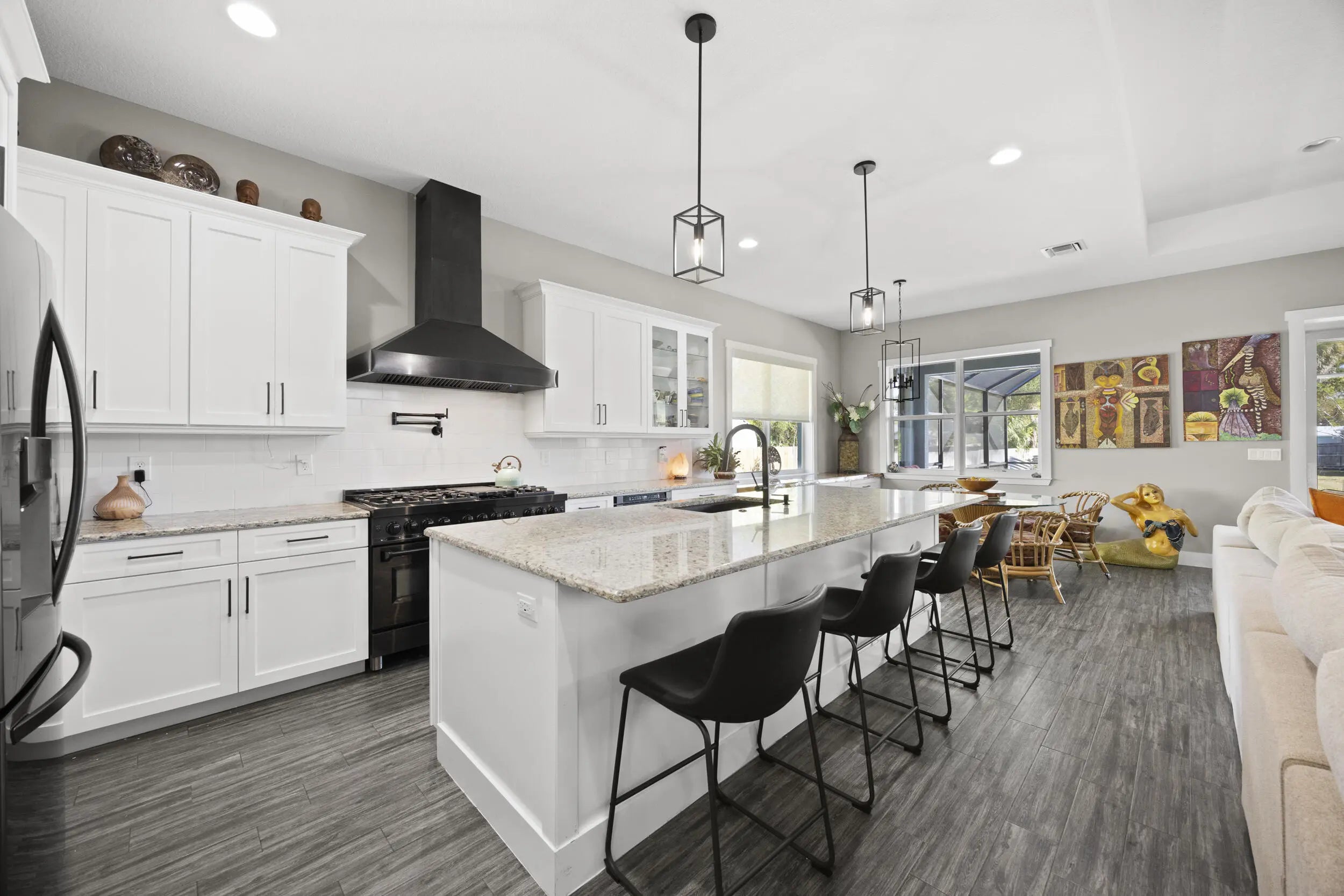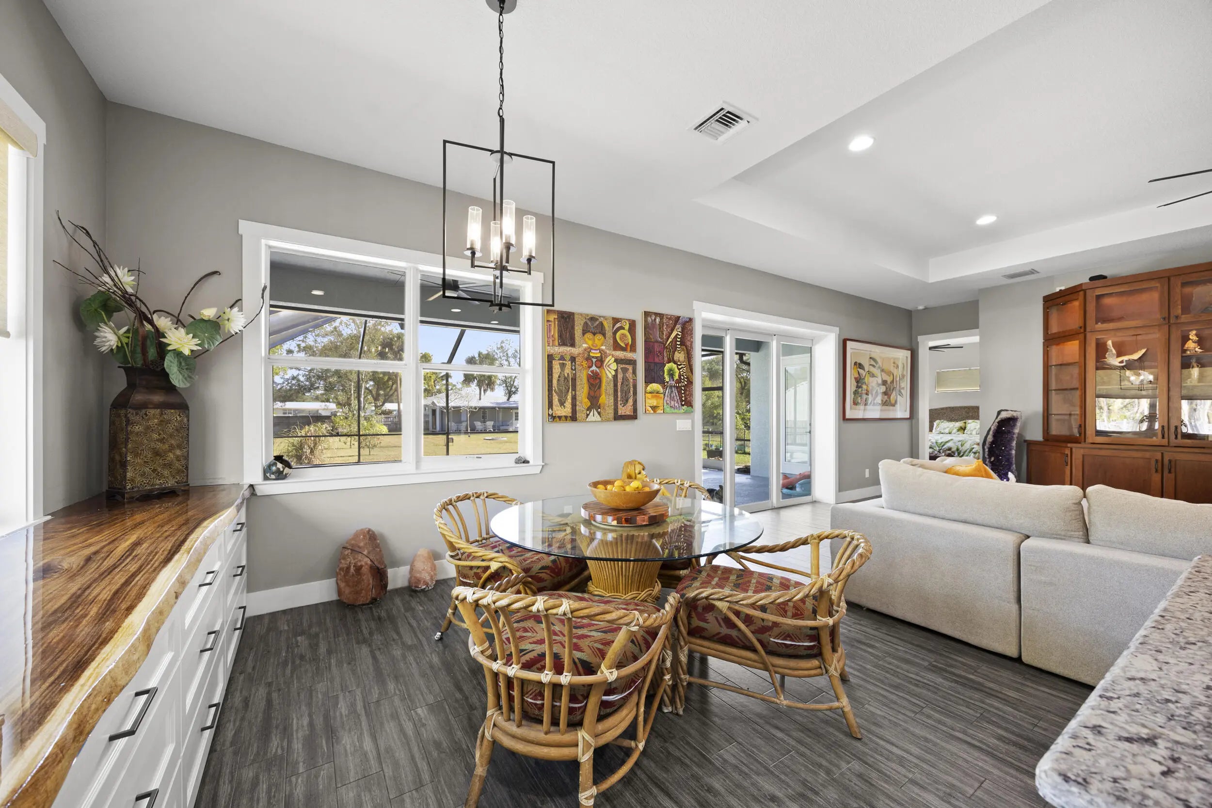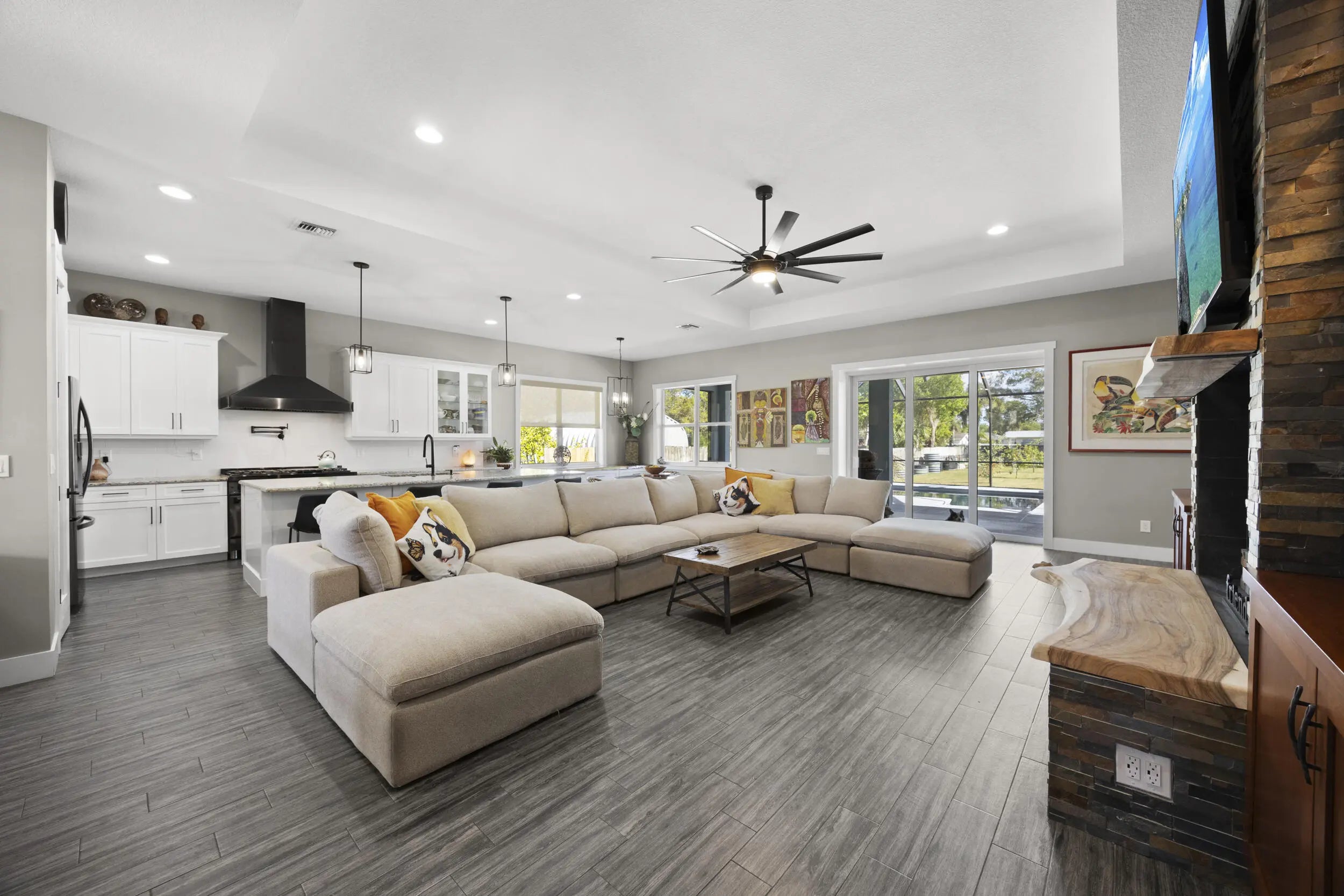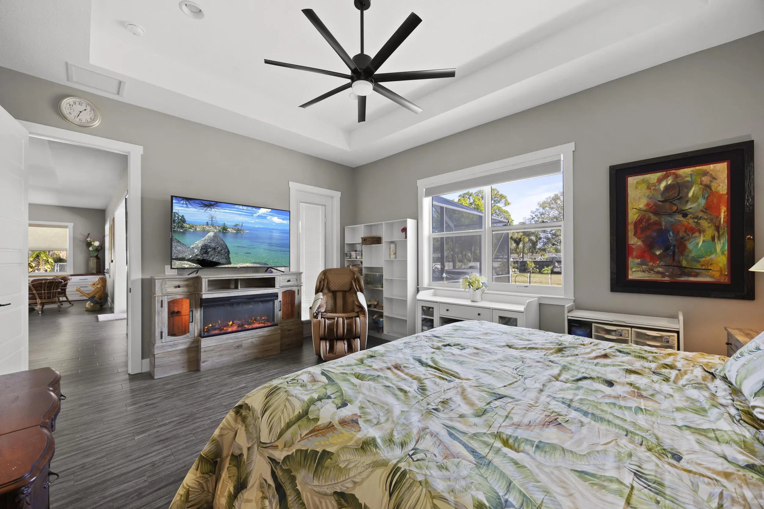 WELCOME HOME. This well-appointed 2022 build gem resting on a premium .68-acre lot and boasting 3 bedrooms, 2 bathrooms, oversized 3 car attached garage with epoxy flooring saltwater pool, Bullfrog Spa, upgrades and designer touches galore, hurricane impact windows and doors throughout, metal roof, 250-gallon propane tank, solar pool system, a massive 18X150 concrete drive leads to a 14hx18w30w steel carport perfect for boat or RV storage. In addition, a full beautiful powder coated black chain link fence encloses the entire .68 acres to include electric gate. The grounds are irrigated by a 12-zone rain bird system. The back yard includes a 12X30 permitted building complete with metal roof, gutters electric, windows, entrance door, utility roll up door to include a 12X30 sitting porch Upon entering this beautiful split floor plan you have a beautiful view of the massive outdoor space to include the saltwater solar heated pool and massive screened outdoor space. The kitchen is a chef's dream to include a 48"double electric oven dual range with gas cook top, pot filler, and range hood vented to exterior, 42" white custom soft close cabinets, pullouts galore, pantry, black stainless-steel appliances, under the counter microwave. The kitchen island is oversized for a large family or entertainer's delight. To make entertaining a breeze a 2025 custom built in buffet with 11X24 buffet with pull out storage, local live edge countertop. The living area is bright an airy as it opens to lanai and pool it. The living area includes a gorgeous slate fireplace floor to ceiling with live edge mantel and hearth. The fireplace is flanked by solid cherry wood lighted cases locally handcrafted. Relax in your primary suite with private access to the solar heated pool/spa, his and hers walk in closets 6X5 and 5X11. The beautiful well-appointed en-suite bathroom boasts dual sinks, custom lighting, white cabinets with shite marble countertops and a walk in 5X6 shower spa. There are two additional bedrooms with one offering a murphy bed flanked by built in floor to ceiling shelving. A laundry room, solid wood cabinet storage, mud room is off the garage. This home needs nothing and is move in ready. WELCOME HOME!!