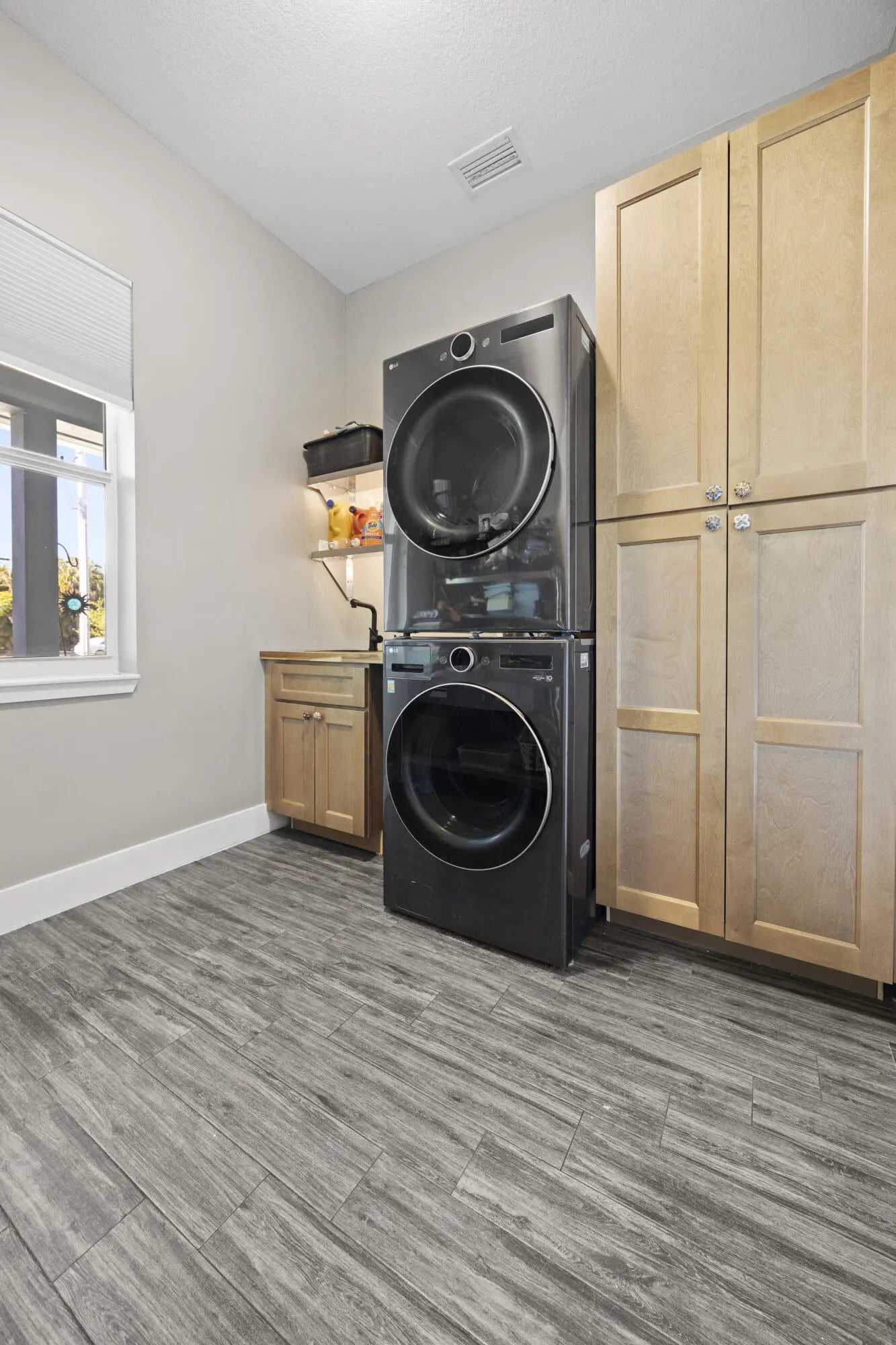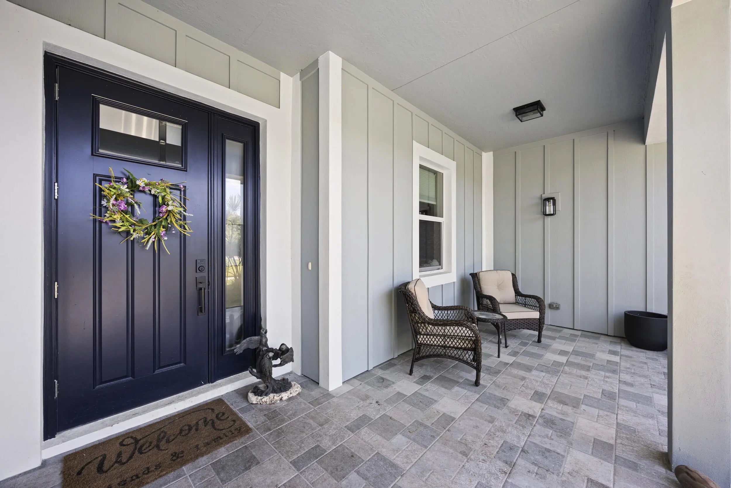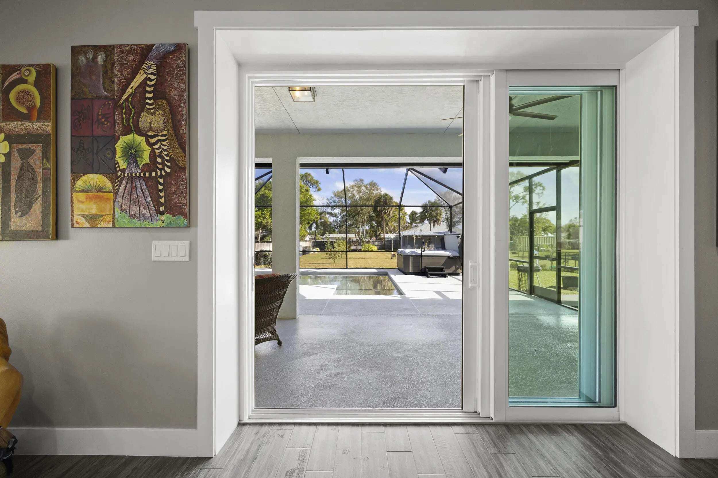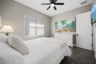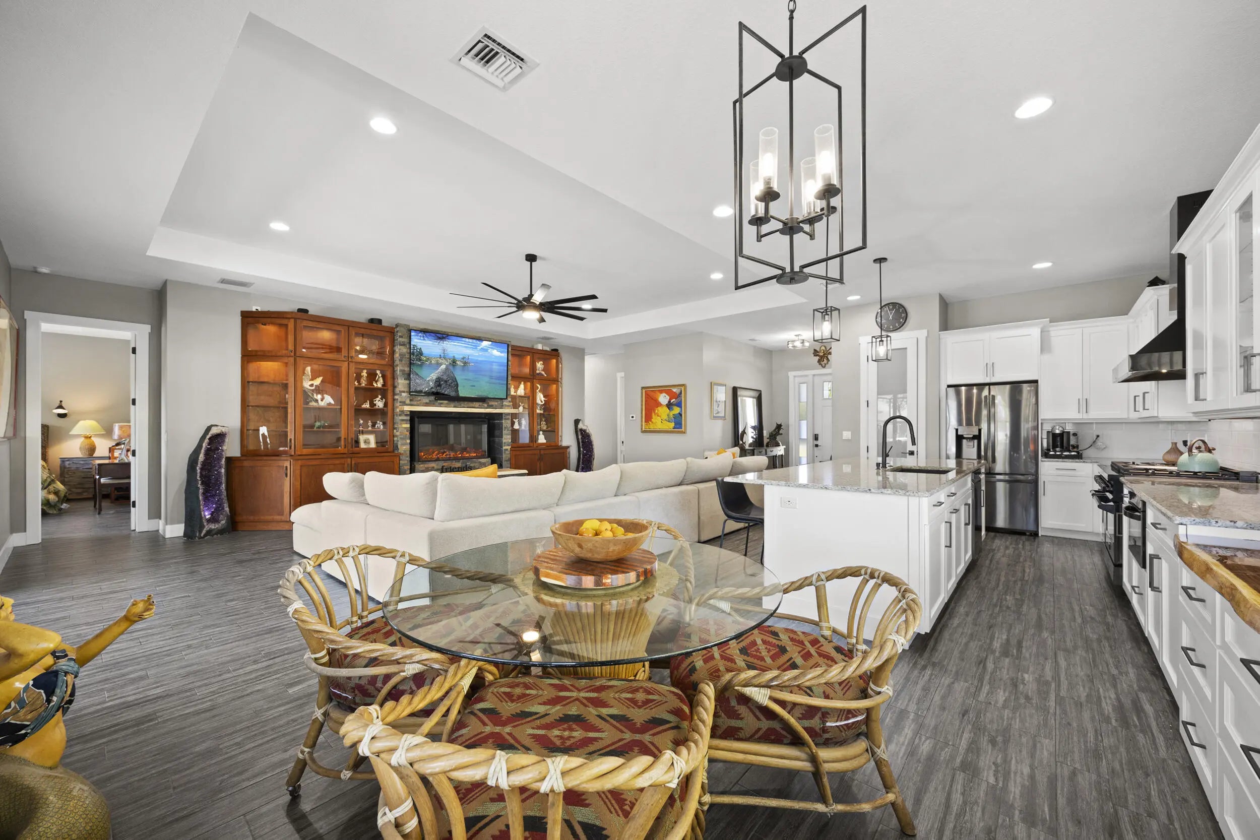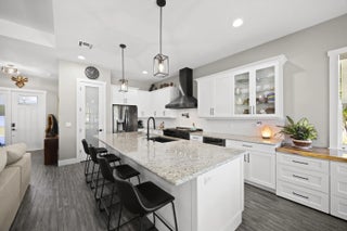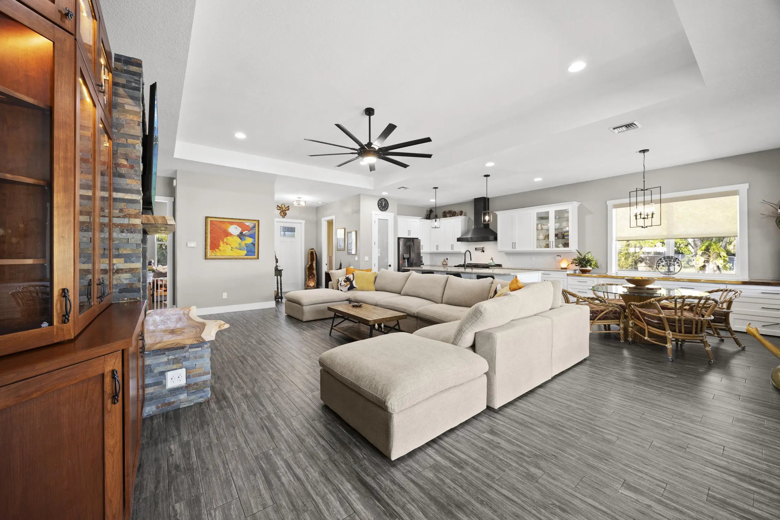 WELCOME HOME. This well-appointed 2022 build gem resting on a premium .68-acre lot and boasting 3 bedrooms, 2 bathrooms, oversized 3 car attached garage with epoxy flooring saltwater pool, Bullfrog Spa, upgrades and designer touches galore, hurricane impact windows and doors throughout, metal roof, 250-gallon propane tank, solar pool system, a massive 18X150 concrete drive leads to a 14hx18w30w steel carport perfect for boat or RV storage. In addition, a full beautiful powder coated black chain link fence encloses the entire .68 acres to include electric gate. The grounds are irrigated by a 12-zone rain bird system. The back yard includes a 12X30 permitted building complete with metal roof, gutters electric, windows, entrance door, utility roll up door to include a 12X30 sitting porch Upon entering this beautiful split floor plan you have a beautiful view of the massive outdoor space to include the saltwater solar heated pool and massive screened outdoor space. The kitchen is a chef's dream to include a 48"double electric oven dual range with gas cook top, pot filler, and range hood vented to exterior, 42" white custom soft close cabinets, pullouts galore, pantry, black stainless-steel appliances, under the counter microwave. The kitchen island is oversized for a large family or entertainer's delight. To make entertaining a breeze a 2025 custom built in buffet with 11X24 buffet with pull out storage, local live edge countertop. The living area is bright an airy as it opens to lanai and pool it. The living area includes a gorgeous slate fireplace floor to ceiling with live edge mantel and hearth. The fireplace is flanked by solid cherry wood lighted cases locally handcrafted. Relax in your primary suite with private access to the solar heated pool/spa, his and hers walk in closets 6X5 and 5X11. The beautiful well-appointed en-suite bathroom boasts dual sinks, custom lighting, white cabinets with shite marble countertops and a walk in 5X6 shower spa. There are two additional bedrooms with one offering a murphy bed flanked by built in floor to ceiling shelving. A laundry room, solid wood cabinet storage, mud room is off the garage. This home needs nothing and is move in ready. WELCOME HOME!!