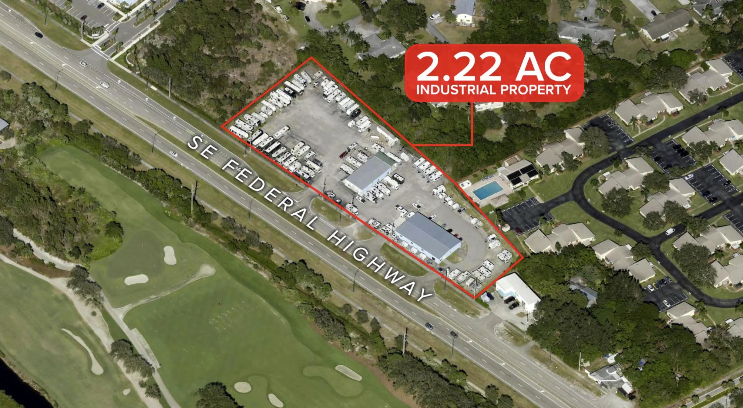 Opportunity to acquire a versatile commercial property along SE Federal Highway in Hobe Sound. • Site consists of two adjacent parcels totaling ±2.22 acres, each featuring a freestanding warehouse-style building (one 6,000± SF and the other 3,200± SF) utilized as office, sales, and showroom space. • The buildings feature multiple roll-up doors, open-concept interiors, ample parking and yard space, and the property is fully fenced for added security. • Formerly used for RV sales, the site is ideal for comparable uses, including vehicle or heavy equipment sales, as well as a variety of commercial and light industrial operations such as distribution, logistics, light manufacturing, sales, or service-based businesses. • Strategically located with direct frontage and access to US-1