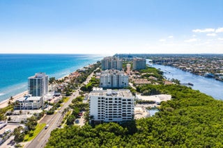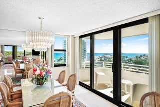 Luxury EAST boutique 54 Unit building in desirable HIGHLAND BEACH. Prime west side of A1A location w/gated PRIVATE BEACH ACCESS. Rare 8th-Floor CORNER UNIT. Spacious 3BR/2BA w/2066 liv. sq. ft. all sliding doors leads you out to your EXPANSIVE wrap-around balconies w/stunning OCEAN & INTRACOASTAL VIEWS. Pleasantly well maintained, move-in ready. Features include: Complete Hurricane Impact windows/doors + accordion shutters. Large primary bedroom suite w/2 walk-in closets & work area w/separate laundry room. Walk-in Closet in 2nd bedroom & closet in 3rd bedroom. Resort-style amenities include: Renovated lobby, club & card rooms, modern fitness center, social room w/full kitchen, wet bar, common media/recreation room, HEATED POOL with outdoor showers & restrooms his/her saunas, tennis, pickleball, BBQ area w/seating, screened lanai, covered drop-off area & guest parking. Steps away to private beach gated acces w/beach lounge chairs provided or bring your own, beach rinse off shower, Common outdoor space, Doorman, Concierge, Elevator, Owner has 2 prime parking spaces in Underneath garage, common storage, video Security, & bike room