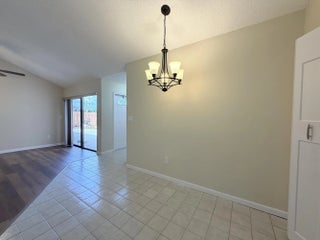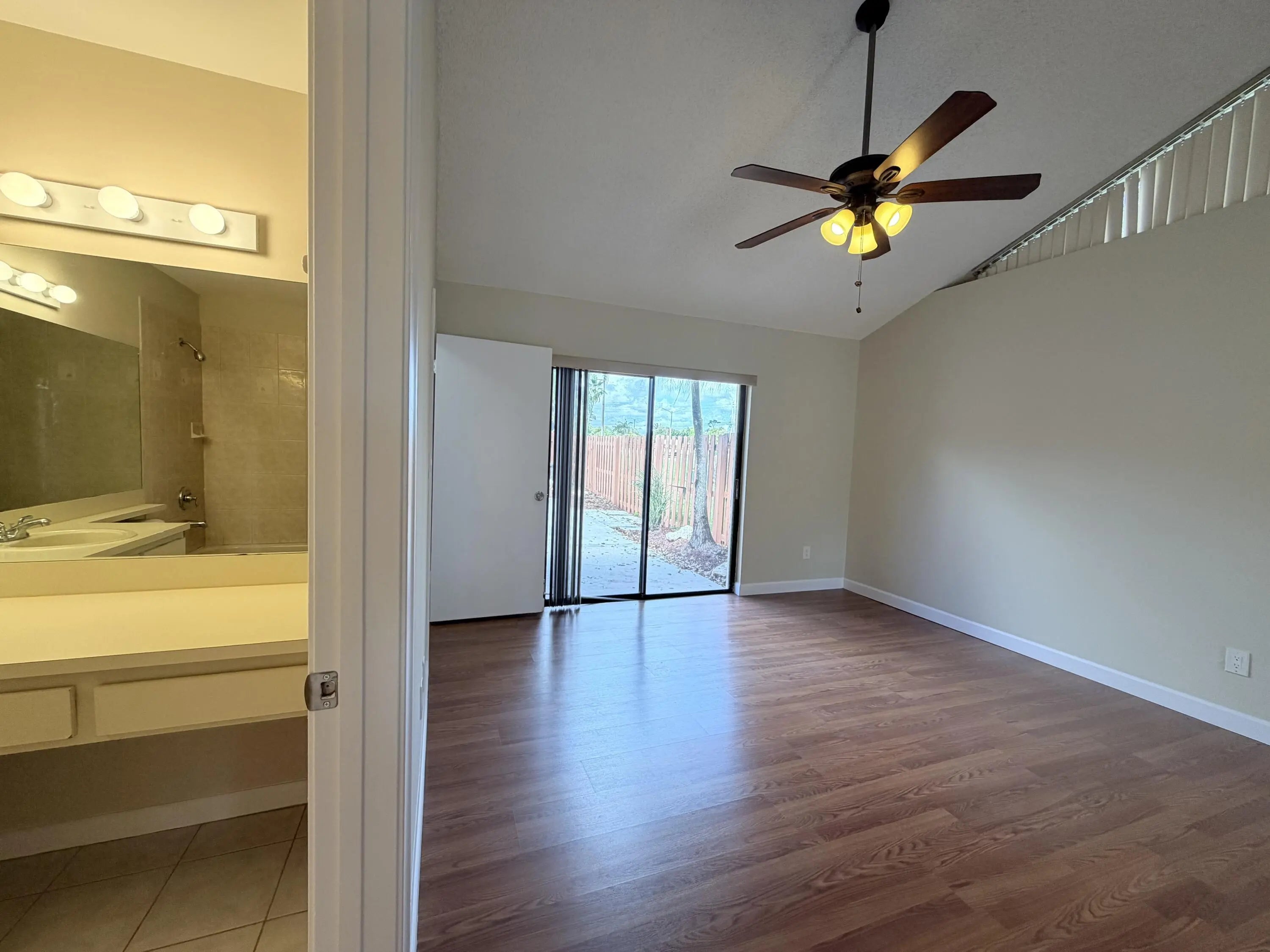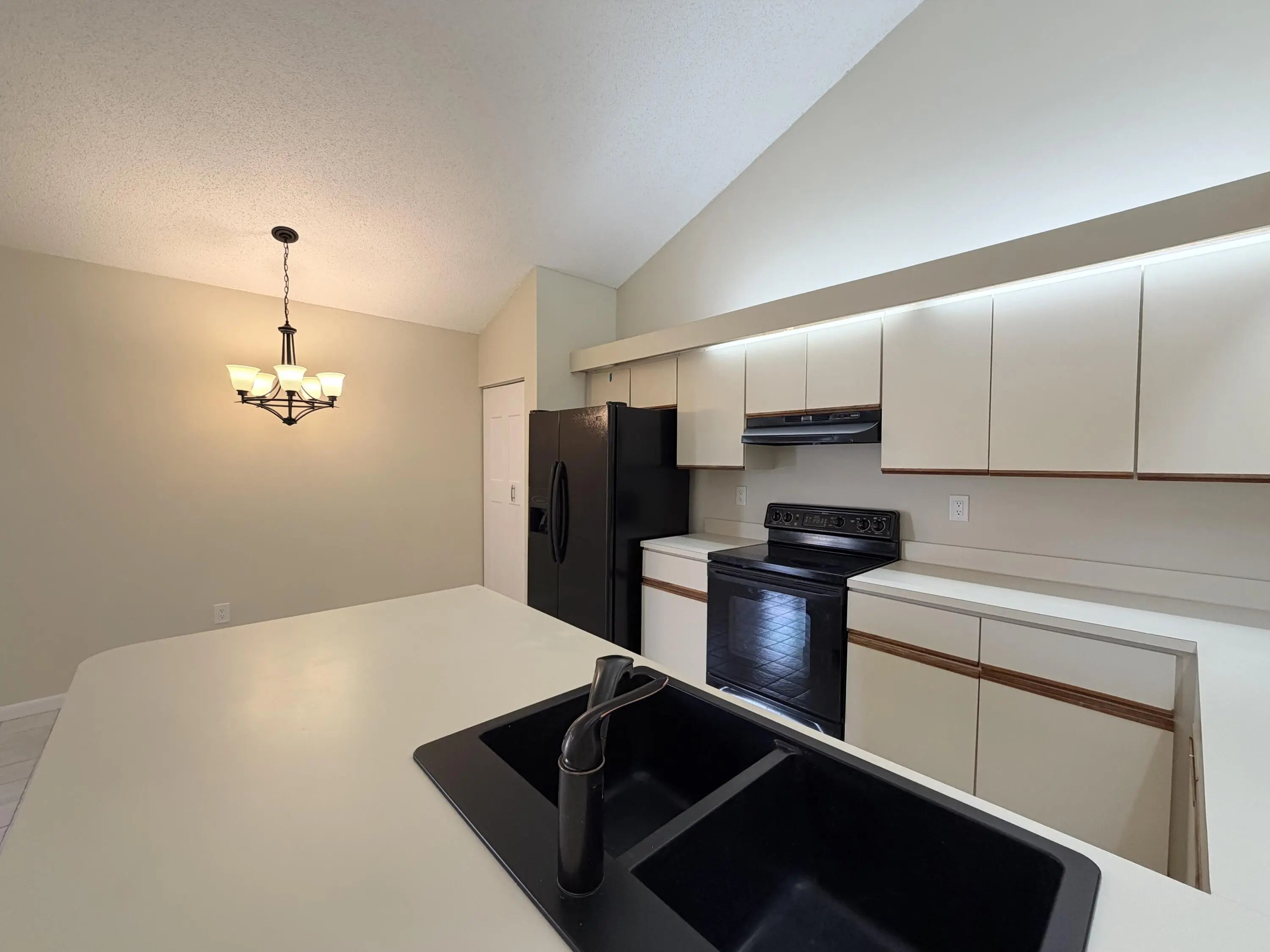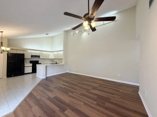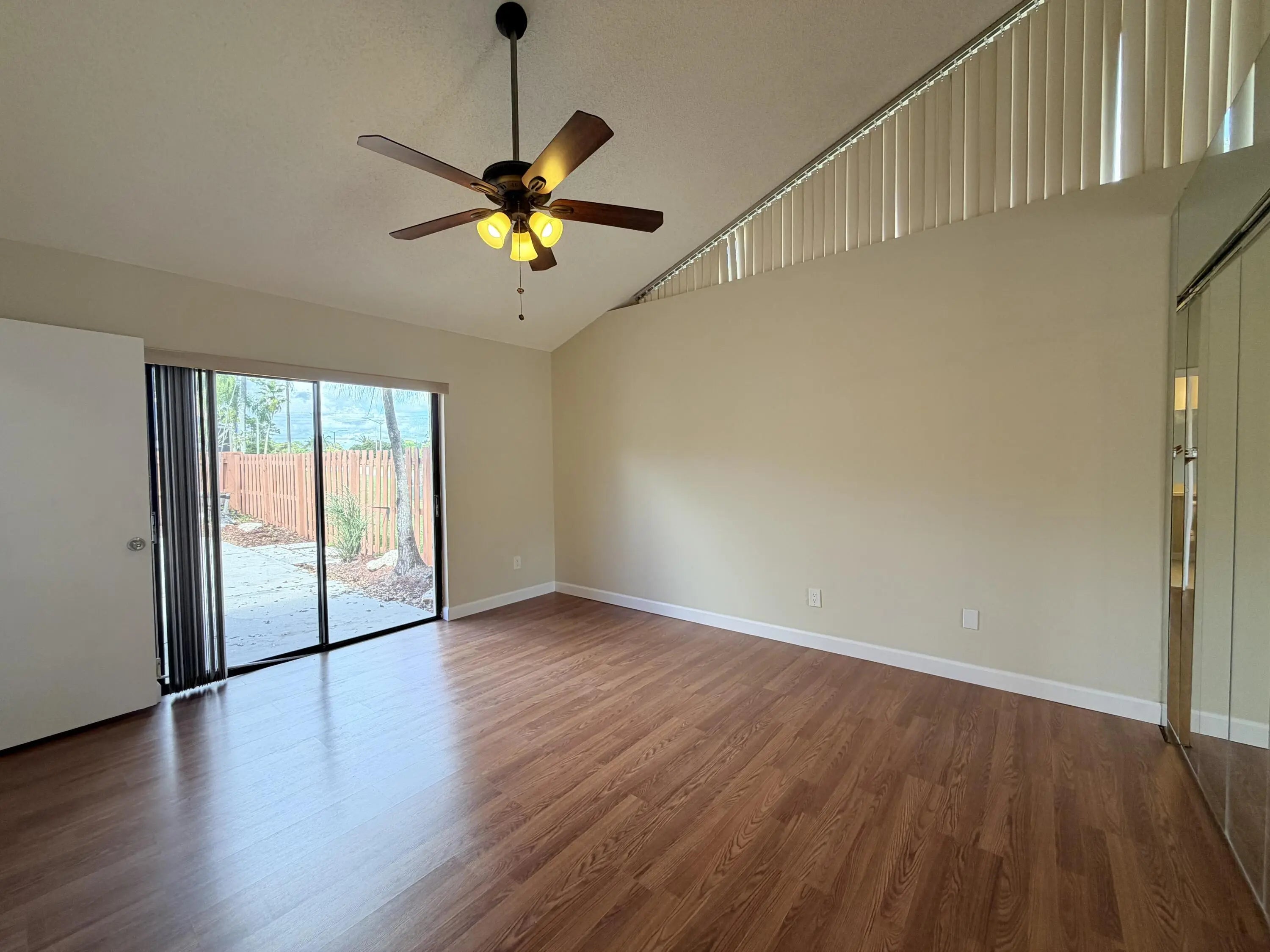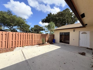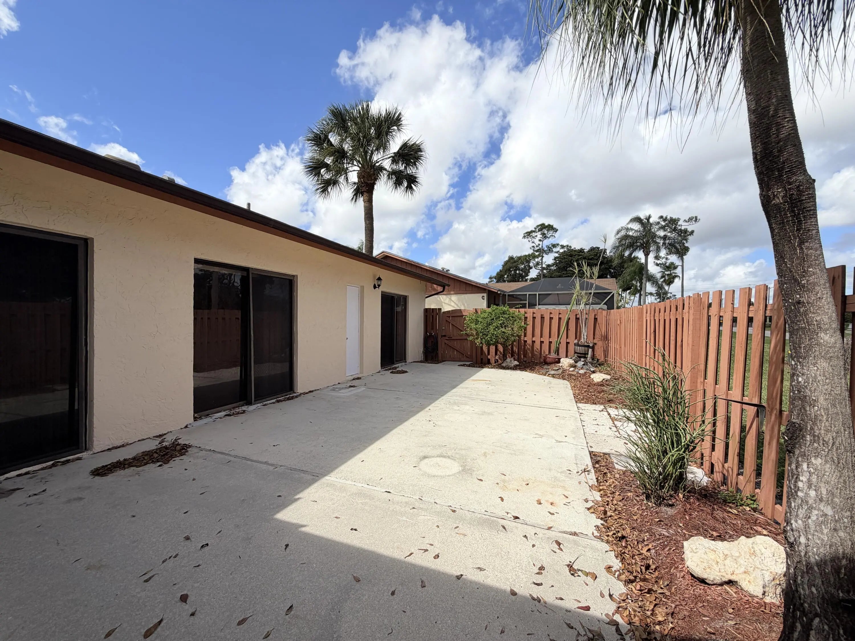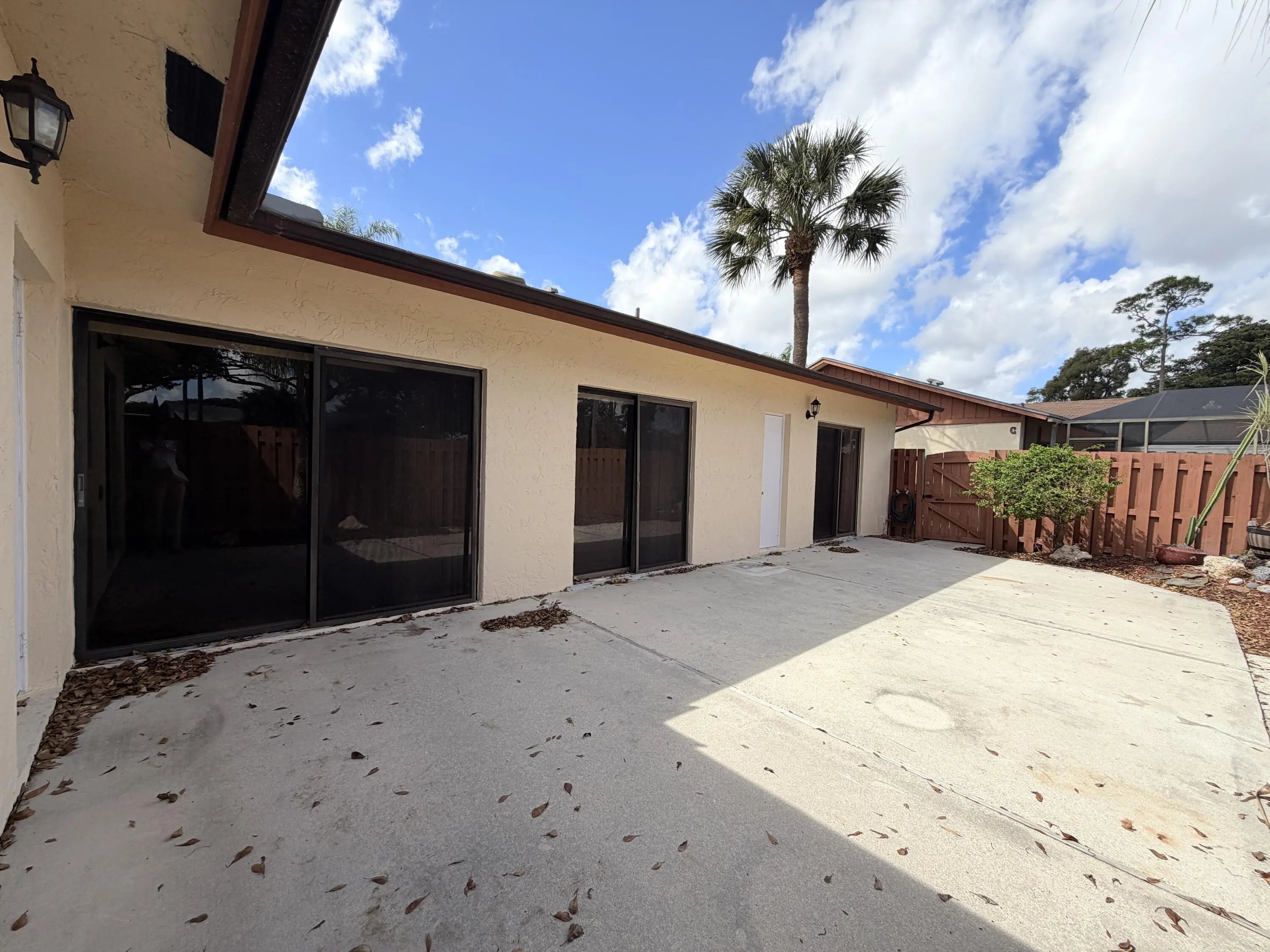 WELCOME HOME to this beautifully maintained 3 bedroom, 2 bathroom villa offering comfort, privacy, and a spacious layout designed for easy living. Freshly painted with new vinyl flooring and no carpeting throughout. The home features a bright, open feel with vaulted ceilings, modern lighting, and ceiling fans that enhance the airy atmosphere. The dining area is highlighted by a stylish chandelier, while the kitchen offers plenty of cabinetry, black appliances, and an open flow to the living area, making it perfect for both everyday living and entertaining. The thoughtfully designed split floor plan places the primary suite in its own private wing, complete with vaulted ceilings, a master bathroom with a large vanity, shower/tub combo, a walk-in closet, and sliding glass doors overlookin the patio. The second largest bedroom features a walk-in closet for excellent storage while over looking the patio. The guest bathroom doubles as a cabana bath with a walk-in shower and direct access to the patio. And the third bedroom is in middle with a slider door to the patio as well. Additional features include a coat closet at the front entrance, a pantry, high hat lighting in the bedrooms and living room, and a brand new stackable washer and dryer along with a new water heater. One of the standout features of this home is the oversized fenced patio, offering exceptional outdoor living space with three sliding glass doors leading outside and door to the cabana bathroom. With a new fence being installed, this private outdoor area is perfect for gardening, relaxing, or entertaining guests, and even provides the option to install a private in-ground pool if desired. The property is tucked in a private location with low monthly maintenance, making it ideal for both full-time residents and seasonal owners. Located in a highly convenient area near shopping, dining, parks, and major roadways, residents enjoy easy access to everything Palm Beach County has to offer while still enjoying the quiet comfort of a residential community. This charming villa is clean, inviting, and ready for its next owner to add their personal touch.