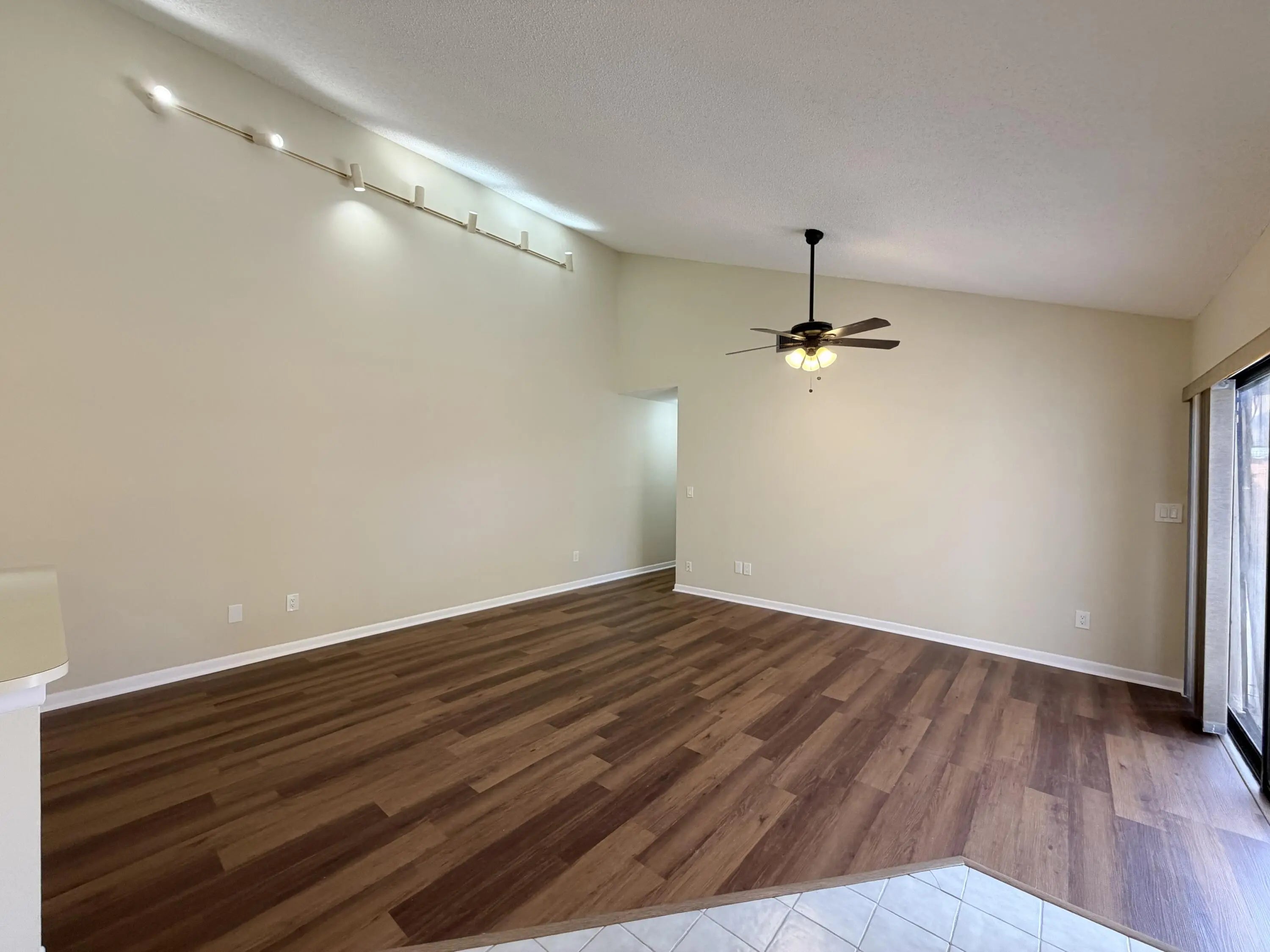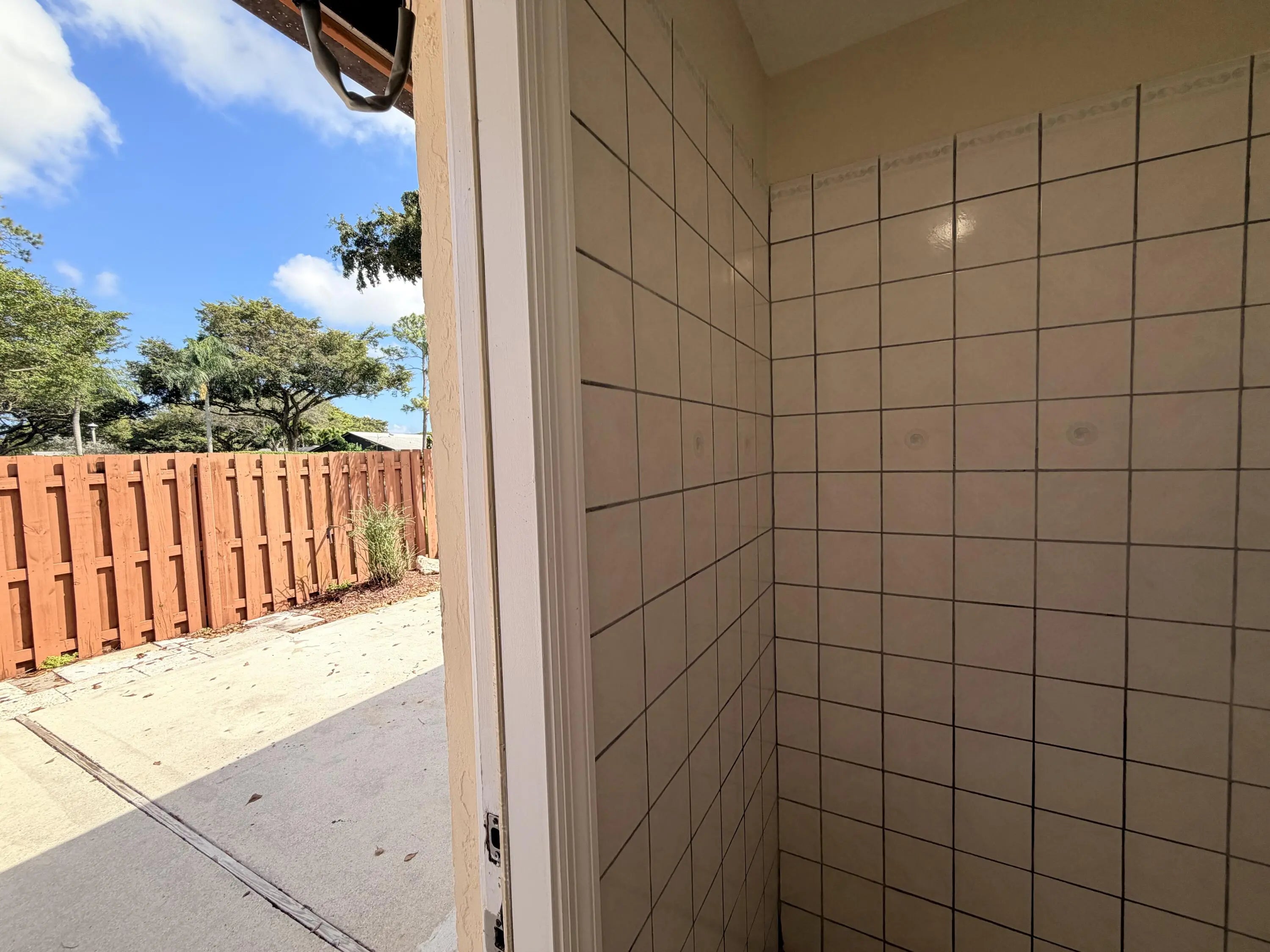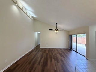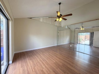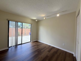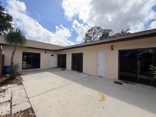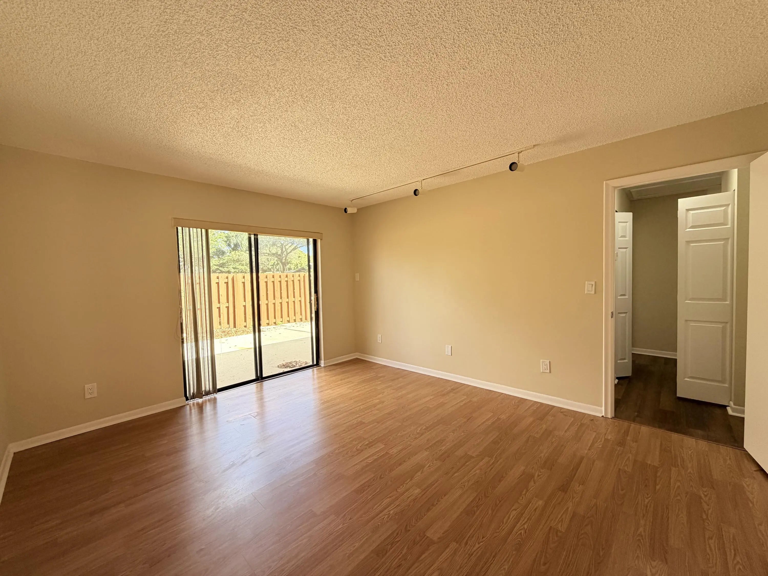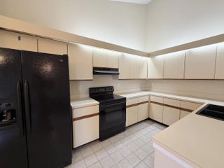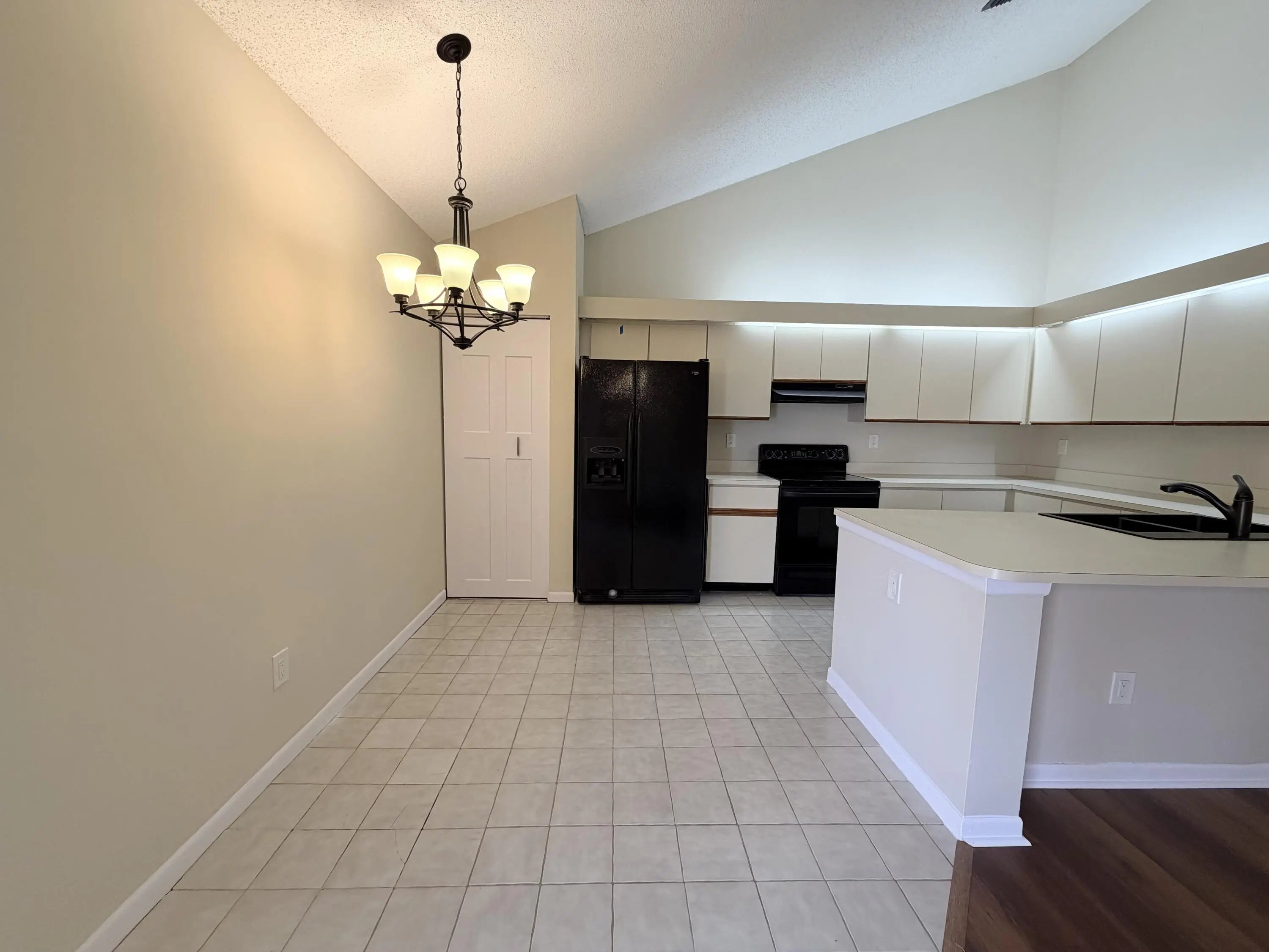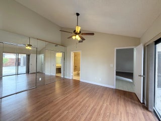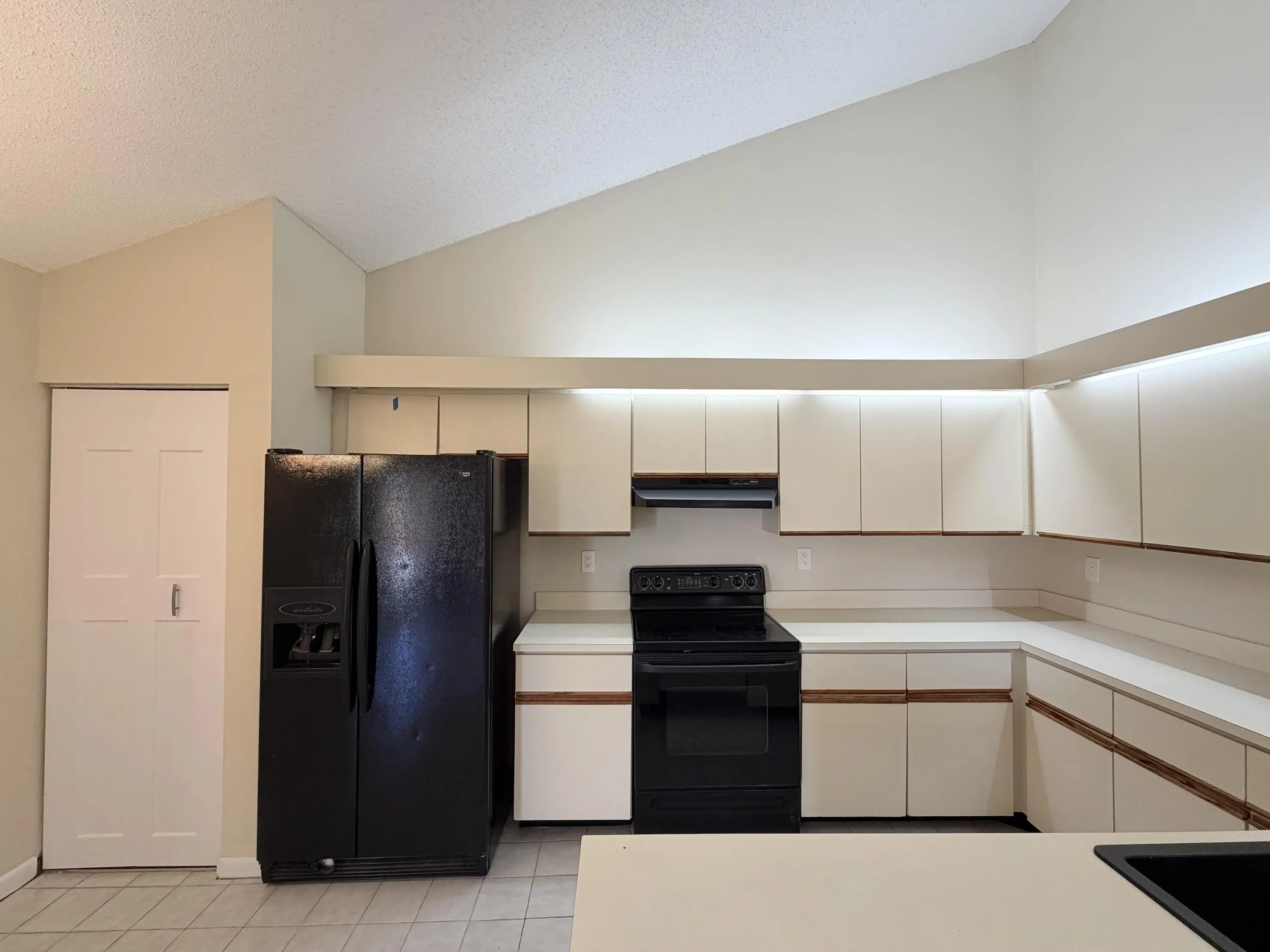 WELCOME HOME to this beautifully maintained 3 bedroom, 2 bathroom villa offering comfort, privacy, and a spacious layout designed for easy living. Freshly painted with new vinyl flooring and no carpeting throughout. The home features a bright, open feel with vaulted ceilings, modern lighting, and ceiling fans that enhance the airy atmosphere. The dining area is highlighted by a stylish chandelier, while the kitchen offers plenty of cabinetry, black appliances, and an open flow to the living area, making it perfect for both everyday living and entertaining. The thoughtfully designed split floor plan places the primary suite in its own private wing, complete with vaulted ceilings, a master bathroom with a large vanity, shower/tub combo, a walk-in closet, and sliding glass doors overlookin the patio. The second largest bedroom features a walk-in closet for excellent storage while over looking the patio. The guest bathroom doubles as a cabana bath with a walk-in shower and direct access to the patio. And the third bedroom is in middle with a slider door to the patio as well. Additional features include a coat closet at the front entrance, a pantry, high hat lighting in the bedrooms and living room, and a brand new stackable washer and dryer along with a new water heater. One of the standout features of this home is the oversized fenced patio, offering exceptional outdoor living space with three sliding glass doors leading outside and door to the cabana bathroom. With a new fence being installed, this private outdoor area is perfect for gardening, relaxing, or entertaining guests, and even provides the option to install a private in-ground pool if desired. The property is tucked in a private location with low monthly maintenance, making it ideal for both full-time residents and seasonal owners. Located in a highly convenient area near shopping, dining, parks, and major roadways, residents enjoy easy access to everything Palm Beach County has to offer while still enjoying the quiet comfort of a residential community. This charming villa is clean, inviting, and ready for its next owner to add their personal touch.