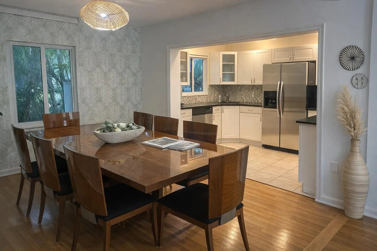 Available for rent at $10,000/month. Beautifully updated 2-bed, 2-bath mid-century modern home in the highly sought-after SoSo (South of Southern) neighborhood of West Palm Beach. Features include vaulted ceilings with exposed beams, hardwood floors, an updated kitchen with stainless-steel appliances, and abundant natural light throughout. Enjoy a private tropical backyard with a heated saltwater pool, perfect for entertaining or relaxing. Detached carport, central AC, and prime location just minutes from downtown, the Intracoastal, Palm Beach, and PBI. This rental is AVAILABLE FEBRUARY, MARCH, and APRIL 2026!