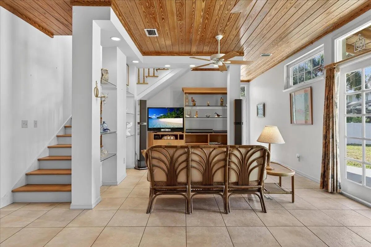 Imagine your life by the beach in this Hutchinson Island home. Wake up to sunrises over the ocean and end your days with golden sunsets from your private rooftop balcony. Whether you enjoy shelling, surfing, fishing, or hiking, this island sanctuary offers the ultimate coastal lifestyle.This home radiates warmth with oak tongue-and-groove ceilings and custom cabinetry with an open-concept layout that flows naturally. French doors open to an enclosed patio, filling the home with natural light. The smart split floor plan features a first floor master bedroom and two guest rooms, while the entire second floor is dedicated to a massive private master suite. This island home features: Two Garage Bays, Tile Floors, Roof 2013, Water Heater 2013, HVAC 2023, Complete Storm Panels, and a Shed.