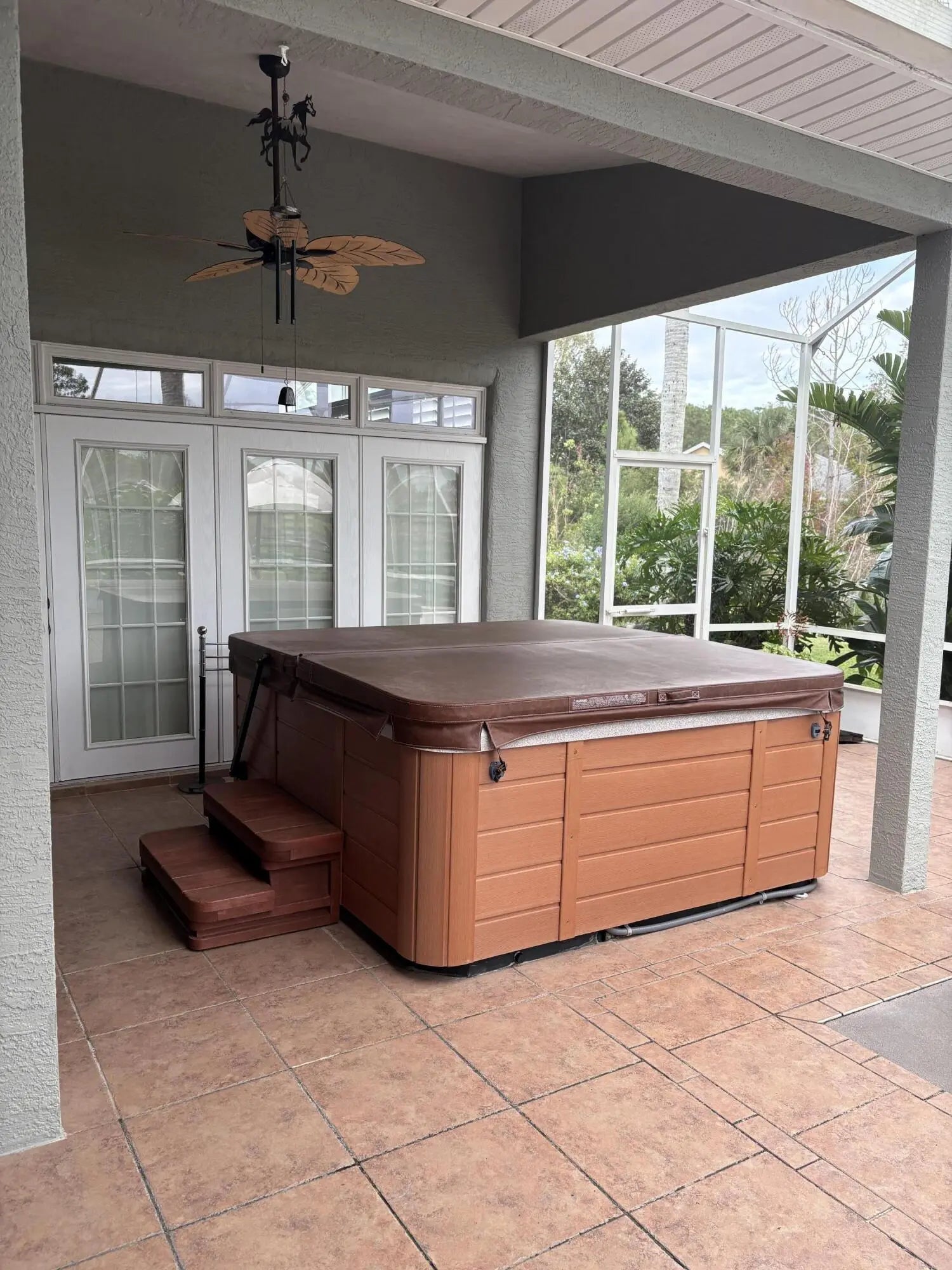 Elegant 3-bedroom, 2-bath residence tucked away on a quiet cul-de-sac in the prestigious, guard-gated Breakaway Trails community. Offering 2,073 sq ft of refined living space, this thoughtfully designed split floor plan features soaring ceilings, crown molding, and an abundance of natural light. The upgraded kitchen showcases granite countertops, solid wood cabinetry, and stainless steel appliances. Notable improvements include a newer roof and impact-rated windows (2022), The solar panels are fully paid, and a new water heater (2024). The expansive primary suite offers dual vanities, a soaking tub, walk-in shower, and generous walk-in closets. Enjoy private outdoor living in the screened patio with hot tub and outdoor kitchen. Oversized garage with workshop. Breakaway Trails offers resort-style amenities including a clubhouse, community pool, and beautifully maintained grounds, all conveniently located near beaches, shopping, dining, and major roadways. This home is a must-see.