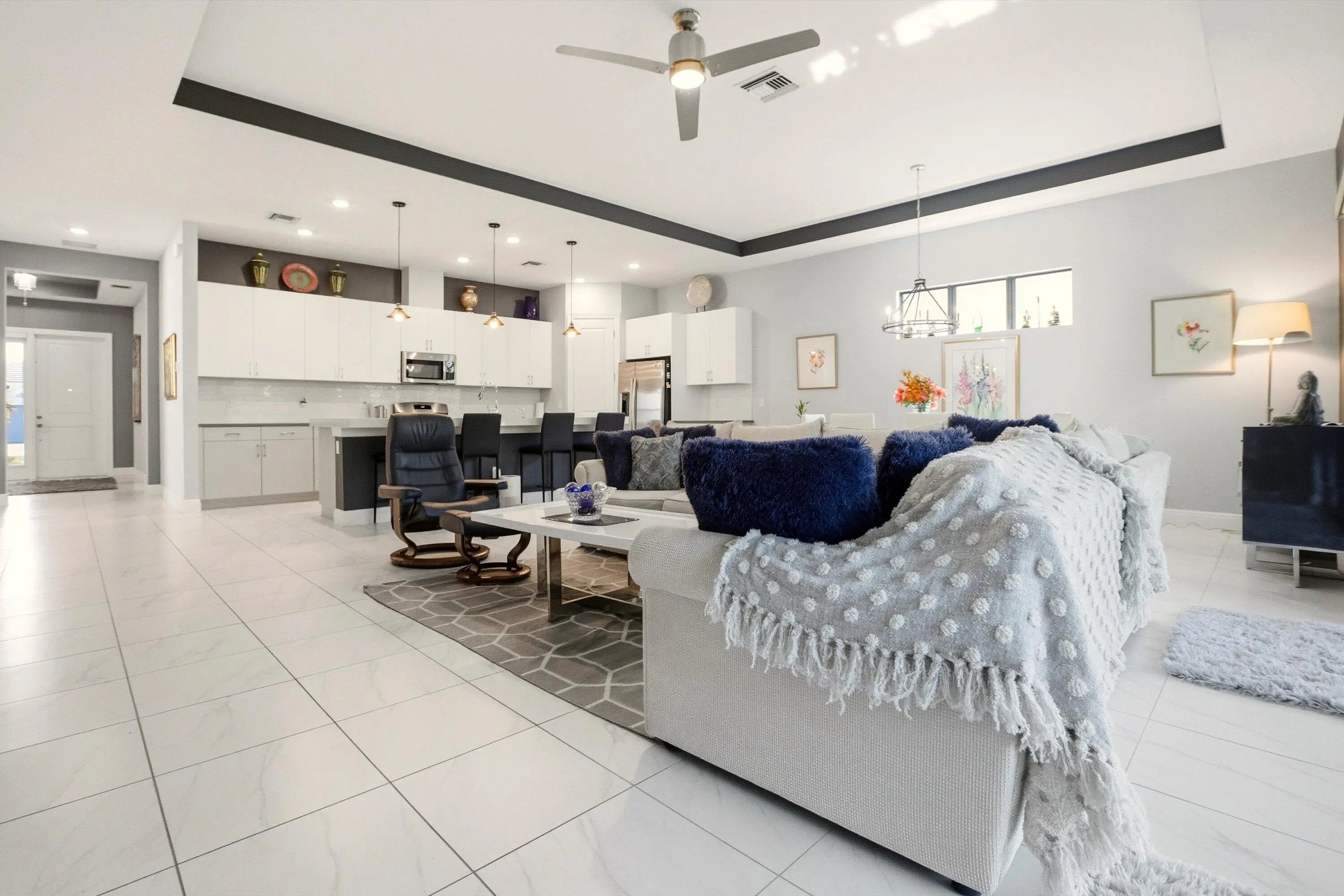 * MOTIVATED SELLER* Located within the 55+ community of Cresswind Palm Beach, this pristine Fiesta Model is set on a large, fully fenced homesite and offers a thoughtful blend of upgrades, comfort, and low-maintenance living. The home features 3 bedrooms, 3 full bathrooms, and a separate den, all within an open layout enhanced by high ceilings and tile flooring throughout. The kitchen is designed for both everyday use and entertaining, featuring two-tone soft-close cabinetry, an expansive quartz work surface, stainless steel appliances, and quartz countertops throughout the home. The open living and dining areas flow seamlessly, creating a bright and inviting space. The primary suite offers a generously sized walk-in shower with zero-entry access, and beautifully upgraded finishes. Guest bedrooms are well proportioned and paired with full baths, providing flexibility for visitors or additional living space. Notable upgrades include impact windows and doors, a tankless water heater, epoxy-finished garage flooring, and a 220V electric vehicle charging outlet. Enjoy the covered lanai overlooking a private backyard with ample room to add a future pool or outdoor living area. Residents enjoy HOA-included high-speed internet, full lawn care, and access to two exceptional amenity centers. The community clubhouse, led by a full-time lifestyle director, features a SmartFIT Training Center powered by EGYM, event and game rooms, an arts and crafts studio, pickleball and tennis courts, a dog park, resort-style and resistance pools, a spa, and an outdoor event plaza. Ownership also includes access to Westlake's renowned Adventure Park, showcasing a lagoon-style pool with a three-story slide, splash pad, cabanas, outdoor concert pavilion, basketball courts, an adult-only lodge-style pool, playgrounds, dog parks, and a BMX pump park.