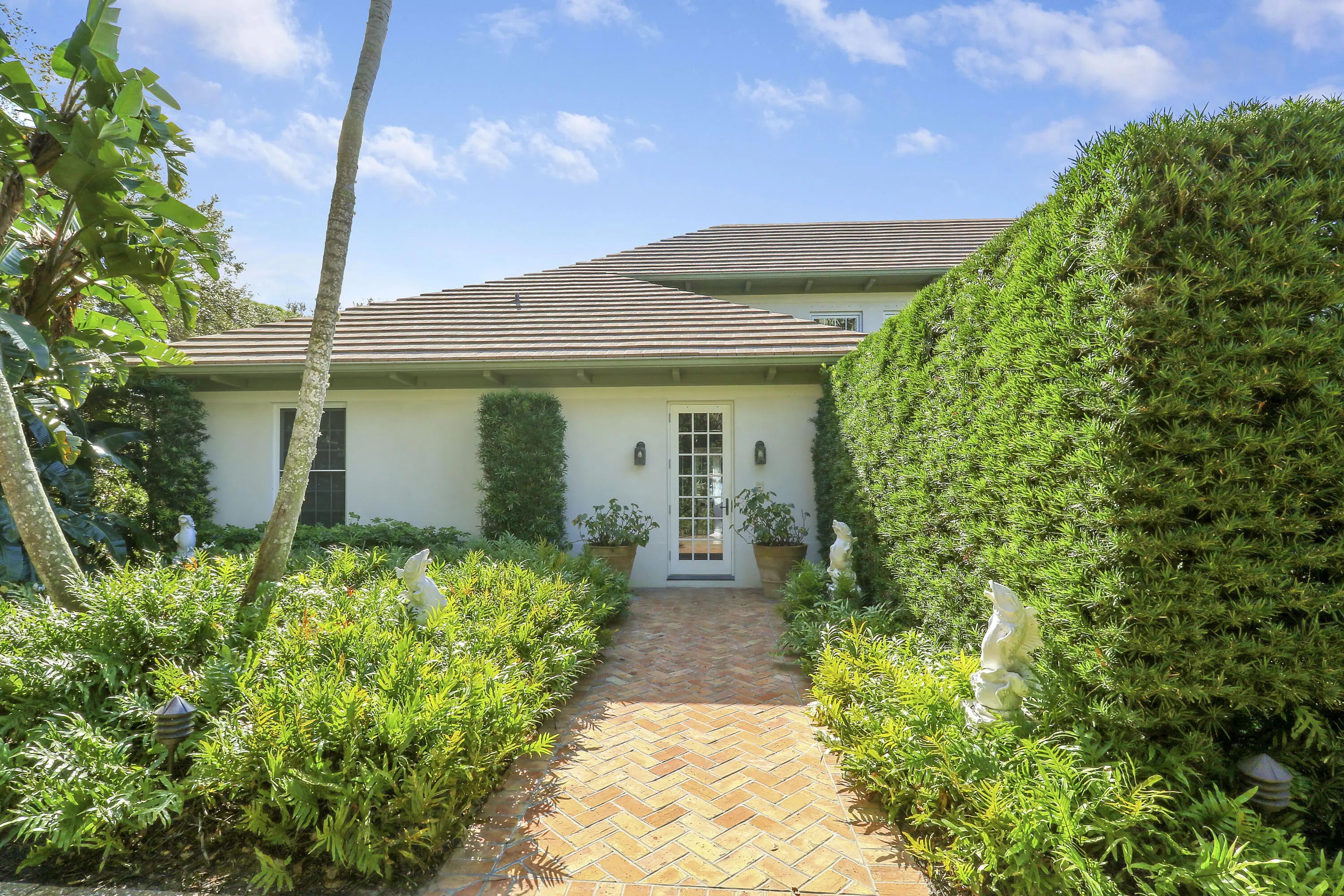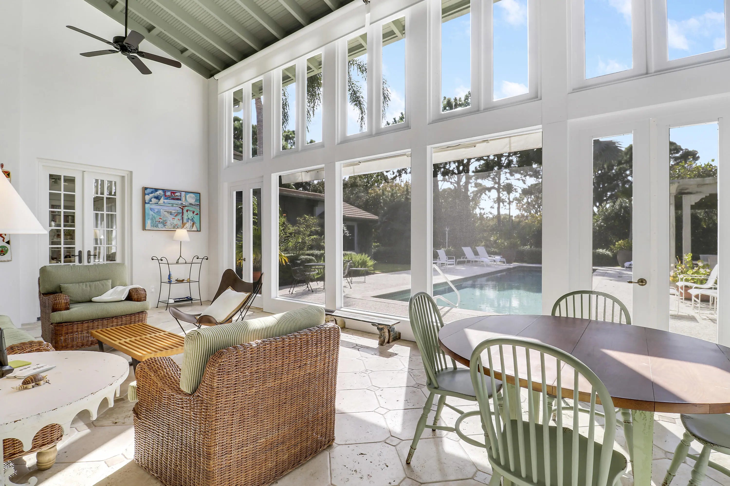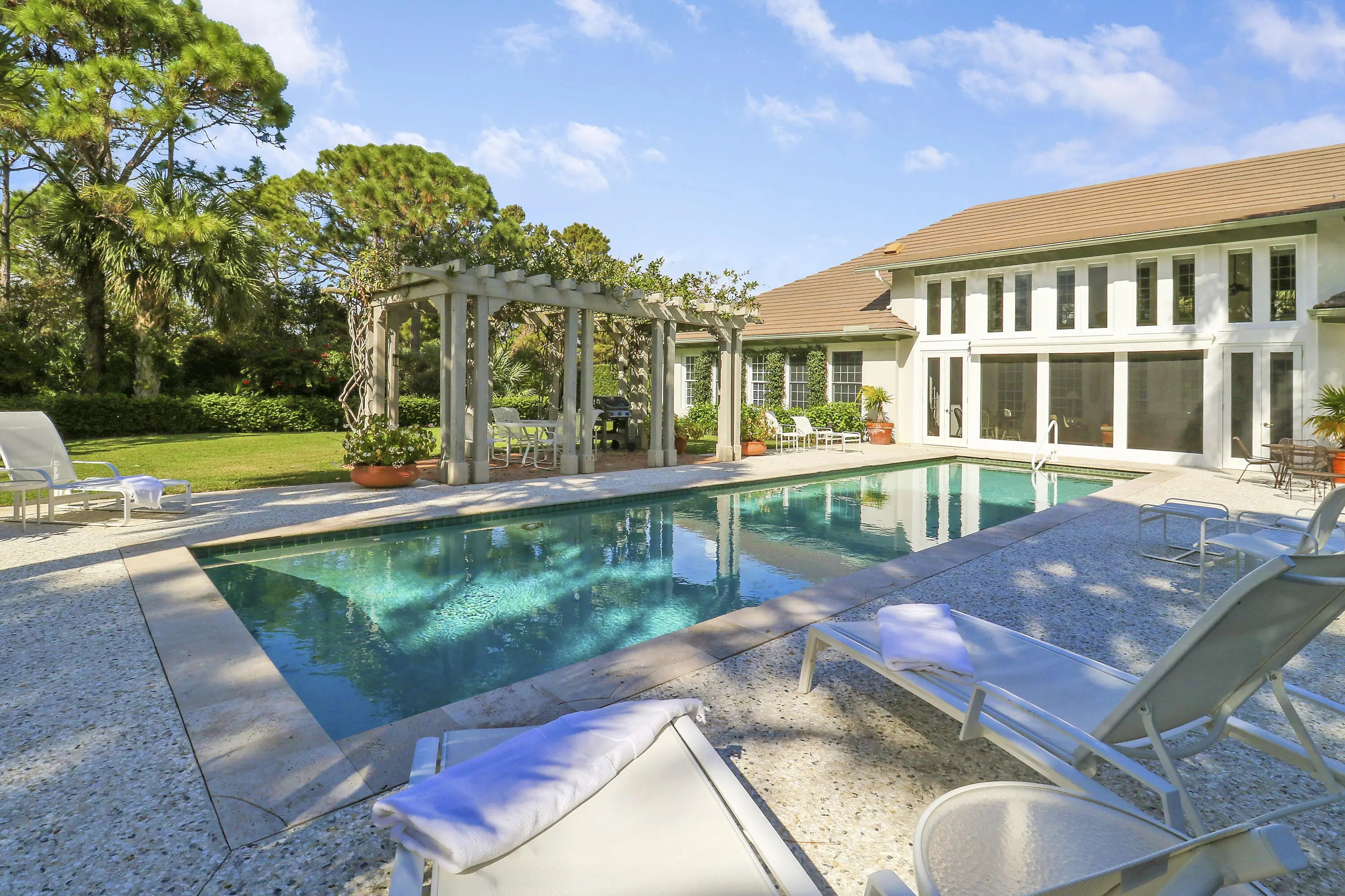 Situated on an expansive double lot totaling 1.37 acres, this inviting property offers privacy, flexibility, and room to enjoy outdoor living. The main residence features two bedrooms and two-and-a-half baths, with hardwood floors throughout the main living areas and soaring volume ceilings that enhance the bright, open great room. A screened, covered loggia overlooks the pool, creating a seamless indoor-outdoor living experience ideal for relaxing or entertaining. A detached guest house adds exceptional versatility, offering two bedrooms and two full baths, perfect for hosting guests, extended family, or creating a private work-from-home retreat. With generous living spaces, a resort-style pool, and a rare oversized lot, this property presents a unique opportunity to enjoy comfort, space