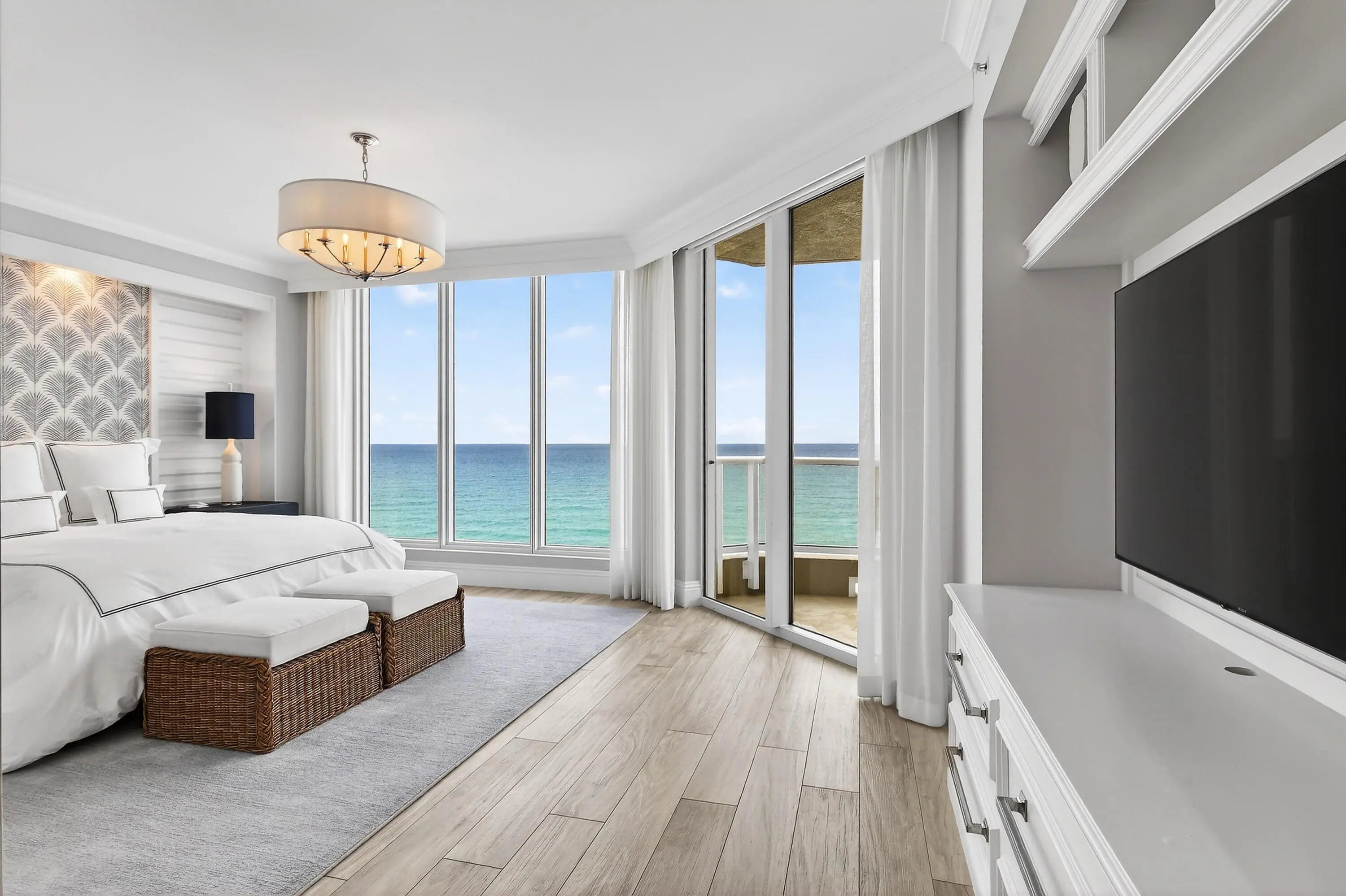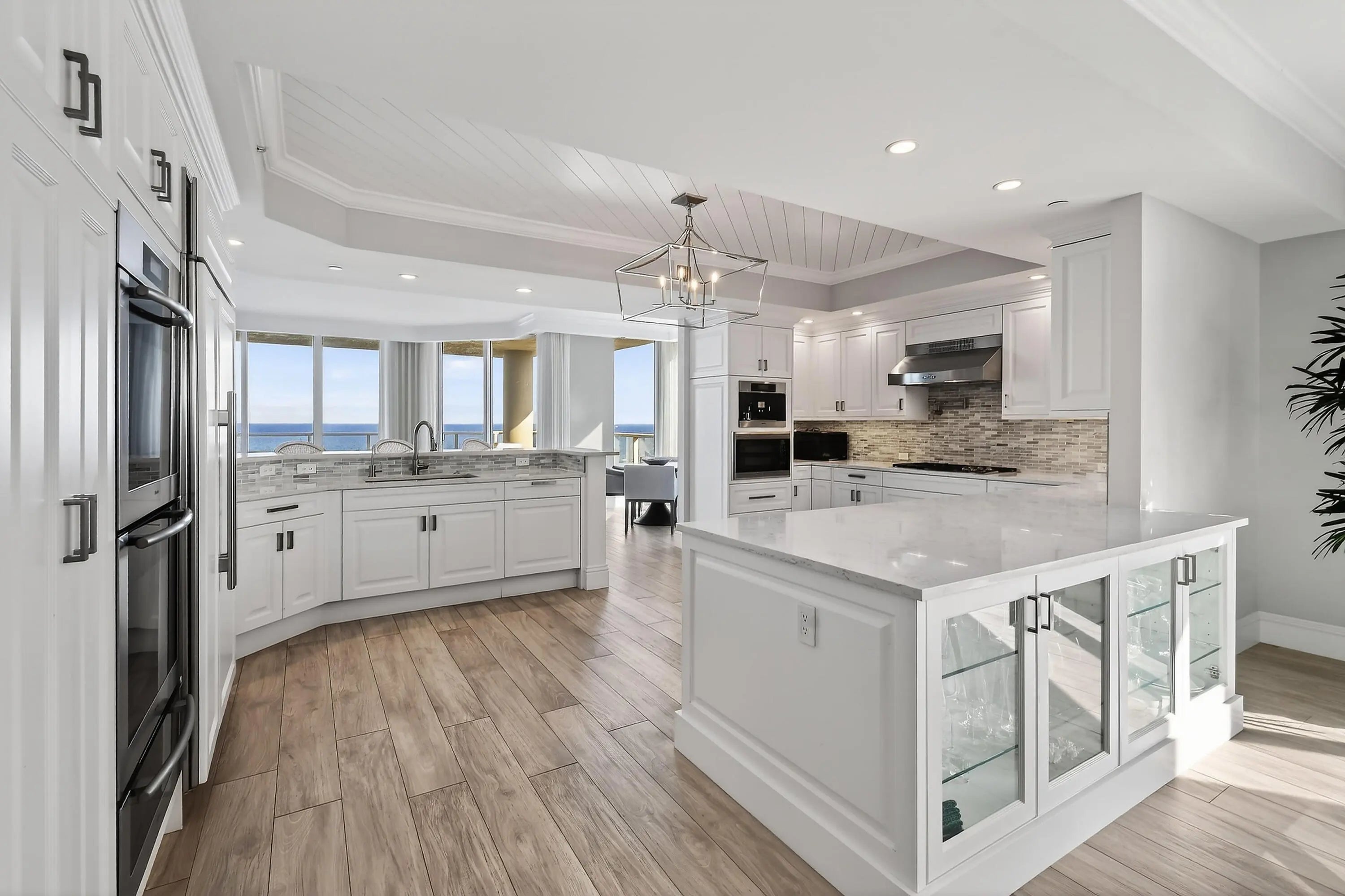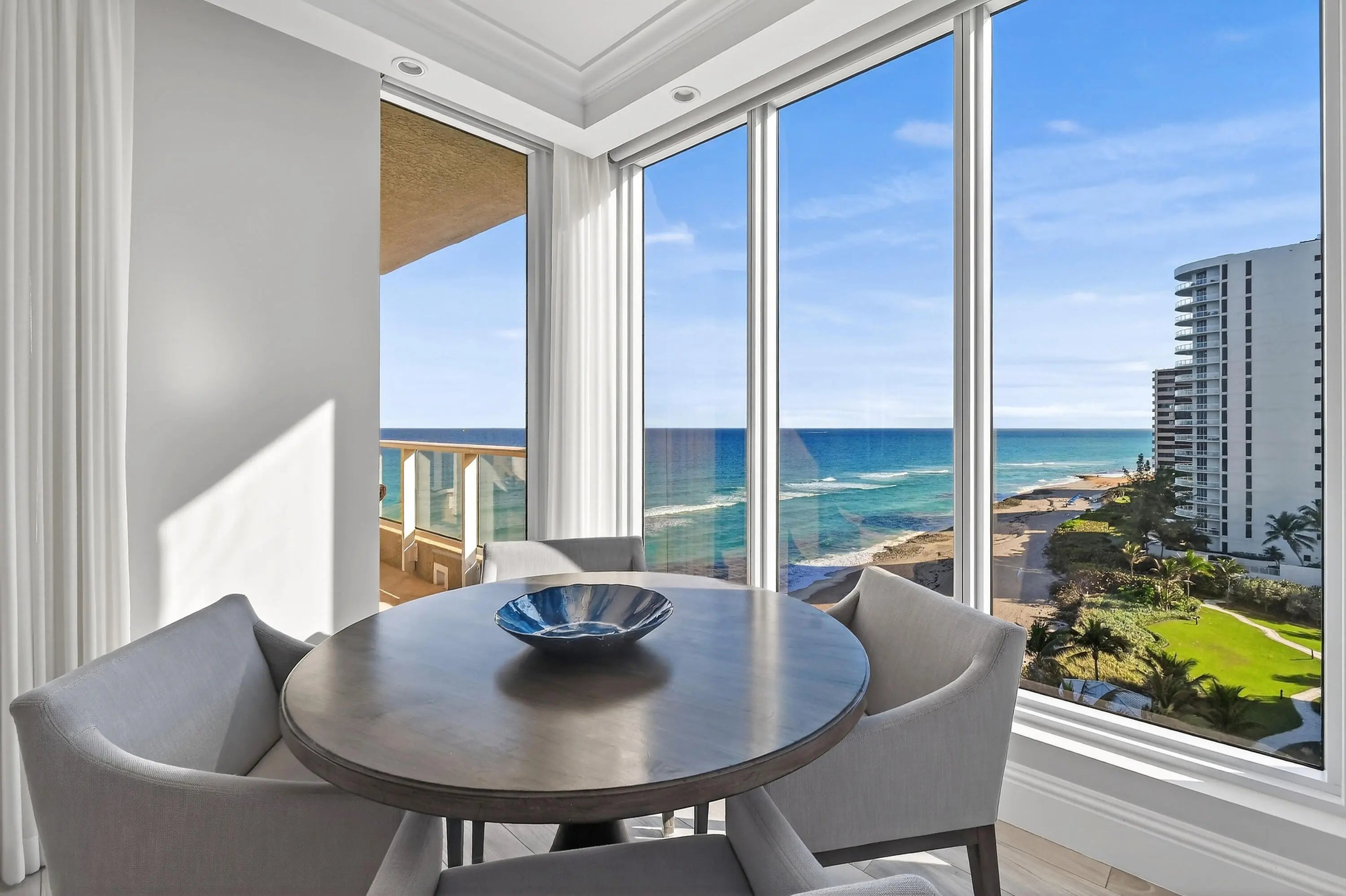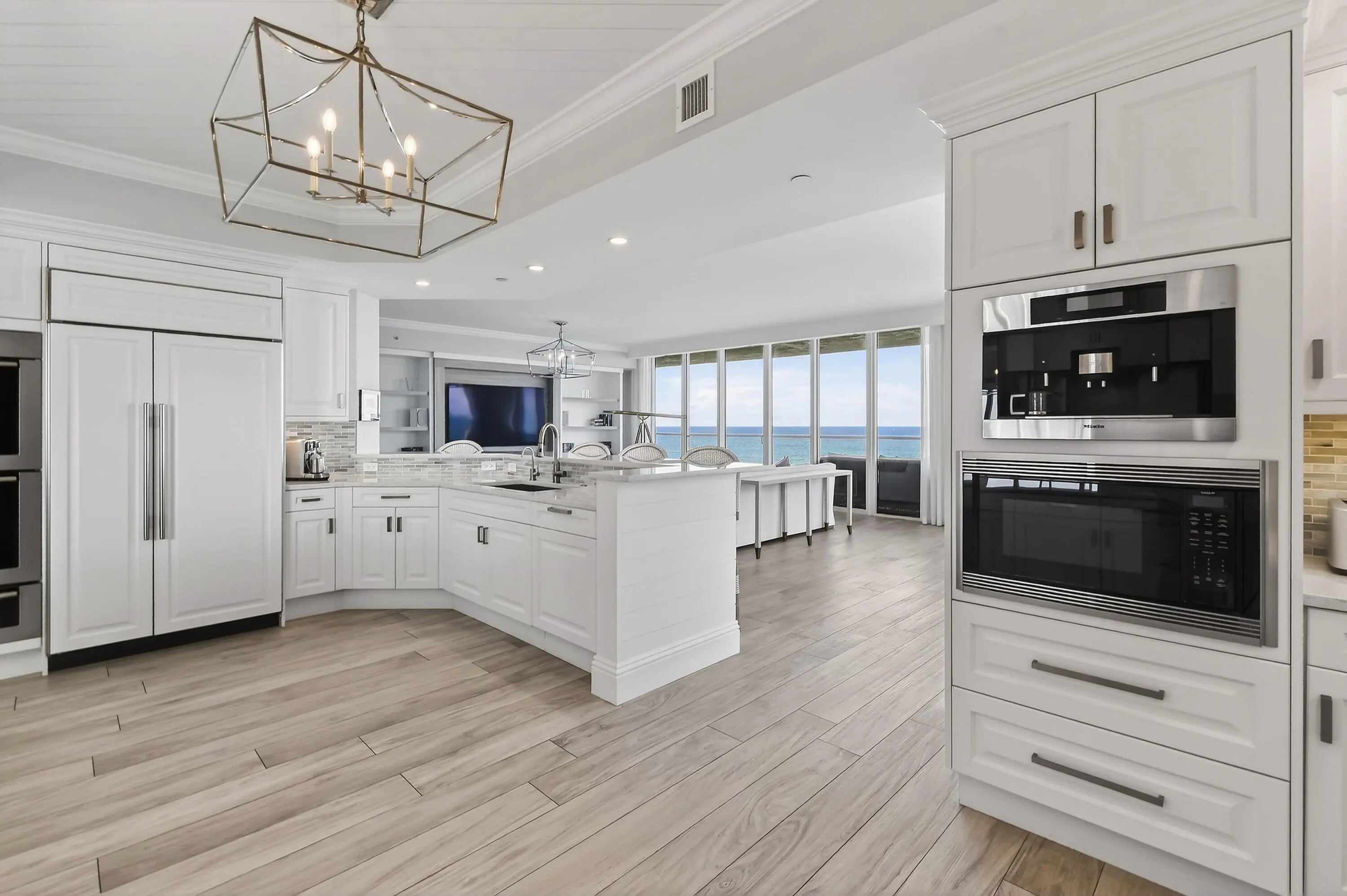 This exceptional 3-bedroom, 3.5-bath oceanfront residence offers approximately 3,100+ square feet of refined living space within the boutique Ocean's Edge building and truly lives like a private home. A private elevator opens directly into the main foyer, where split French doors introduce luminous interiors defined by direct Atlantic Ocean views, floor-to-ceiling impact glass, statement chandelier fixtures, and white shiplap tray ceilings that establish a serene coastal aesthetic inspired by soft whites and baby blues. Elegant crown moulding, coffered ceilings, and thoughtfully layered architectural detailing elevate the home's timeless design while maintaining a relaxed yet sophisticated seaside elegance. The open-concept living and dining areas are framed by sweeping panoramic ocean vistas and finished with porcelain wood-grain plank flooring, custom recessed lighting, and a built-in modern entertainment center. Fully integrated with a Control4 smart-home system, the residence offers phone-operated control of lighting, HVAC, television, and a Sonos sound system. Main living area and primary bedroom offer remote electric shades. Walls of glass open seamlessly to an expansive oceanfront terrace, accessible from both the main living area and the primary suite, creating an effortless indoor-outdoor lifestyle ideal for entertaining or quiet moments overlooking the sea. Multiple dining spaces are thoughtfully incorporated throughout the home, including a formal dining area, a breakfast nook positioned at the edge of the ocean, and an expansive kitchen peninsulaoffering versatility for intimate meals or hosting on a grander scale. The gourmet chef's kitchen is anchored by an exceptional appliance suite, including a Miele double oven with warming drawer, Miele built-in coffee maker, Wolf gas cooktop, Wolf microwave, Bosch dishwasher, and a Sub-Zero refrigerator and wine cooler. Additional features include a built-in filtered water dispenser and garbage disposal, along with decorative tile backsplash, custom cabinetry, generous prep space, and refined under-counter storage with glass display doors along the formal dining sidemaking the kitchen both a functional workspace and an elegant focal point for gathering. The primary suite serves as a serene oceanfront retreat, offering direct ocean views, private terrace access, a decorative feature wall with custom dimmable lighting. A thoughtfully designed coffee bar with U-Line under-counter refrigerator enhances everyday comfort. The spa-inspired bath is complemented by an oversized walk-in closet with custom built-in shelving, providing exceptional storage and organization. The guest wing is equally impressive, offering privacy and comfort with two ensuite bedrooms that capture city skyline and Intracoastal views, enhanced by designer finishes and custom built-in wall shelving. This layout balances scale and livabilityreinforcing the residence's rare ability to feel both expansive and intimate, truly living like a single-family home in the sky. Additional features include a full-size laundry room with LG washer and dryer and ample storage throughout. With only 40 exclusive residences, Ocean's Edge delivers a boutique, resort-style experience that redefines oceanfront living. Amenities include a heated oceanfront pool and spa, outdoor grilling area, state-of-the-art fitness center, private movie theater, elegant social room. A 24-hour manned security gate, concierge service, and controlled-access parking provide exceptional peace of mind, while private gated access leads directly to Singer Island's pristine white-sand beaches. Beach loungers and umbrella service provided. Beyond the residence, Singer Island offers a vibrant coastal lifestyle with access to John D. MacArthur Beach State Park, championship golf courses, and world-class shopping and dining in Palm Beach Gardens and on Worth Avenue in Palm Beach. Conveniently located near Palm Beach International Airport, Ocean's Edge seamlessly blends tropical serenity with cosmopolitan convenienceoffering the ultimate expression of South Florida's oceanfront lifestyle. Ocean's Edge is not subject to building inspections, as they apply only to structures 25 years or older. The building's two-year concrete restoration project was completed in October 2024. The structural integrity reserve study and updated standard reserve study were completed last year. New seawall will be completed approximately March 1, 2026. All assessments have been paid. Call today to make this your home.