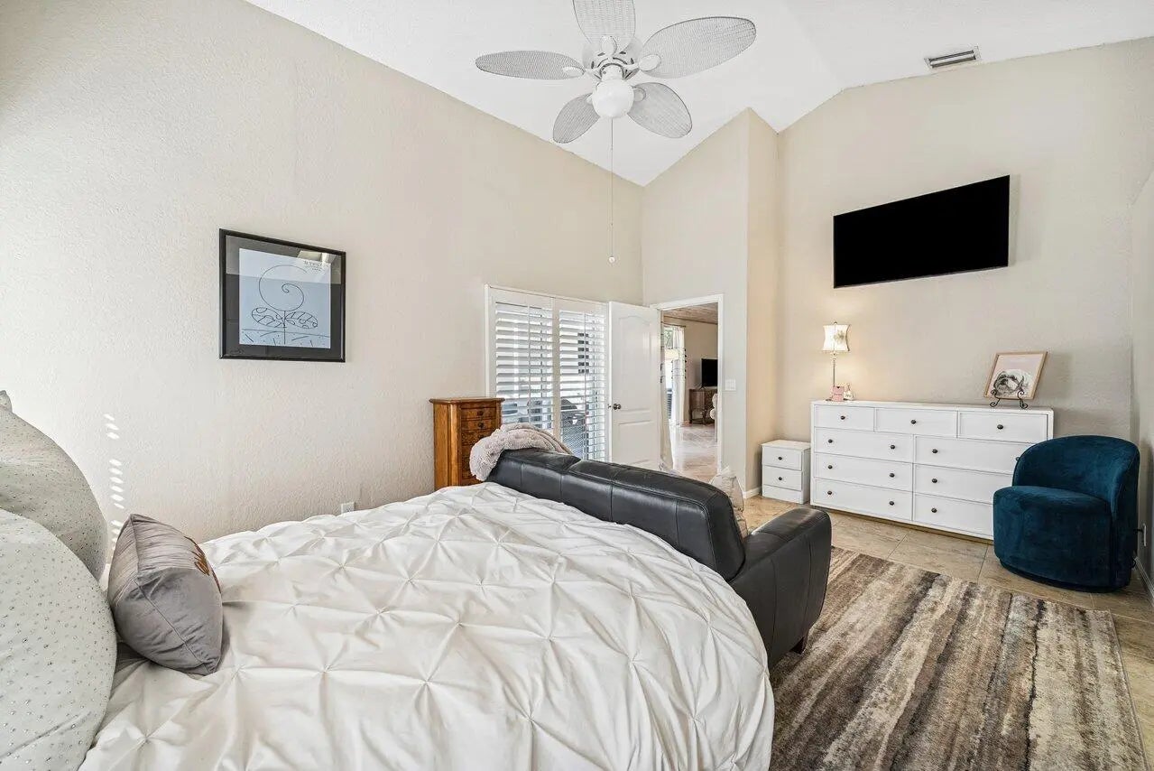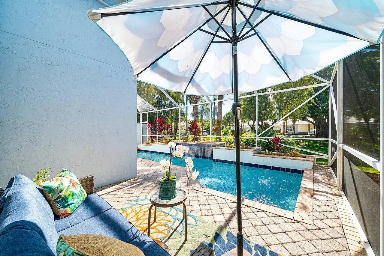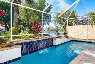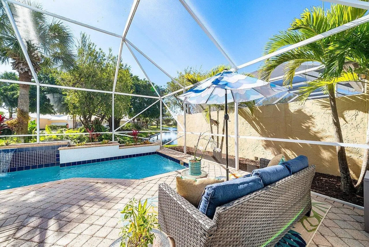 A beautifully updated residence in the gated community of Breakers West, offering comfort, style, and serene lake views with an expansive green space just beyond your backyard. Major improvements include a new roof (2022), new gutters (2022), a new A/C system (2026), a new pool pump and filter (2024), updated pool electrical (2026), and new pool enclosure screens (2026), providing peace of mind for years to come. Inside, the home features vaulted wood ceilings, tile flooring, and custom built-ins that anchor the spacious living room with warmth and character. The split floor plan enhances privacy and flow, making it ideal for both everyday living and entertaining guests. Step outside to a sparkling pool framed by tranquil water views -- the perfect backdrop for relaxed Florida living.