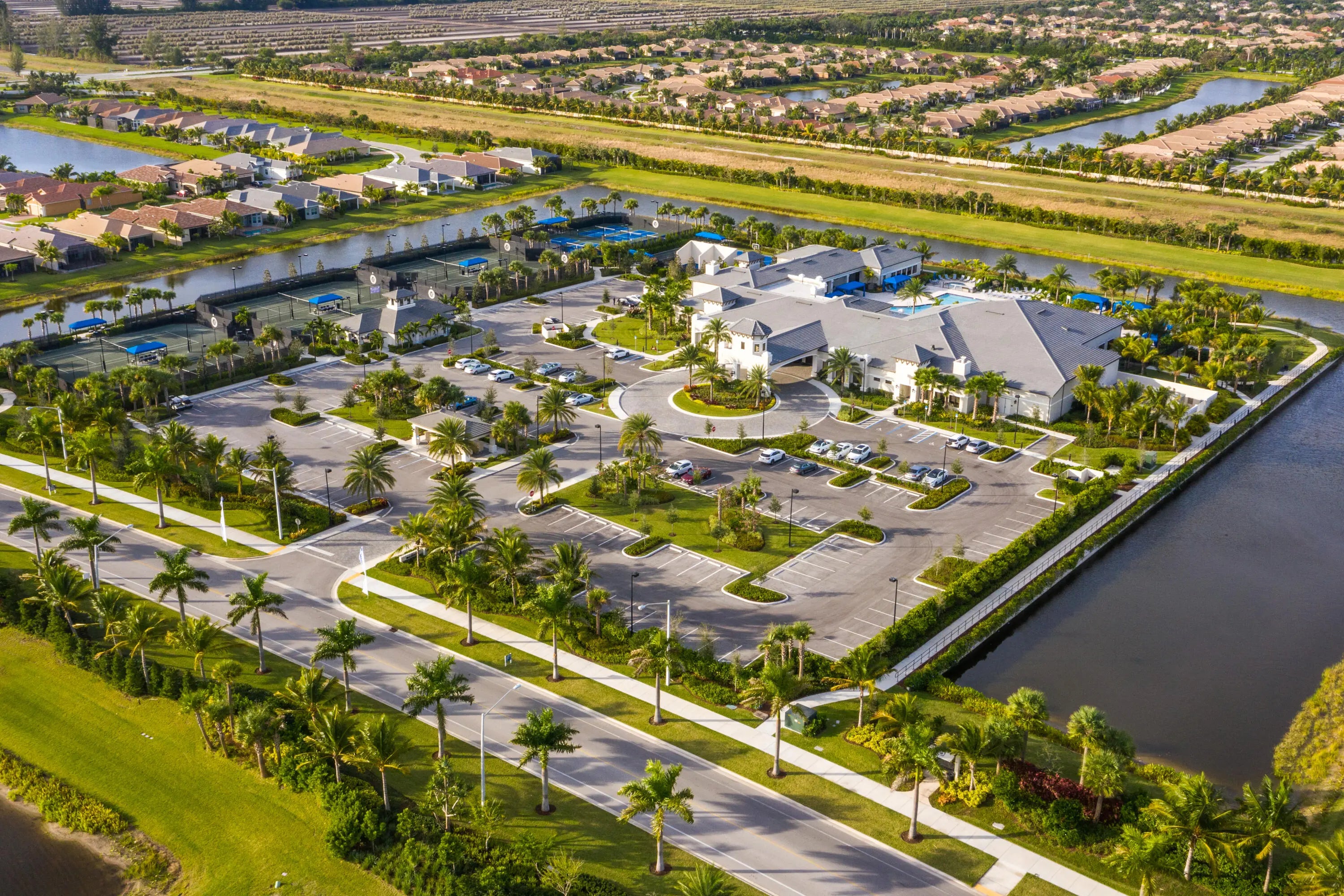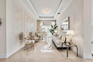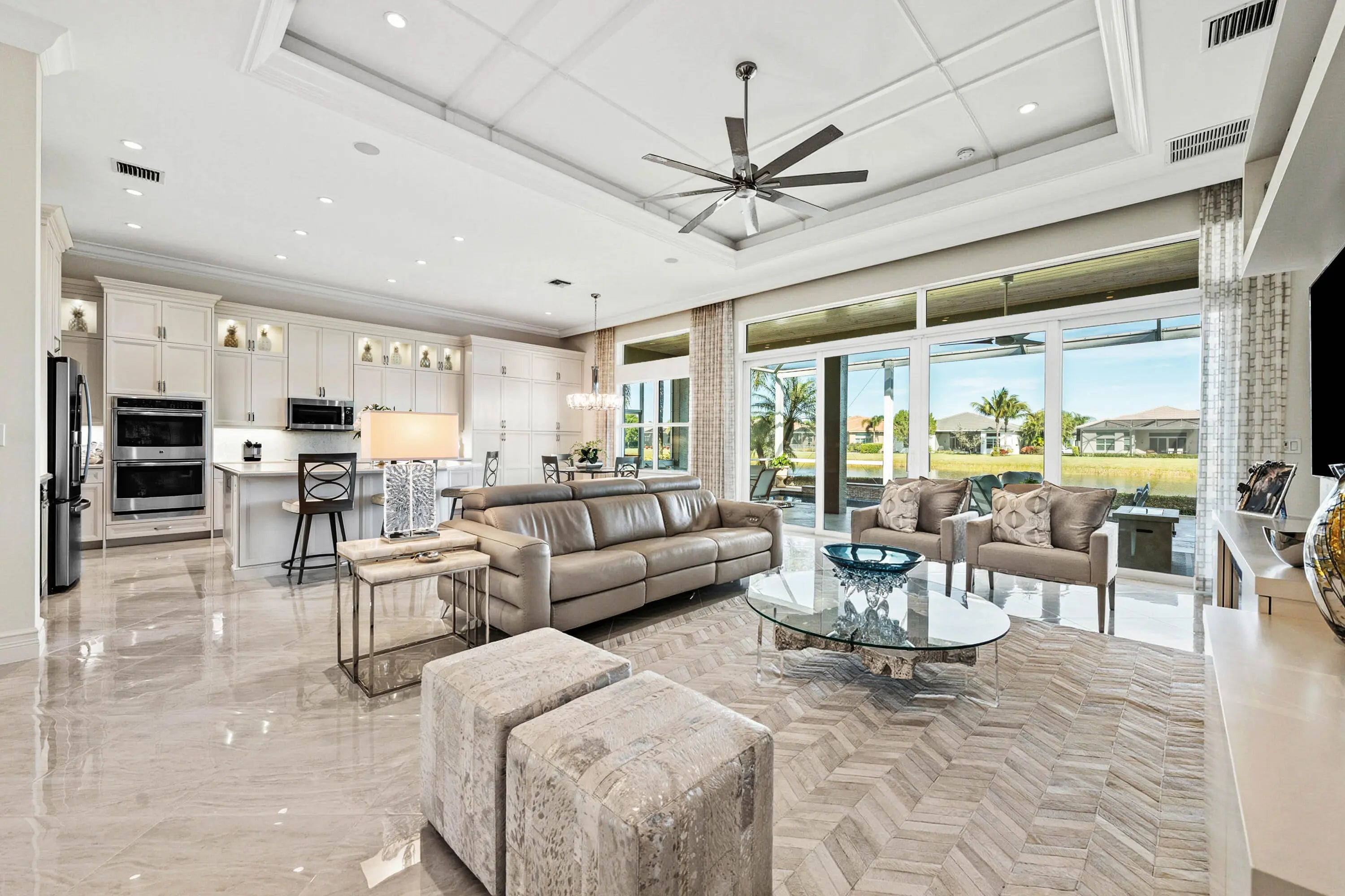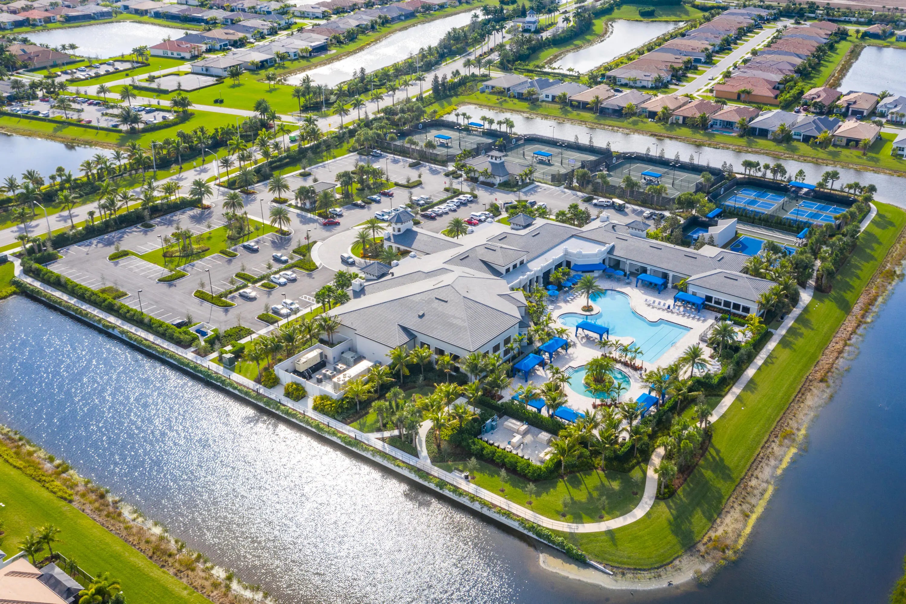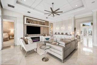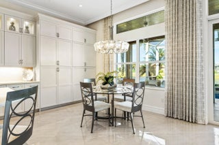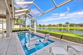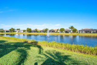 This model-perfect home sits on a beautiful lakefront lot. The stunning home (3/3+3cg) has great curb appeal with lush landscaping and leaded glass entry doors. Features include impact windows, 24'' porcelain floors, solid core doors, crown moldings, wall & ceiling treatments, LED hi-hats, designer light fixtures & window treatments, fans, custom built-ins, outfitted closets, upgraded baths & more! The chef's kitchen features white wood cabinets, quartz counters w/full height backsplash, counter depth snack bar, wine fridge, pull-outs, breakfast area & more! Luxurious primary suite. Two guest bedrooms - one is ensuite. The living room could be a den. You'll love the extended sandblasted marble patio, pool w/water feature, summer kitchen, birdcage with picture frame screen and lake views. *The home has a Whole-House Generator, new Maytag washer & dryer, two year new GE Profile dishwasher and three year new refrigerator.* Valencia Bay is a premier 55+ lifestyle community featuring a spectacular 33,000 square-foot clubhouse and 8 acre outdoor recreational facility. Endless activities and opportunities for fun abound - there are activities, trips, shows, and clubs of all types. The clubhouse features an expansive foyer and lobby, grand ballroom with raised stage, dance floor and two small bars, three spacious card rooms, Arts and crafts room with kiln, Billiards room/internet, Catering kitchen, Cooking studio, Men's and women's locker rooms with showers, Yoga & exercise studio and separate, fully equipped fitness center. There is a Cafe with indoor/outdoor seating and a large pool bar. There are three pools - a beautiful Resort-style pool with Swimmers' Lap Lanes and Shade Pavilions, Resistance walking pool, Grandchildren's wading pool, and an Outdoor whirlpool spa. There are six har-tru tennis courts with shade pavilions, tennis pro shop, tennis pro, league play, six pickleball courts with league play, 2 bocce courts, 2 handball courts, half-court basketball and walking/jogging/biking paths throughout and just outside the community. Valencia Bay is conveniently located near shopping, restaurants, houses of worship and major highways!
