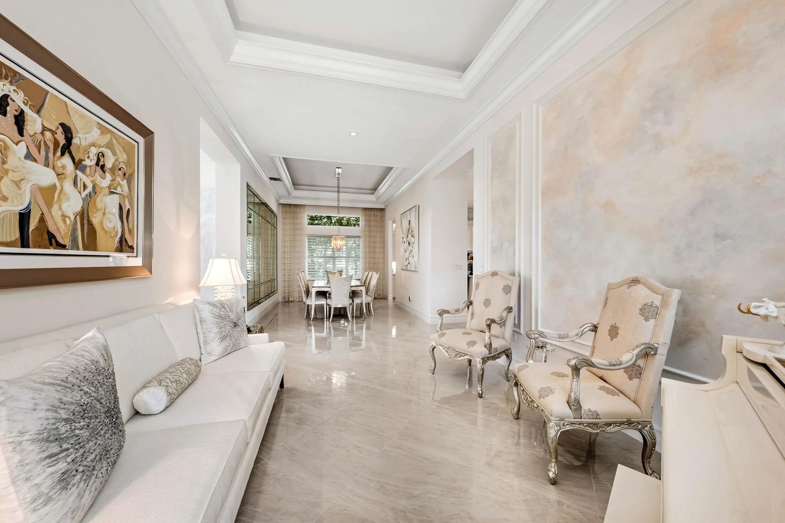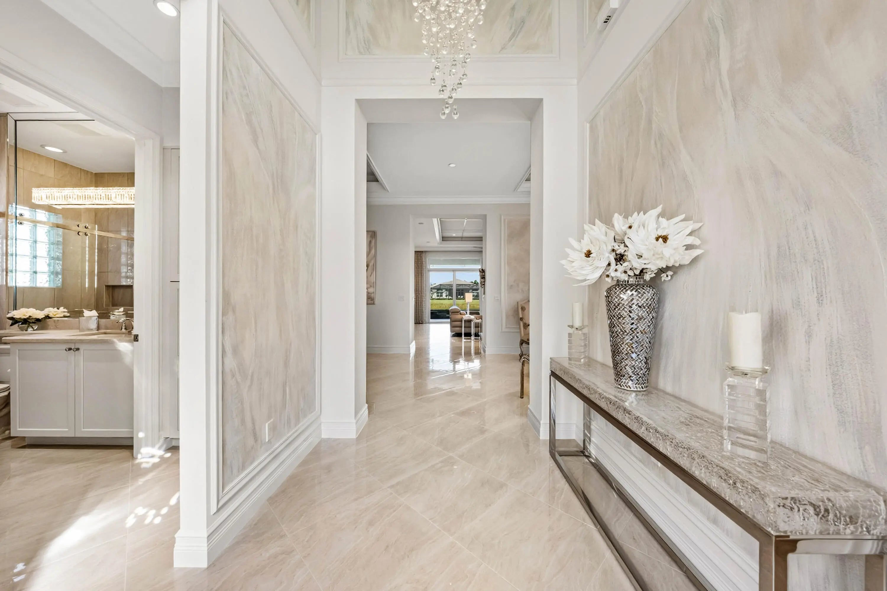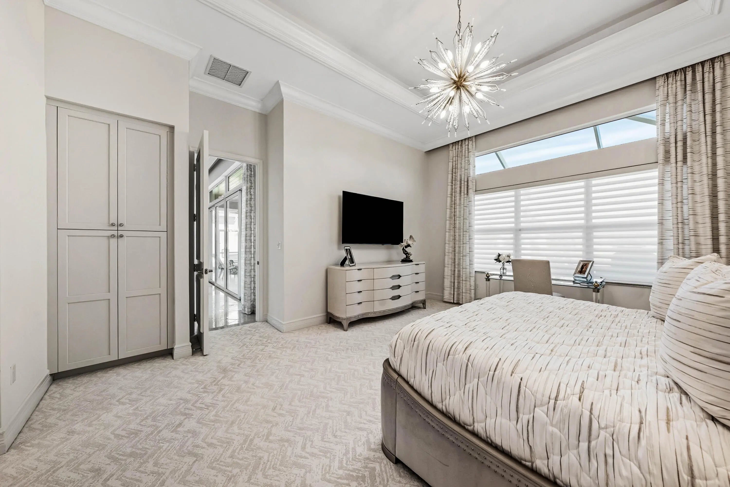 This model-perfect home sits on a beautiful lakefront lot. The stunning home (3/3+3cg) has great curb appeal with lush landscaping and leaded glass entry doors. Features include impact windows, 24'' porcelain floors, solid core doors, crown moldings, wall & ceiling treatments, LED hi-hats, designer light fixtures & window treatments, fans, custom built-ins, outfitted closets, upgraded baths & more! The chef's kitchen features white wood cabinets, quartz counters w/full height backsplash, counter depth snack bar, wine fridge, pull-outs, breakfast area & more! Luxurious primary suite. Two guest bedrooms - one is ensuite. The living room could be a den. You'll love the extended sandblasted marble patio, pool w/water feature, summer kitchen, birdcage with picture frame screen and lake views. *The home has a Whole-House Generator, new Maytag washer & dryer, two year new GE Profile dishwasher and three year new refrigerator.* Valencia Bay is a premier 55+ lifestyle community featuring a spectacular 33,000 square-foot clubhouse and 8 acre outdoor recreational facility. Endless activities and opportunities for fun abound - there are activities, trips, shows, and clubs of all types. The clubhouse features an expansive foyer and lobby, grand ballroom with raised stage, dance floor and two small bars, three spacious card rooms, Arts and crafts room with kiln, Billiards room/internet, Catering kitchen, Cooking studio, Men's and women's locker rooms with showers, Yoga & exercise studio and separate, fully equipped fitness center. There is a Cafe with indoor/outdoor seating and a large pool bar. There are three pools - a beautiful Resort-style pool with Swimmers' Lap Lanes and Shade Pavilions, Resistance walking pool, Grandchildren's wading pool, and an Outdoor whirlpool spa. There are six har-tru tennis courts with shade pavilions, tennis pro shop, tennis pro, league play, six pickleball courts with league play, 2 bocce courts, 2 handball courts, half-court basketball and walking/jogging/biking paths throughout and just outside the community. Valencia Bay is conveniently located near shopping, restaurants, houses of worship and major highways!