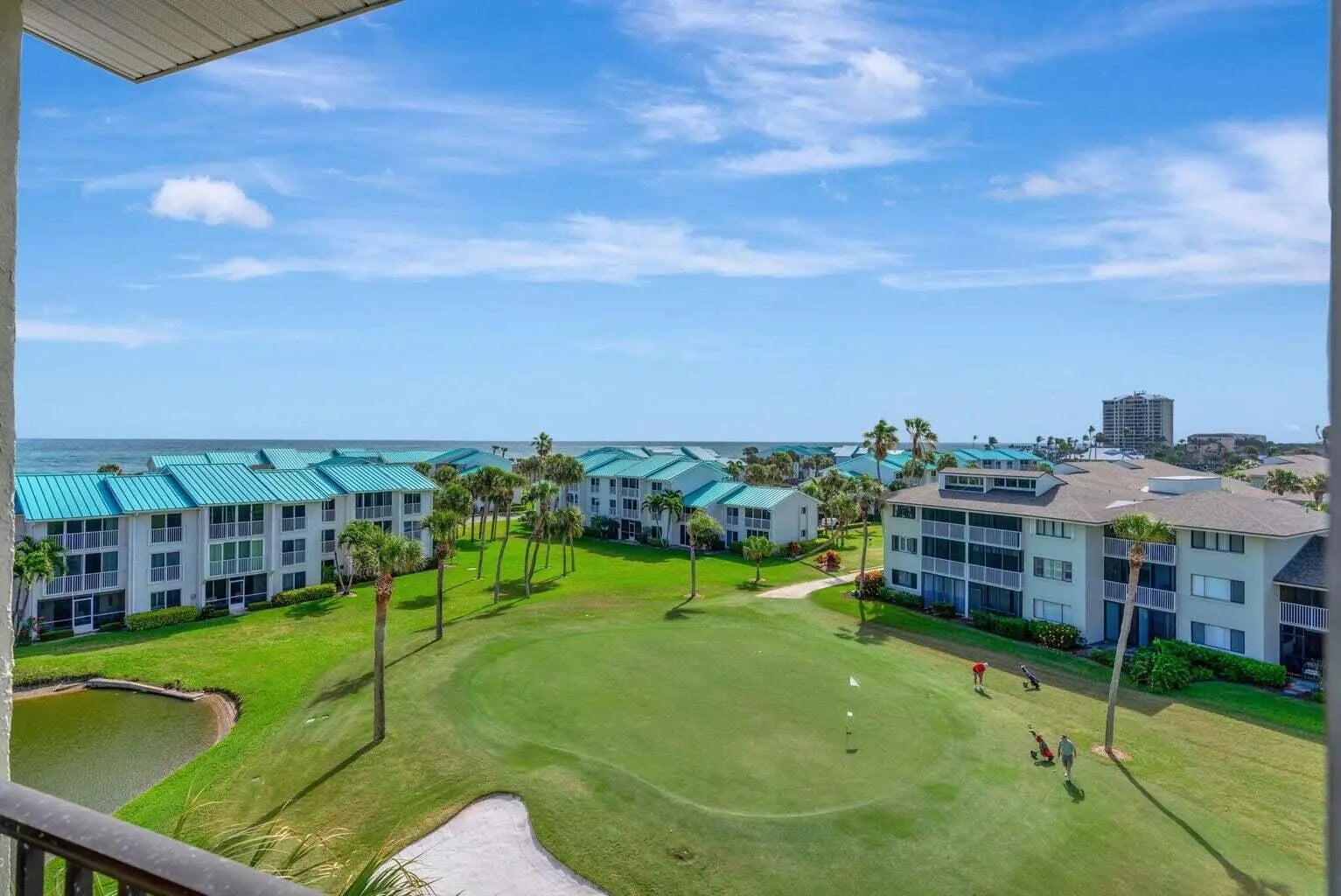 Beautiful 2 bedroom 2 bath 5th floor (top floor) ''Catamaran'' condo at Ocean Village. This spacious fully furnished condo has great views of the Ocean, Cayman pool & golf course! Featuring split bedrooms, vaulted ceilings & nice upgrades including granite kitchen countertops, impact windows, california closet, custom drapes & blinds, plantation shutters & extended living room! Would be a great rental unit if owner so desires. Enjoy the ultimate Florida lifestyle at this beautiful award winning oceanfront community offering resort style amenities includidng 24 hr gated entry, 9 hole par 3 golf course, tennis, pickleball, bocce ball, shuffleboard, 4 heated pools, new clubhouse & fitness center, oceanfront restaurant & tiki bar, over 3000 feet of oceanfront & more! Measurements approximate.