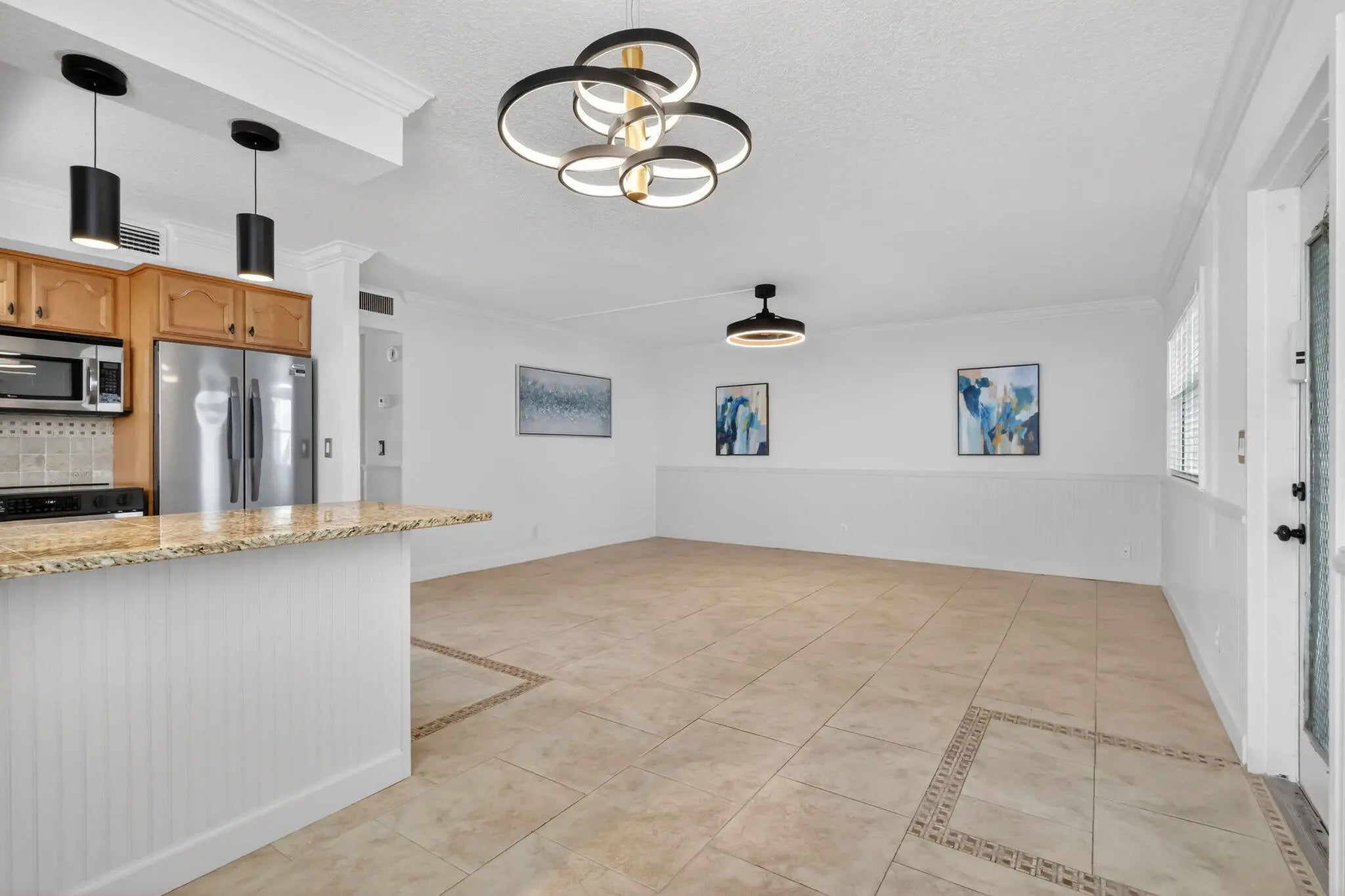 Beautifully previously renovated 2-bedroom, 2-bath condo, 1st floor in Kings Point an over 55+ community, well maintained, bright & features an open-concept kitchen w/granite countertops, stainless steel appliances (2024) & wooden cabinetry, large pantry closet, tile flooring & crown molding throughout, baseboards, new fans & black fixtures, LED & recessed lighting, primary bedroom w/custom closet. Bathrooms offers a shower & tub. Bedroom provides direct access to the enclosed patio, where you'll also find your washer & dryer for added convenience. Amenities: Billiards, Bocce Ball; Cafe/Restaurant; Clubhouse; Community Room; Courtesy Bus; Fitness Ctr.; Game Room; Multiple Pools, Library; Shuffleboard; Tennis. Close to FL turnpike, Restaurants & Delray Med. Ctr.