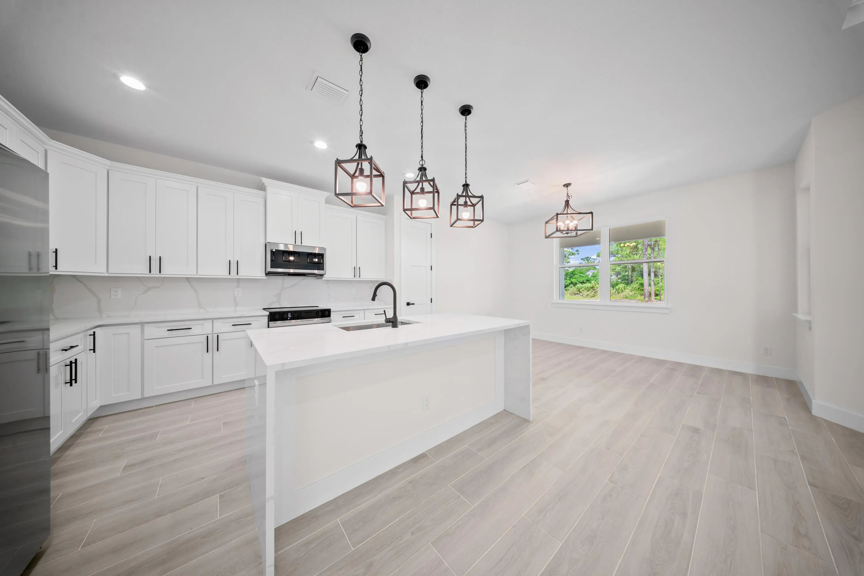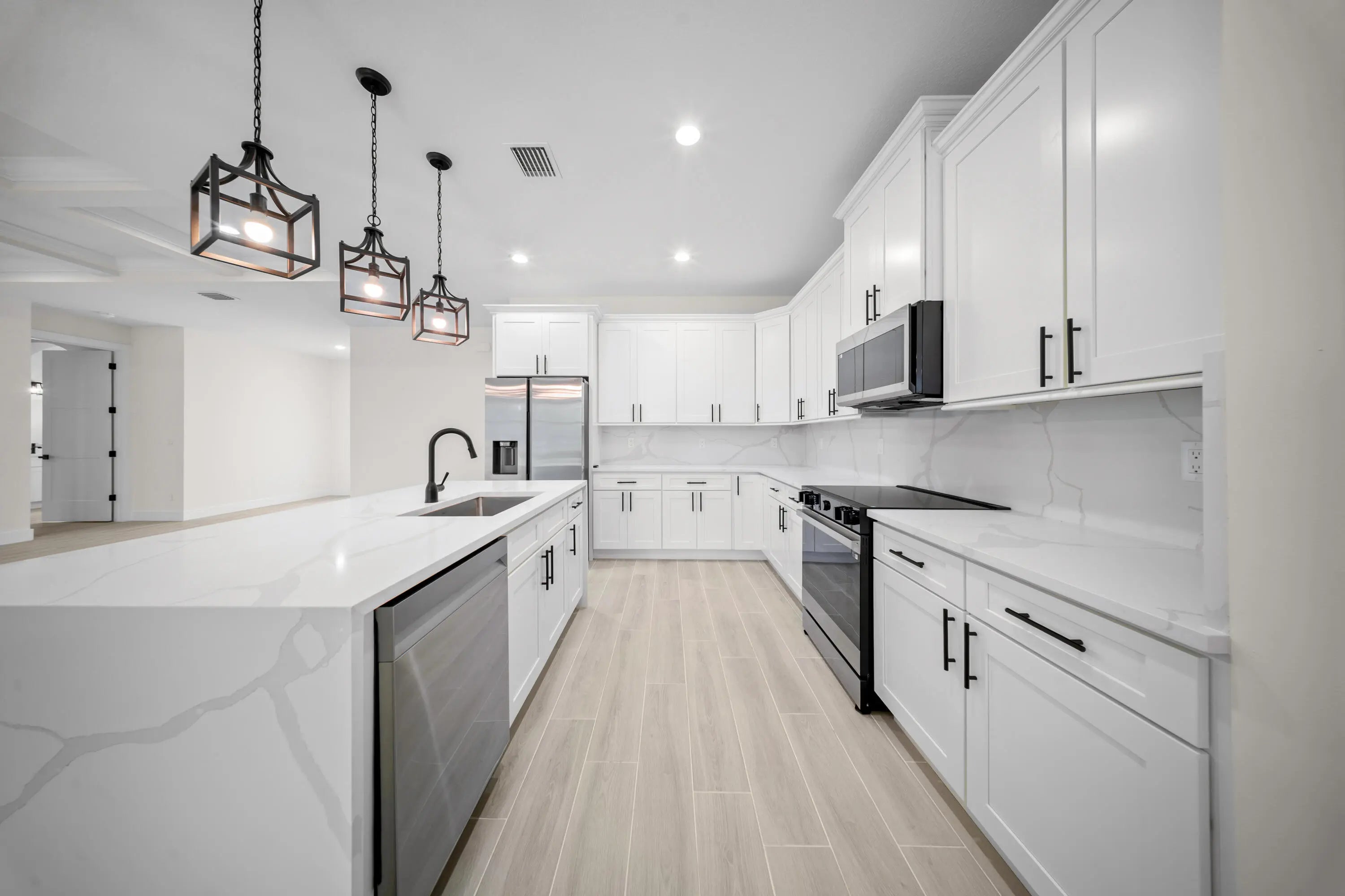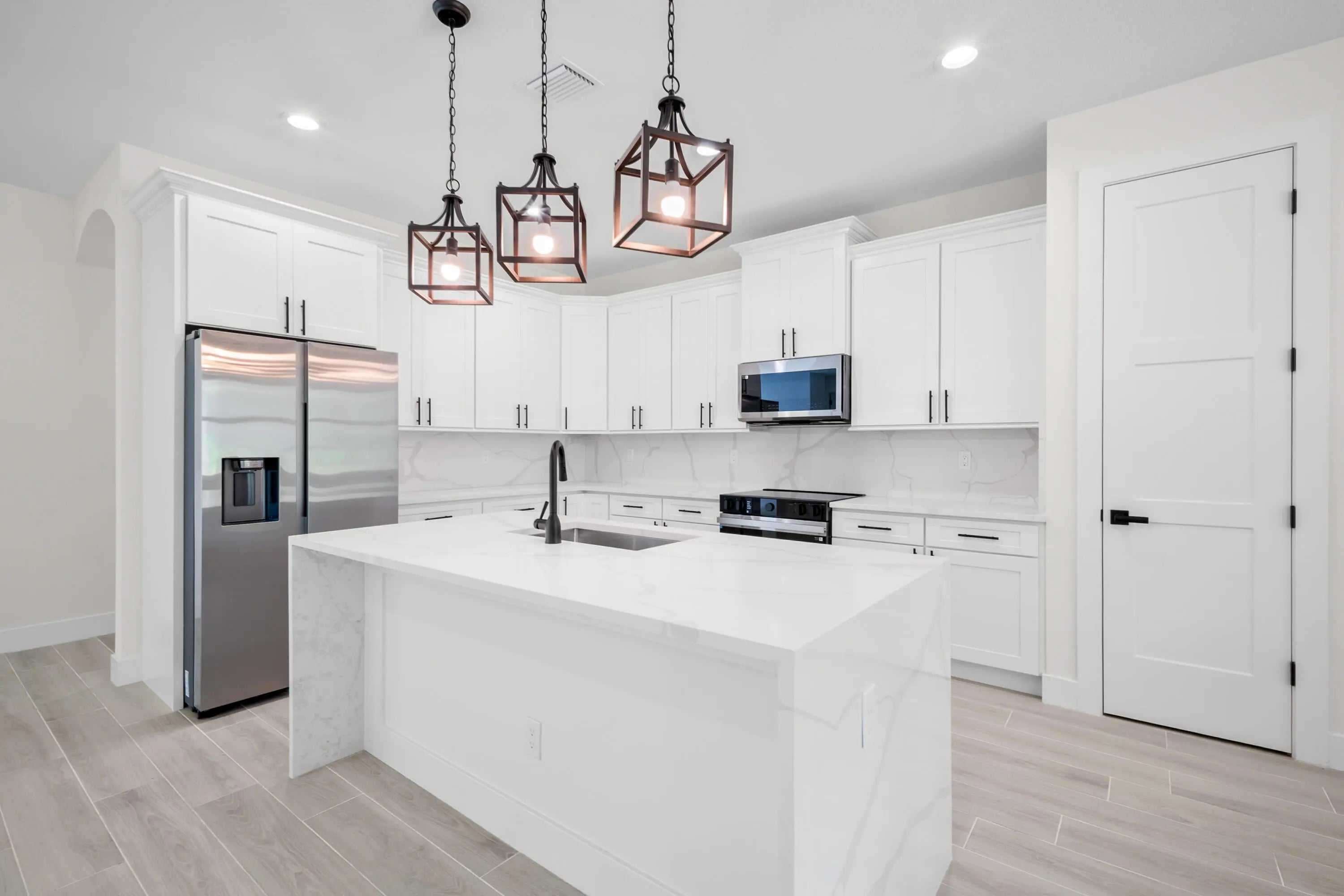 This loaded new construction custom home sits on over an acre in a cul-de-sac in a truly awesome neighborhood with new construction homes. This home has a 3 car garage, enormous back porch with tongue and groove ceilings and a cabana bathroom. The home also features a coffered ceiling in the great room, oversized plank tile throughout the home and shower tile to the ceilings with pebble tile shower pan. This Kitchen is loaded with calacatta quartz countertops with waterfall edge, hood vent, calacatta quartz backsplash and 42 inch white shaker cabinets with crown, light rail and soft close features. The master has huge walk in closets and an enormous bathroom and a spa like shower. This home also includes 8 foot custom doors, Impact glass windows and slider. Optional outdoor kitchen!