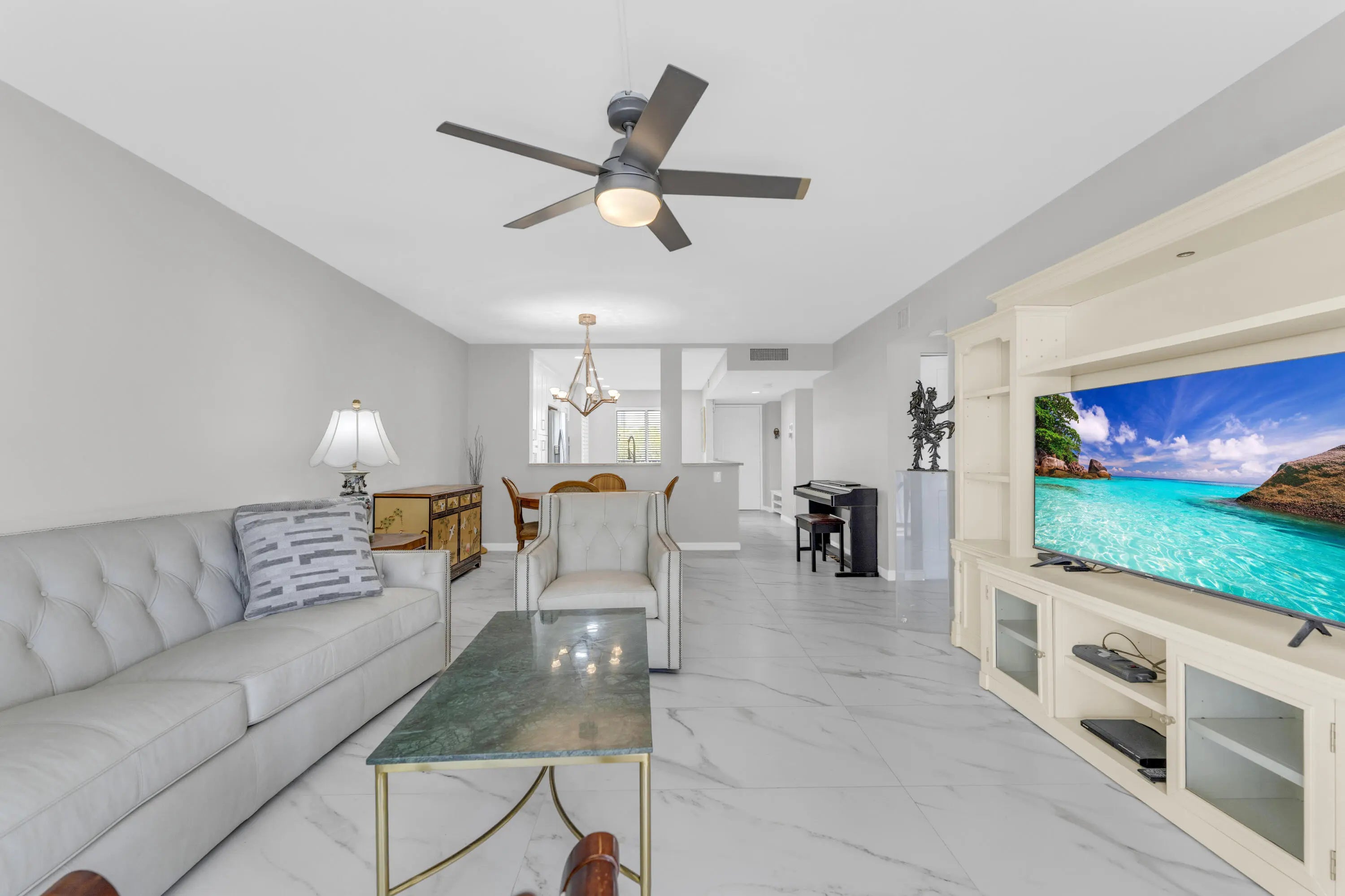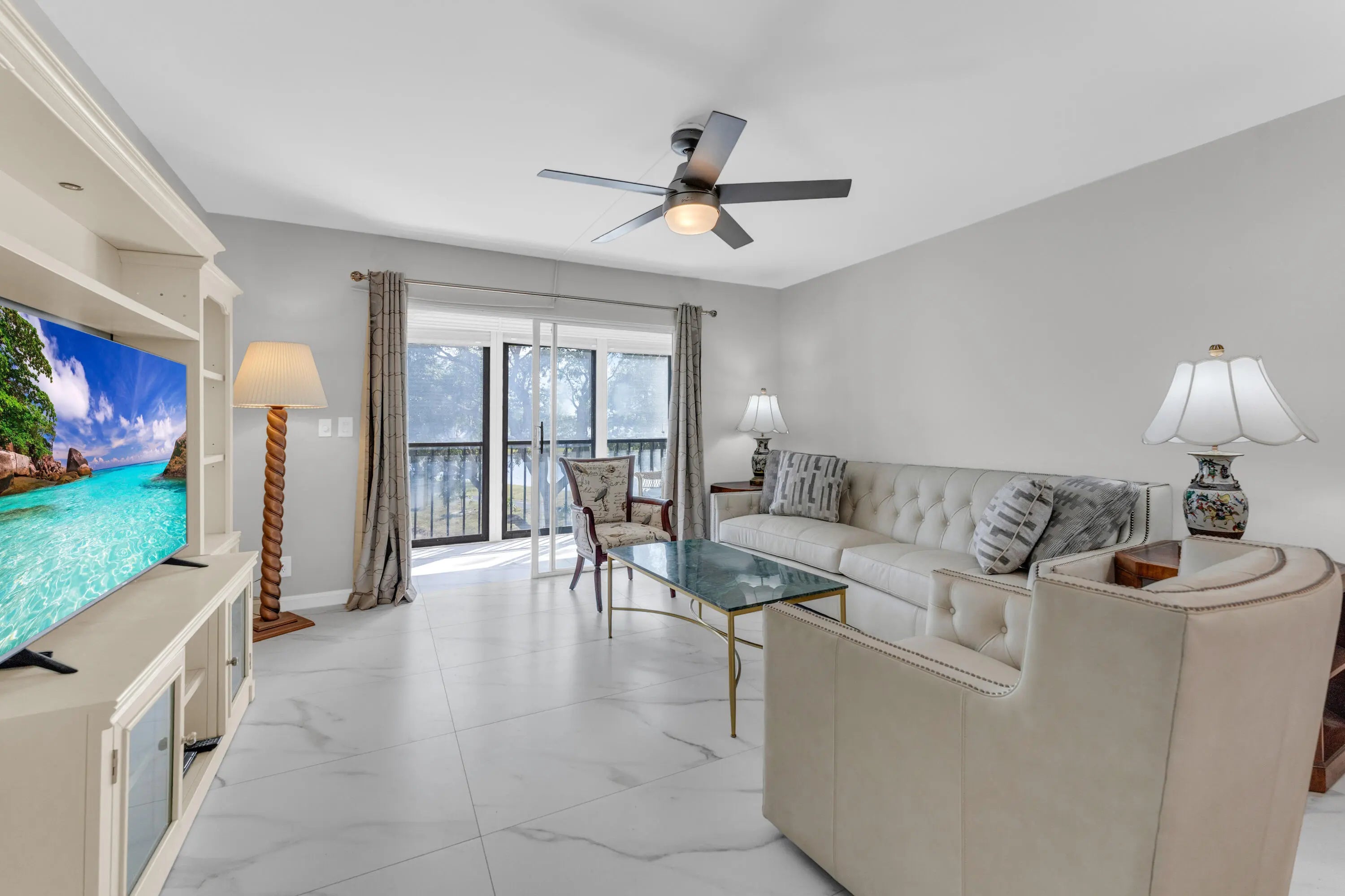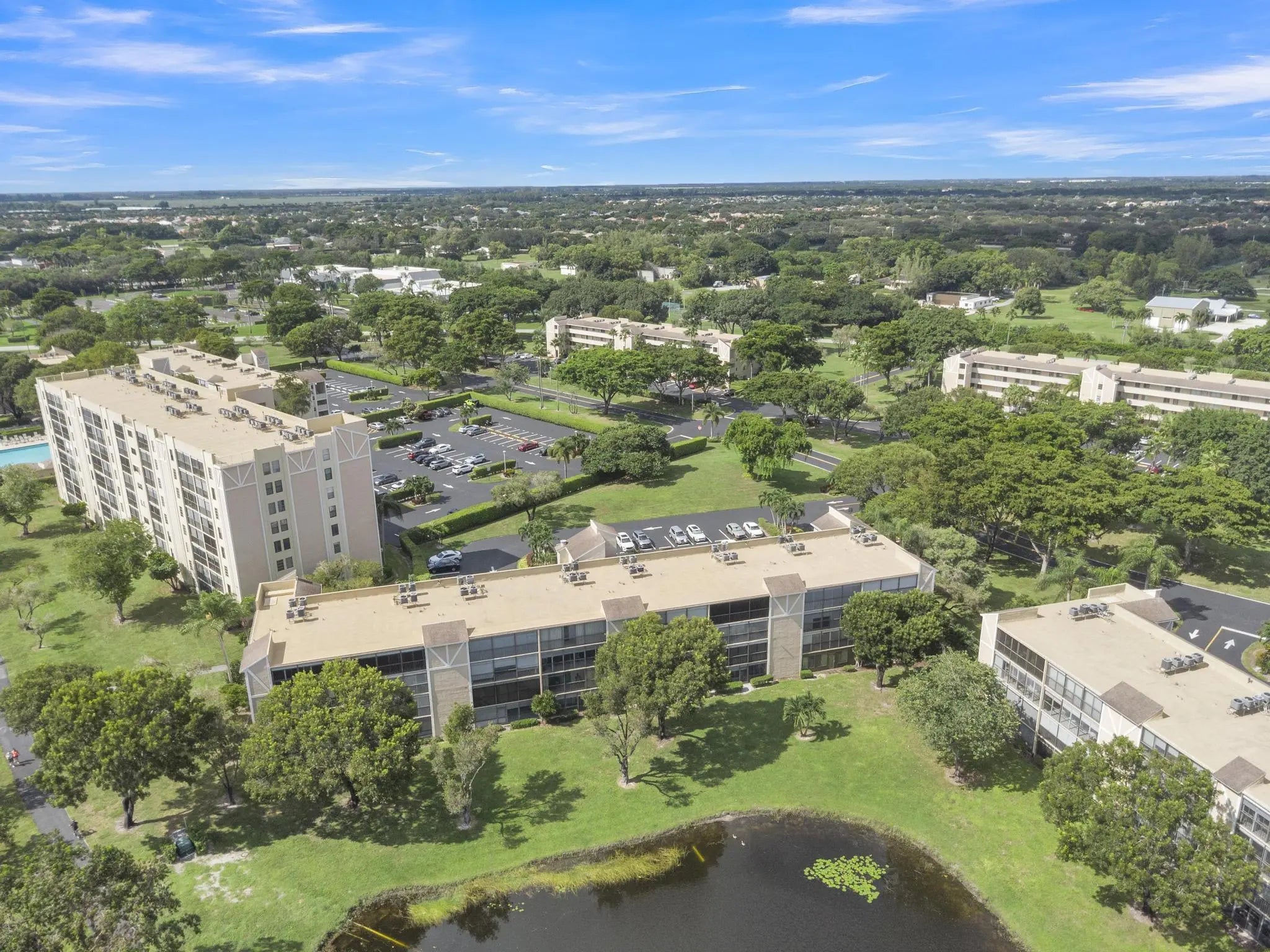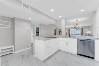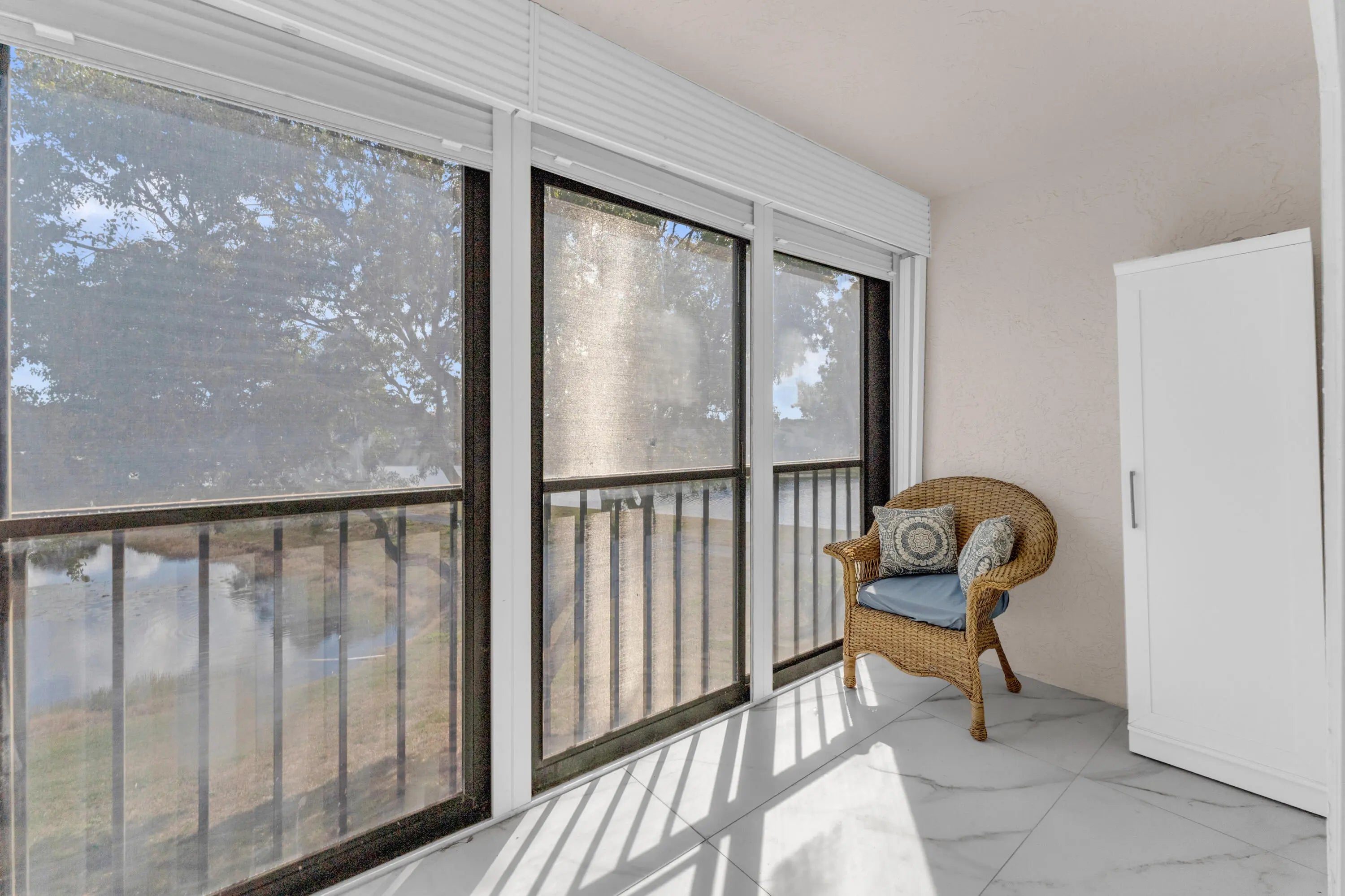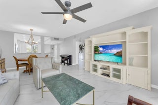 Upon entering, you are greeted by a gorgeous, custom-designed open kitchen that is truly a chef's dream. It features an abundance of new cabinets with pullout drawers, beautiful quartz countertops, and newer appliances, including a built-in wall oven and microwave with convection features and a cooktop range.The interior boasts beautiful oversized porcelain tiles throughout and was recently updated with fresh paint, new baseboards, and new ceiling fans. The popcorn ceilings have also been removed. Both bathrooms have been completely remodeled with new showers, flooring, vanities, toilets, and accessories. Additionally, both bedrooms include closet organizers for your convenience. Newer AC and water heater, both installed in 2023. Gorgeous long lanai with serene view of the pond and lake. The condo has sliding doors on the rear of the balcony, giving you added living space during the weather elements. The unit is centrally located to the pool and clubhouse. No need to drive anywhere. Don't miss out on the Magnificent renovated clubhouse and sports facilities. Very active lifestyle!!! 610 seat theater, 350 seat banquet room, 2 card rooms, billiard room, aerobic and weight rooms, indoor pool, 9 pickleball, 4 Har tru tennis courts, 3 paddle tennis courts, and clubs galore. NO SPECIAL ASSESSMENTS!!!