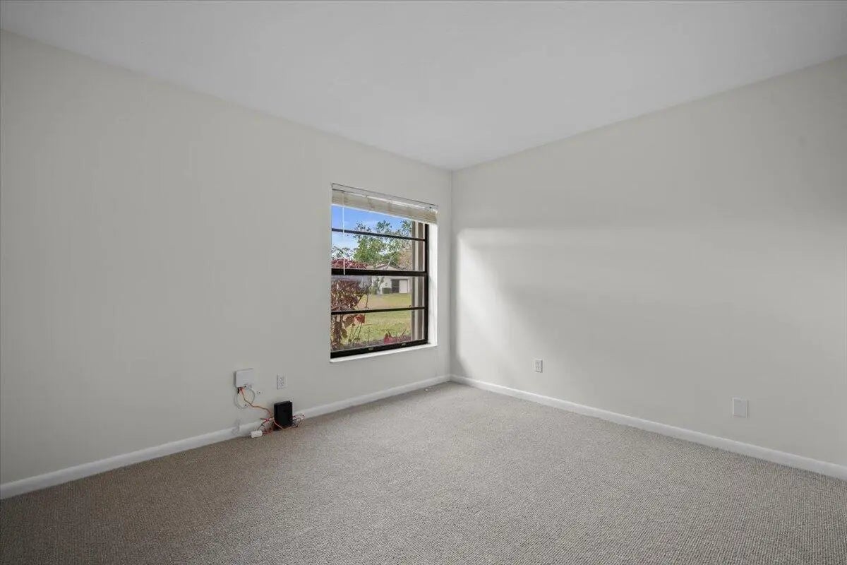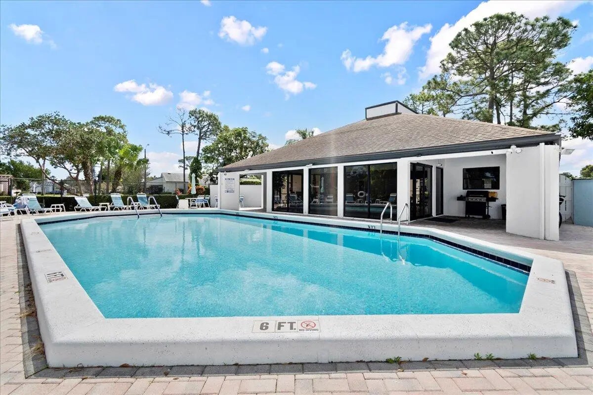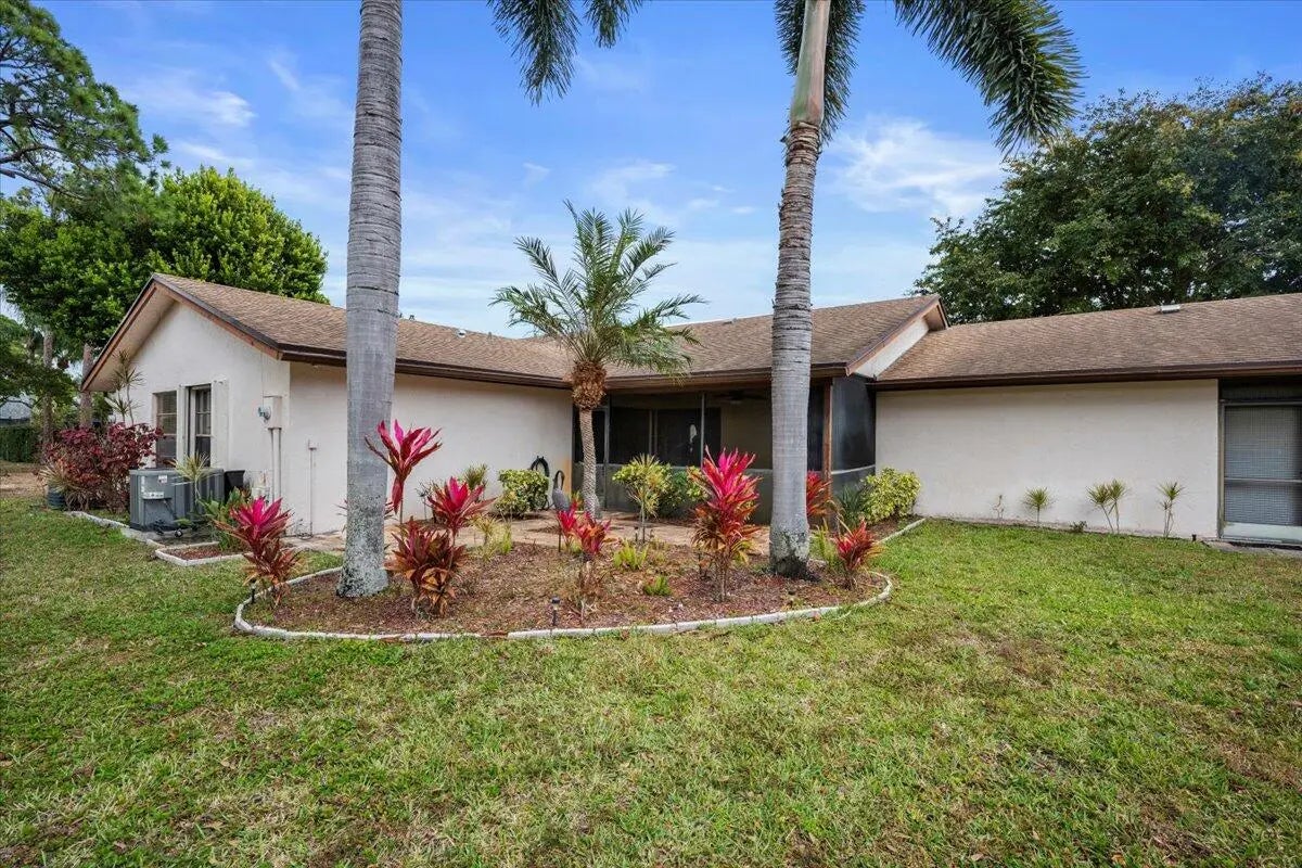 This lovely 2 bedroom, 2 bathroom villa has it all! New paint, new knockdown finish on ceilings, new carpet in bedrooms, and the list goes on. Unit is conveniently located in a quaint 55+ community in Greenacres near shopping, banks, bowling, movies, and many restaurants. The screened lanai overlooks a beautiful stone patio with mature palms that opens up to a large grassy common area. The community features a clubhouse with organized activities, a refreshing swimming pool, and tennis courts and shuffleboard courts. No commercial vehicles. At least one occupant must be 55+.