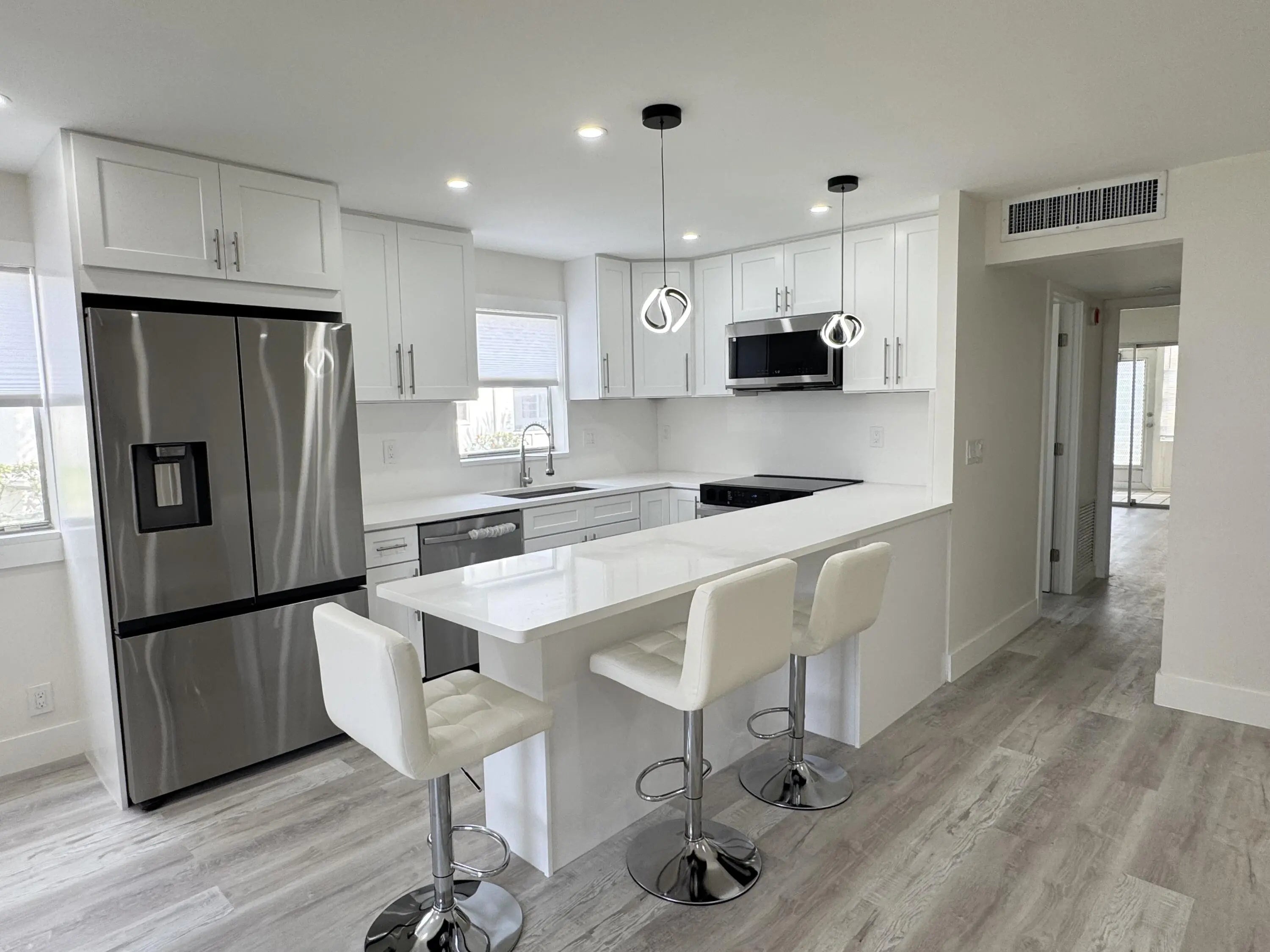 Stunning fully reimagined 2/2 condo in the highly desired Brittany section of Kings Point! This light-filled home features a-new modern kitchen with white shaker cabinets, soft-close drawers, stainless steel appliances, quartz countertops, and a beautiful peninsula with bar seating. Enjoy luxury vinyl flooring throughout, LED lighting, new interior doors, fresh paint, and a completely reimagined bathroom with frameless glass shower, modern tile, and updated fixtures. This move-in-ready home offers peace of mind with new lighting, modern finishes, and a bright open layout. Located steps away from the main Kings Point clubhouse, pools, theaters, golf, restaurants, courtesy buses, and all amenities. A must-see turnkey home in one of the best locations in Kings Point.
