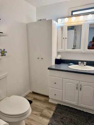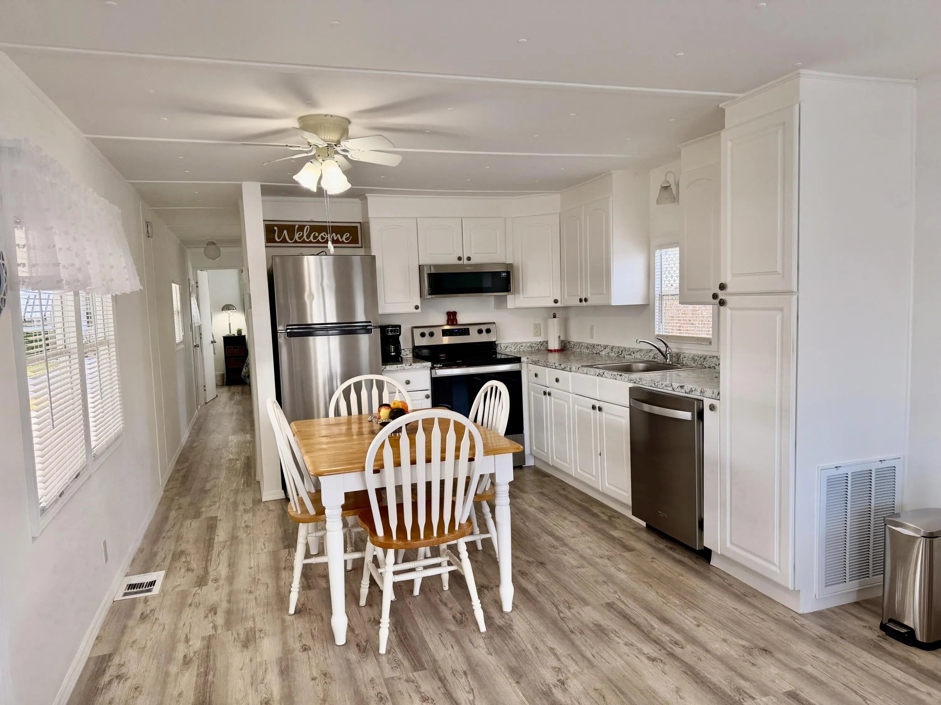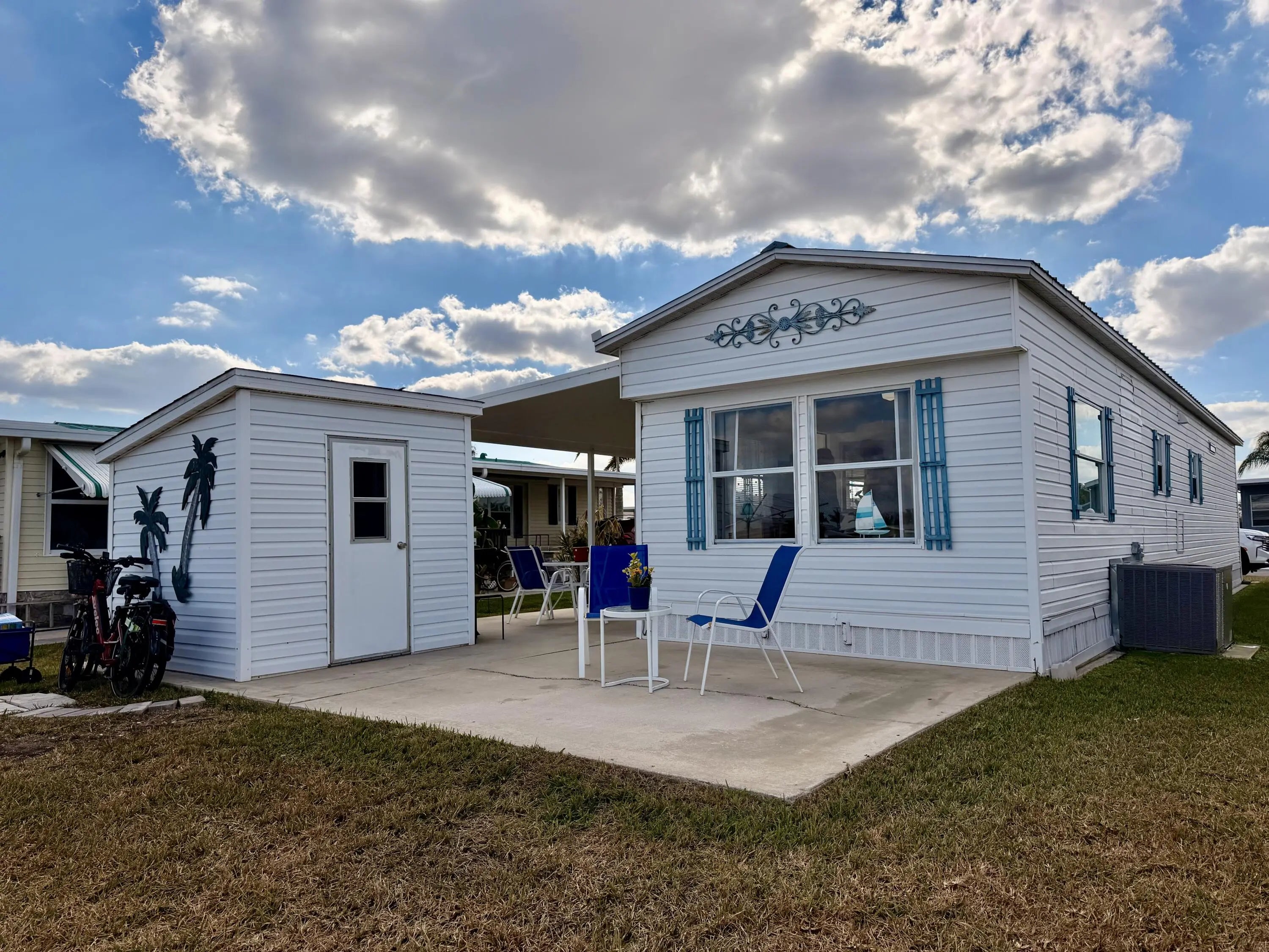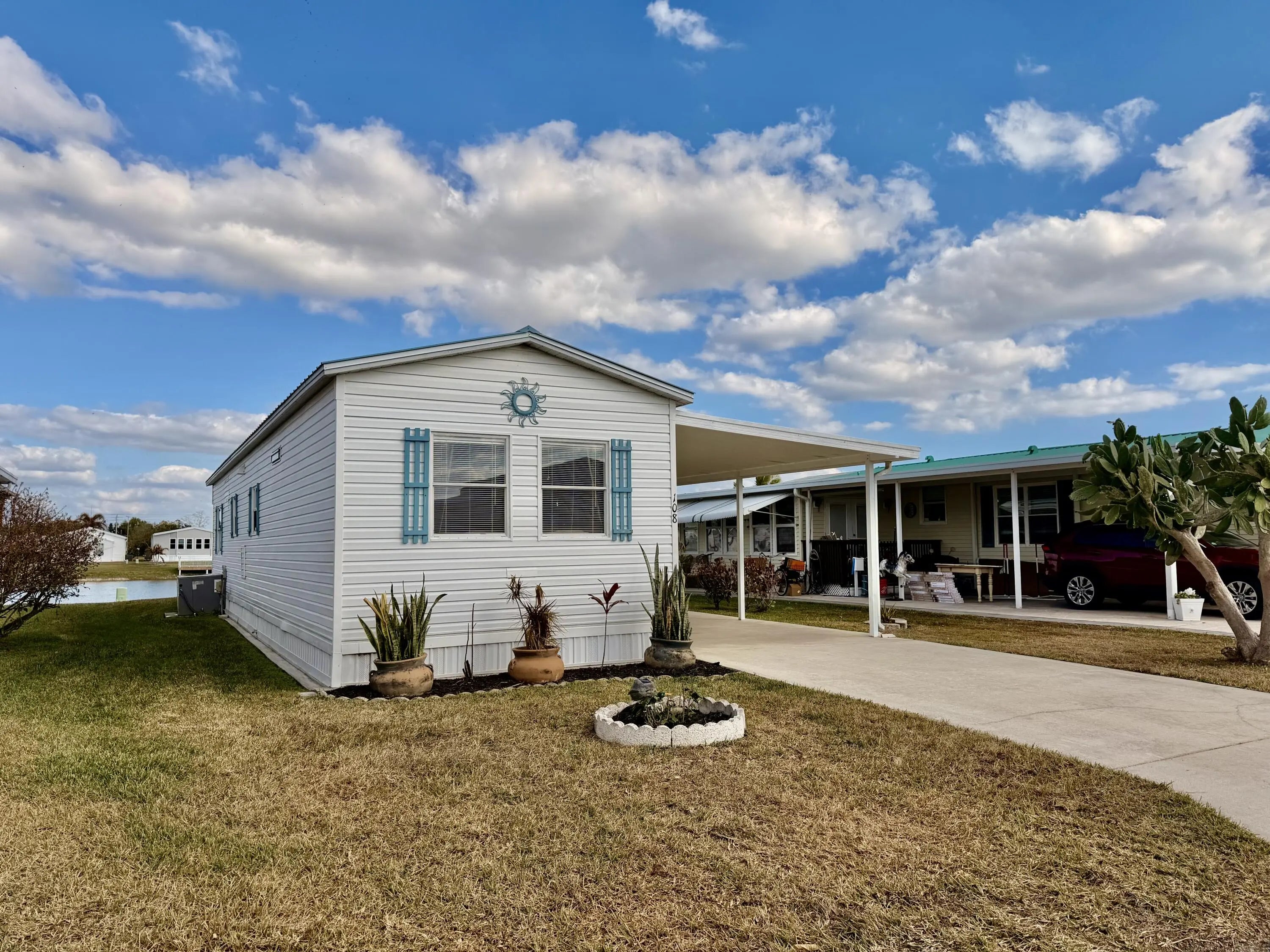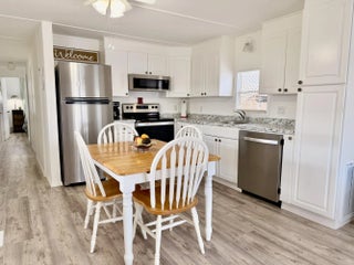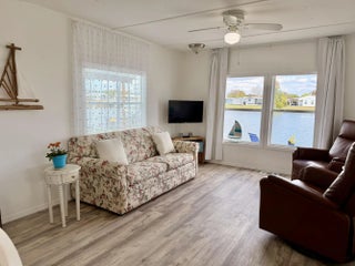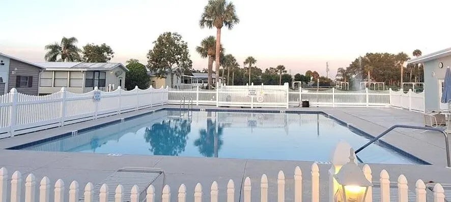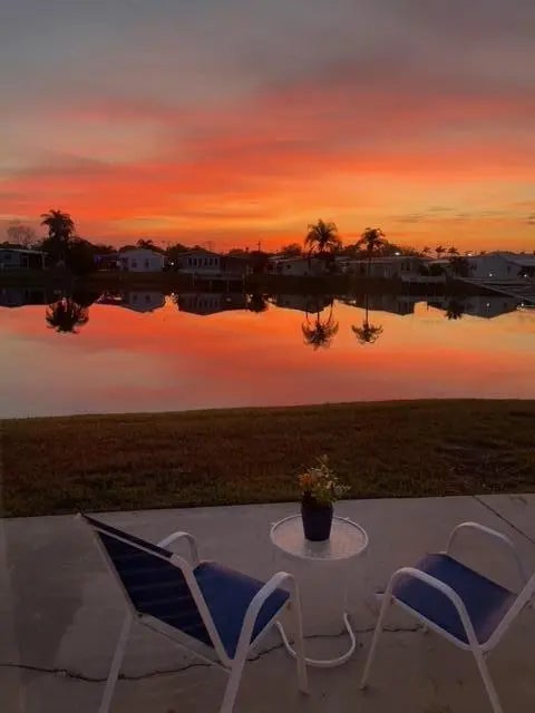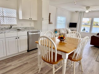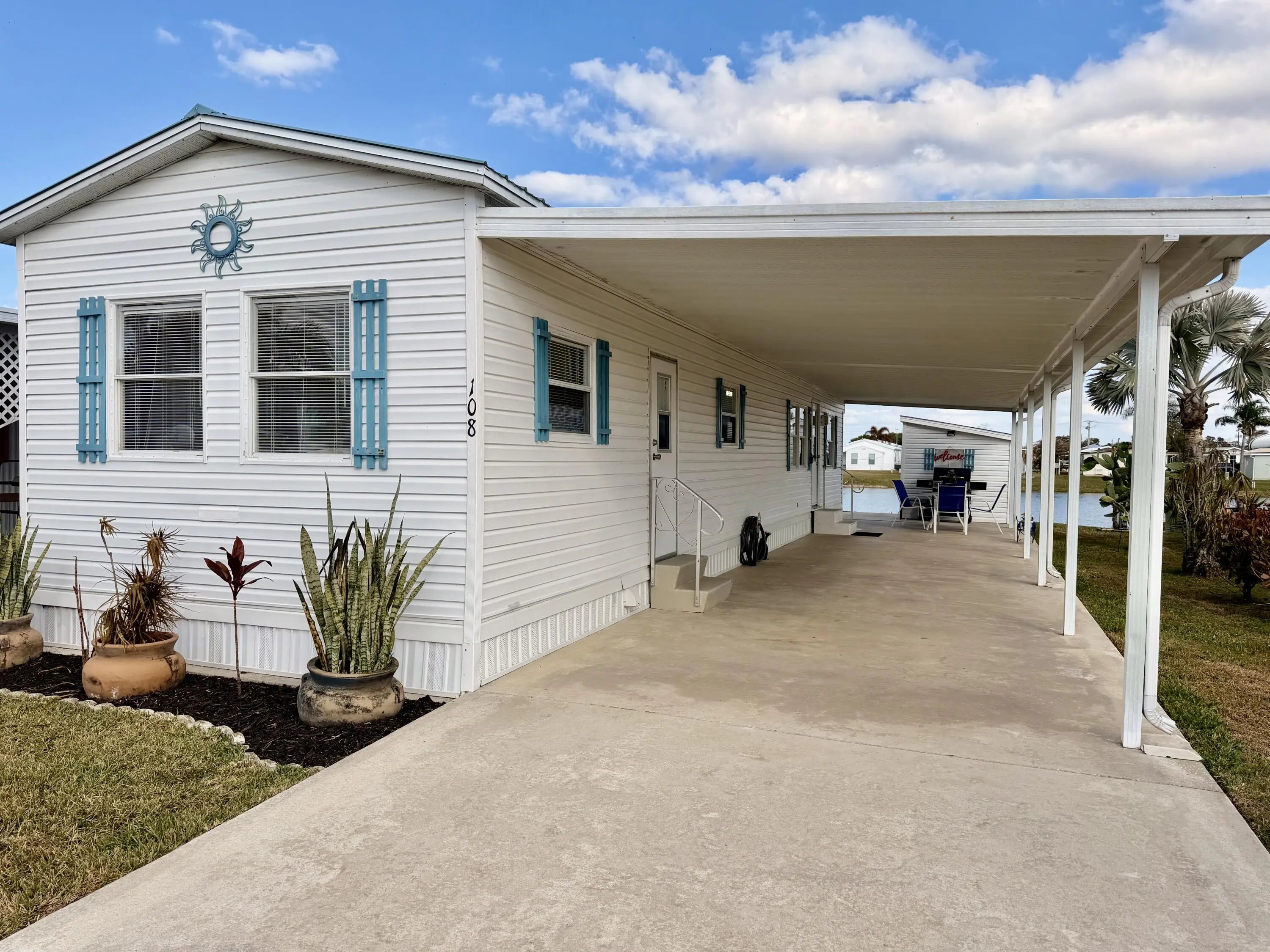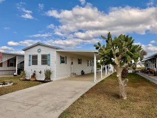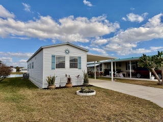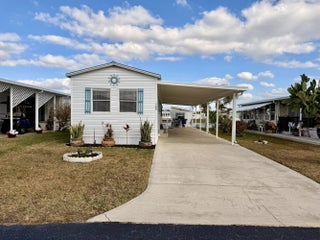 OASIS VILLAGE ~ Cottage charm Cutie! Waterfront dreaming on the community lake. Adorable 2 Bd/ 1Ba/ 50 Ft carport. 2023 it was Beautifully updated and remodeled to make any heart sing! Panoramic view of the lake from the living room. Lovely white cabinets, farm sink, SS appliances and LVP flooring. Spacious bath, W/D, tub/ shower combo, linen closet. Lots of closet space. Plenty of carport to add a screened room. Open patio seating on the water for afternoon tea with friends. Metal roof. Storage shed. Community heated pool and activities. Fully furnished and turnkey! HOA 125/mo. THIS one's YOUR HAPPY PLACE! Dimensions are approximate, must measure for exact