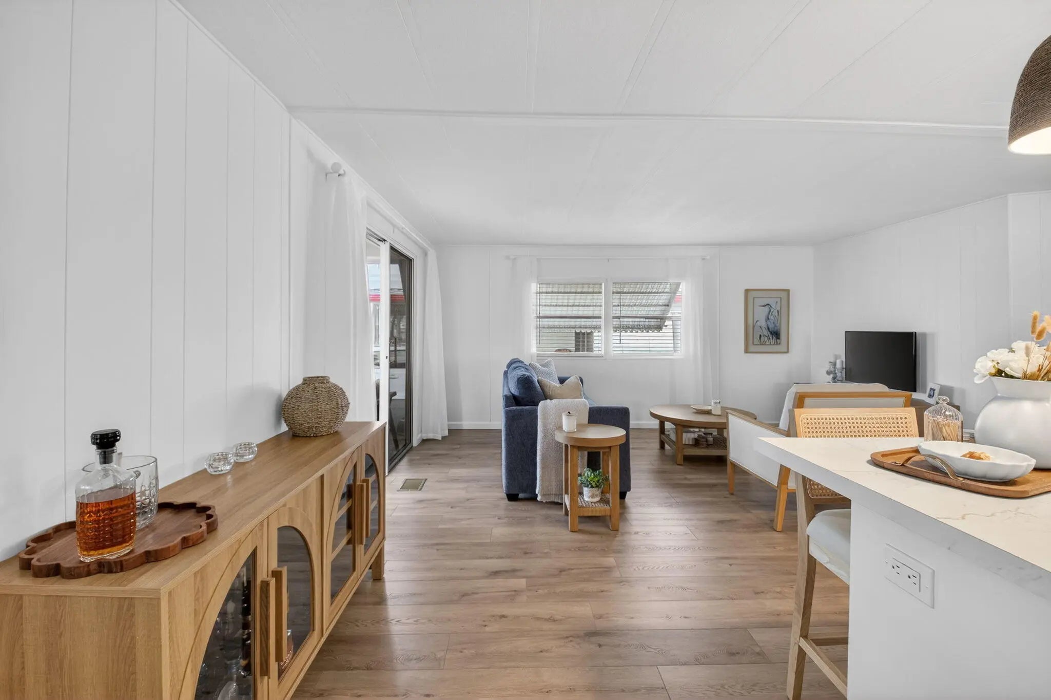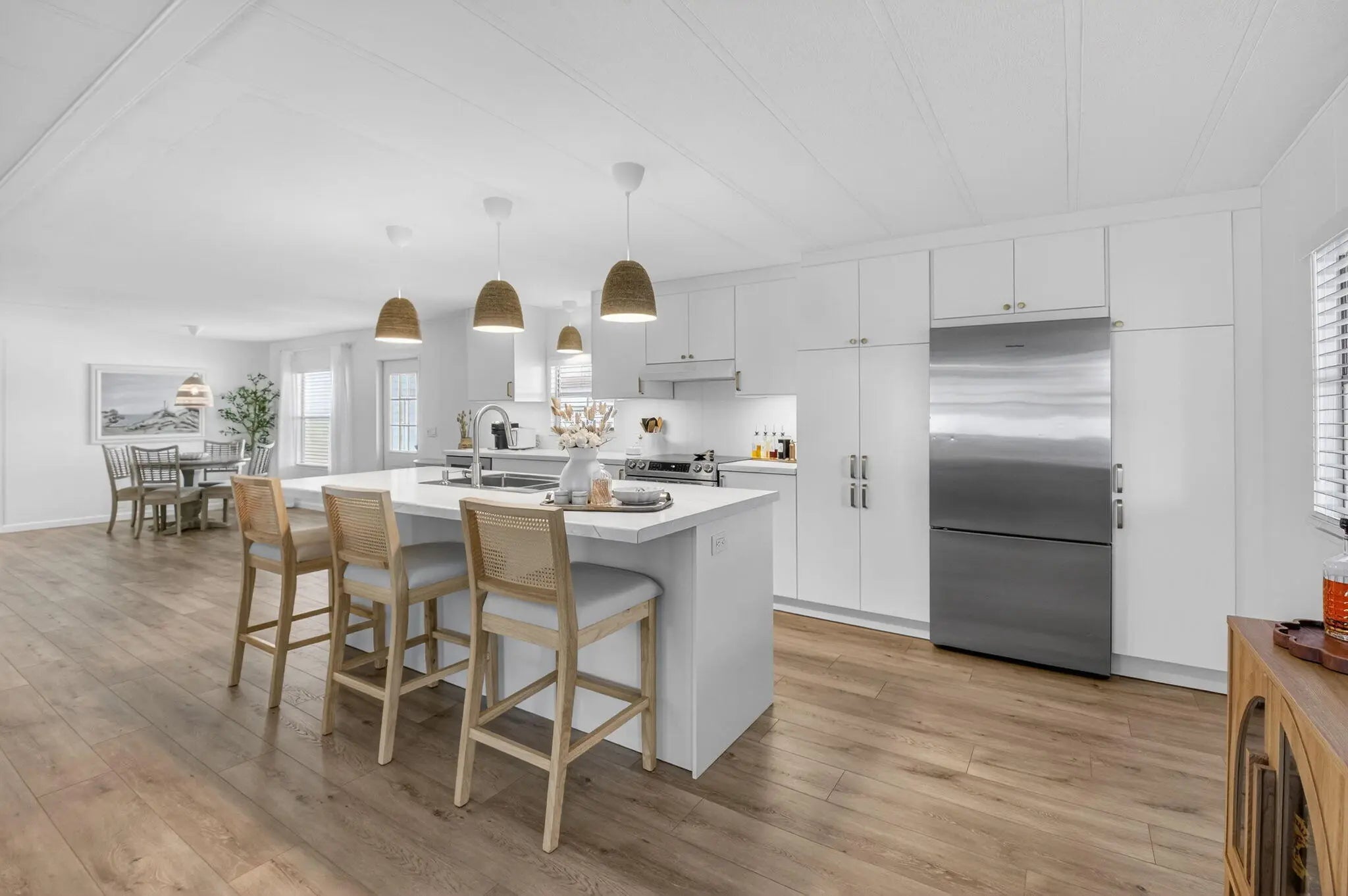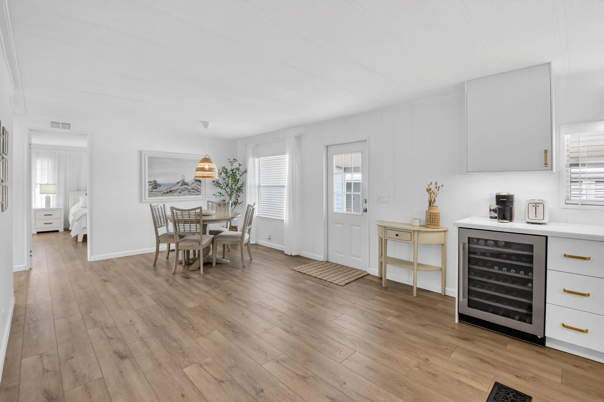 Completely TURNKEY! This beautiful COMPLETELY UPDATED 2/2 is a showstopper! Whole house has luxury laminate flooring throughout. Kitchen has NEW APPLIANCES with a wine fridge. Under cabinet lighting, NEW cabinets and NEW countertops! OPEN concept kitchen with a SPACIOUS island perfect for entertaining! Patio has OVERSIZED glass windows and new flooring! BOTH bathrooms completely remodeled! Home is OPEN, AIRY and shows like a model home! Offered beautifully furnished excluding art and personal items! This one won't last! Jamaica Bay is a desirable 55+ community with multiple heated pools, clubhouse, billiards, shuffleboard, pickleball, library, social activities and a new onsite convenience store! The HOA includes lawn care, water, internet, sewer, trash and 24/7 manned gate