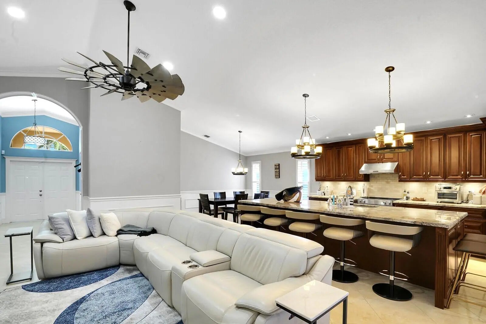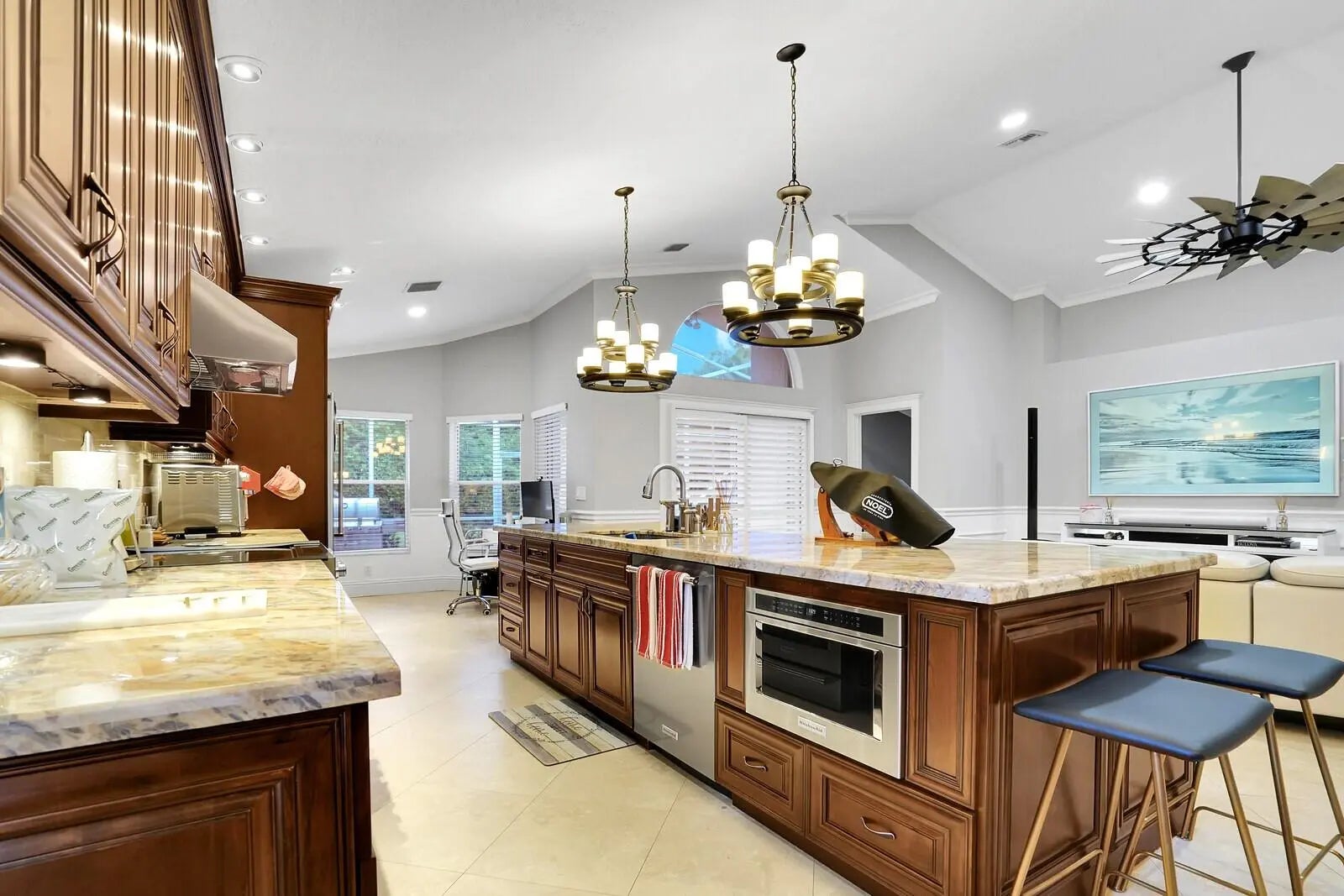 Experience resort-style living in the prestigious gated community of River Bridge. This meticulously updated single-family home offers an ideal blend of comfort, style, and functionality, featuring 3 bedrooms, 2 bathrooms, a 2-car garage, and an extended living area. Upon entry, abundant natural light floods the interior, accentuated by soaring vaulted ceilings and elegant large-format tile flooring throughout. The home boasts high-end lighting fixtures that enhance its sophisticated ambiance. The chef's kitchen is a standout, designed as a spacious open-concept space perfect for entertaining. It is equipped with premium finishes, including stone countertops, stainless steel appliances, and ample cabinetry for storage and preparation. Both bathrooms have been tastefully renovated to modern standards. The two guest bedrooms are generously sized and conveniently share access to the second full bathroom. Bathed in natural light from multiple windows, the master bedroom includes a luxurious ensuite bathroom featuring an oversized separate shower with upscale plumbing fixtures, complemented by a large walk-in closet with custom built-ins. Step outside to your private, screened-in paved patio--an ideal setting for morning coffee or evening relaxation amid peaceful surroundings. Additional conveniences include a full-size laundry room with a utility sink, direct access to the 2-car garage, and attic storage accessible via pull-down ladder. The HOA fee covers high-speed internet, cable television, lawn maintenance, and full access to the community's exceptional amenities: multiple pools, basketball court, tennis and pickleball courts, shuffleboard, fitness center, and community room. Round-the-clock gated security with 24/7 guard presence provides added peace of mind. Don't miss this exceptional opportunity--schedule your private showing today.