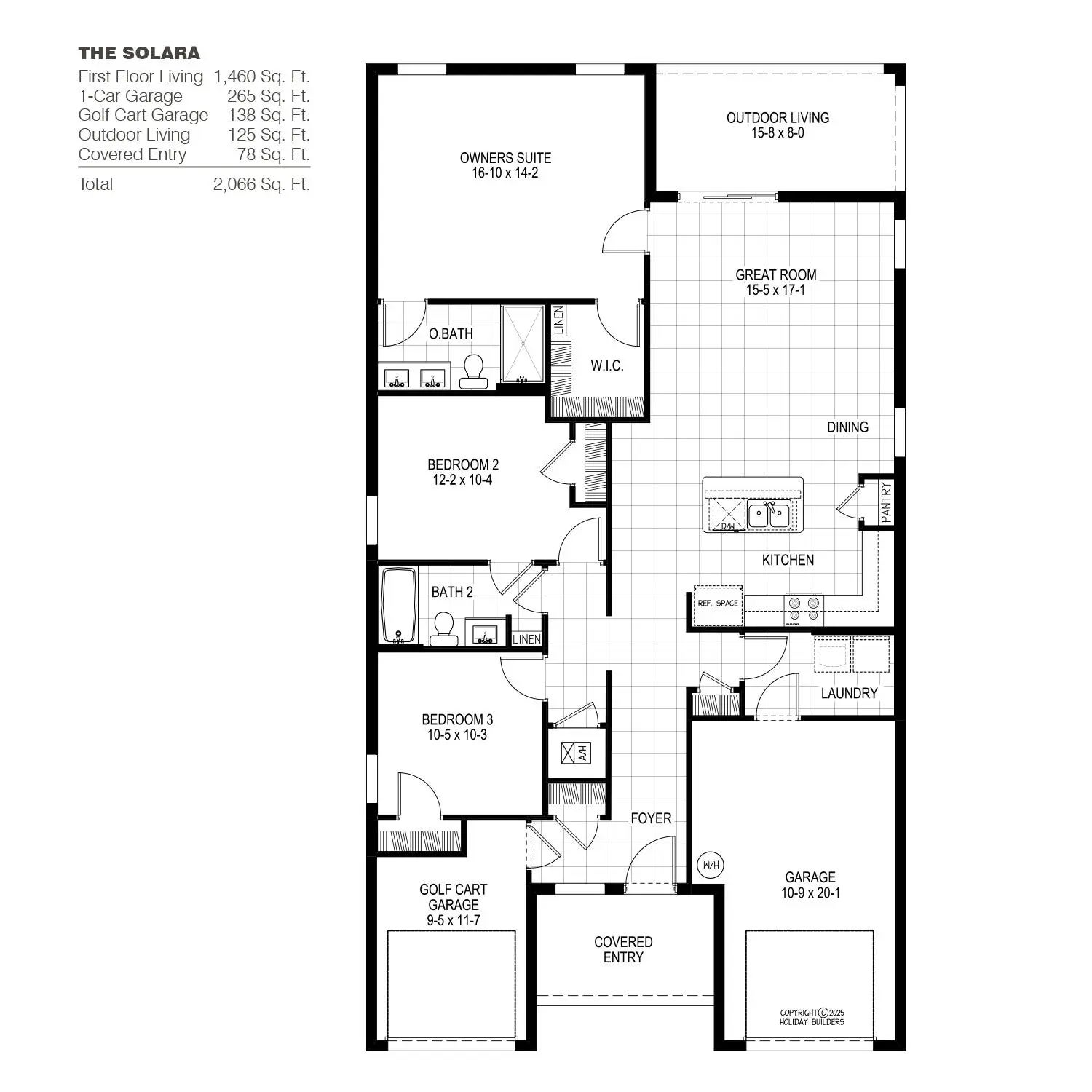 The SOLARA offers 1,460 square feet of well-used space. This three-bedroom home lets you spread out while still enjoying the low-maintenance lifestyle at Spanish Lakes. The open great room & dining area creates a bright central hub for relaxing, hosting guests or enjoying quiet evenings at home. The kitchen sits just off the dining space & features a smart layout with an island, ample counter space, cabinetry & pantry. The owners suite boasts a walk-in closet & well-appointed bathroom with double sinks. Bedrooms 2 & 3 share a convenient full bathroom. A dedicated laundry room, linen storage & a foyer closet keep everything organized. Equipped with a one-car garage & a separate golf cart garage. Coastal-inspired exterior styles, impact glass windows & metal roofs complete the package.