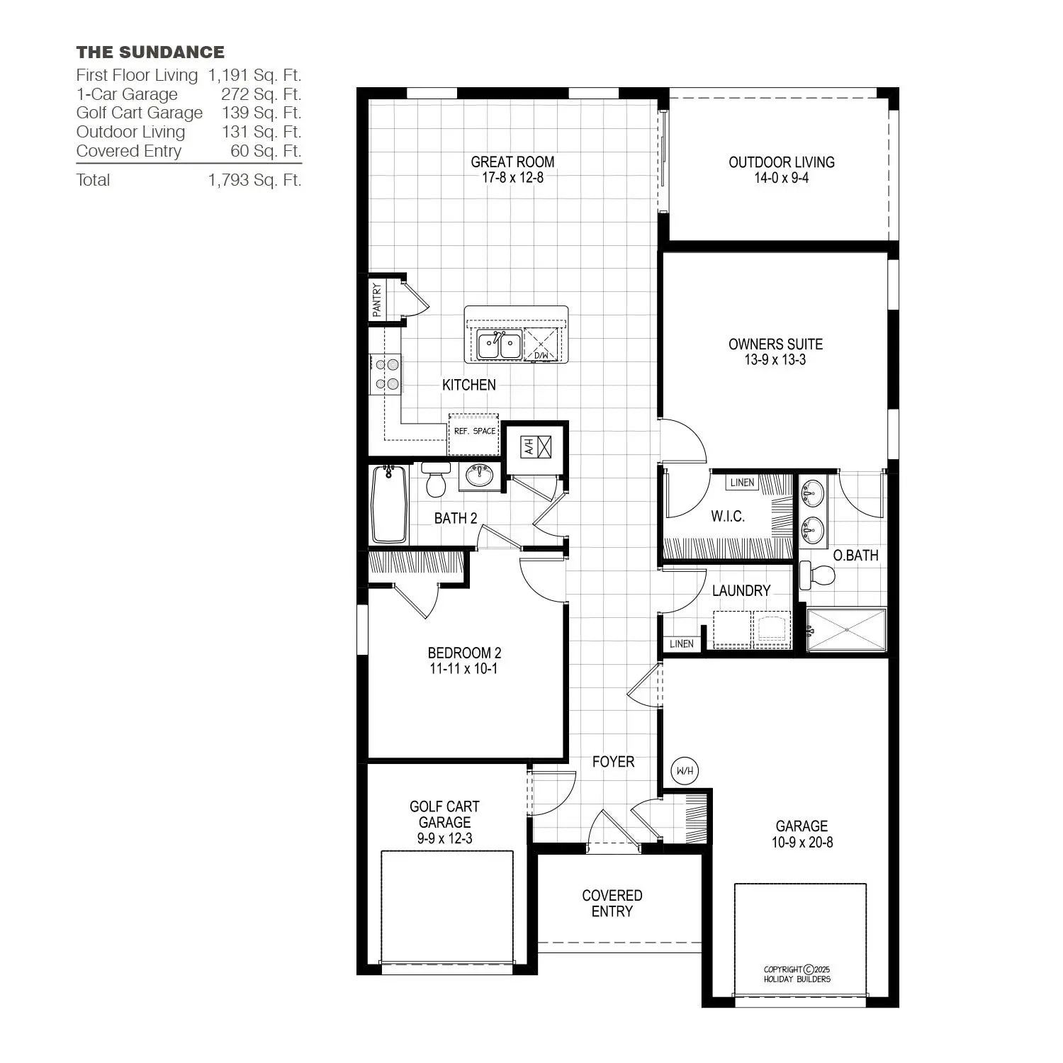 The SUNDANCE boasts 1,191 square feet of living. The great room offers plenty of room for relaxing, watching movies or hosting friends. The kitchen features a smart L-shaped layout with an island, pantry & clear sightlines to the main living area. The covered outdoor living area, giving you a peaceful place to enjoy morning coffee, fresh air, or quiet evenings outdoors. Owners suite includes a walk-in closet& a private bathroom with double sinks. Bedroom 2, positioned near the front of the home, makes an excellent guest room, hobby space or home office. Includes a dedicated laundry room, well-placed storage, one-car garage & separate golf cart garage. Coastal-inspired architecture, metal roofing & impact glass windows gives long-lasting charm & peace of mind.