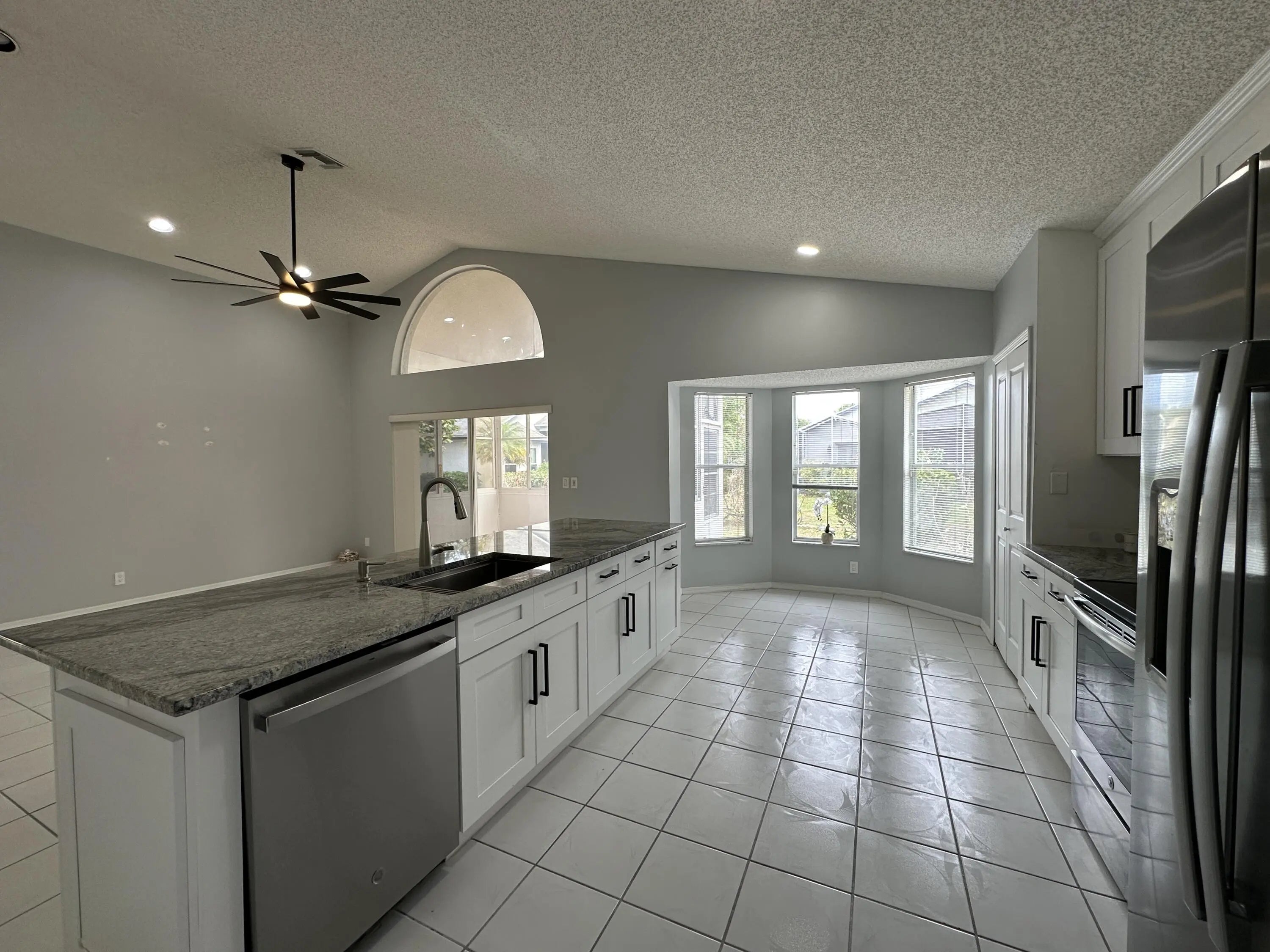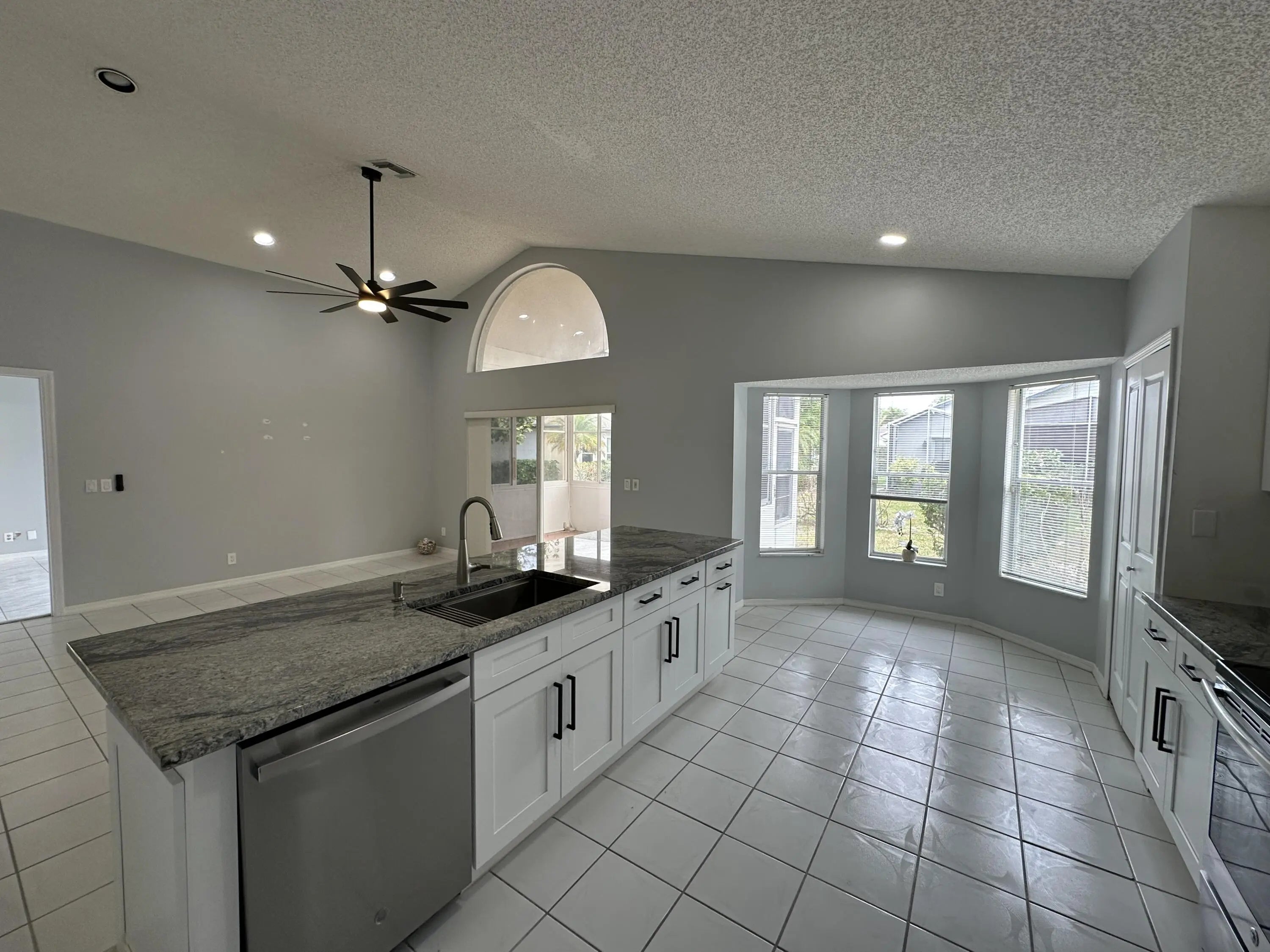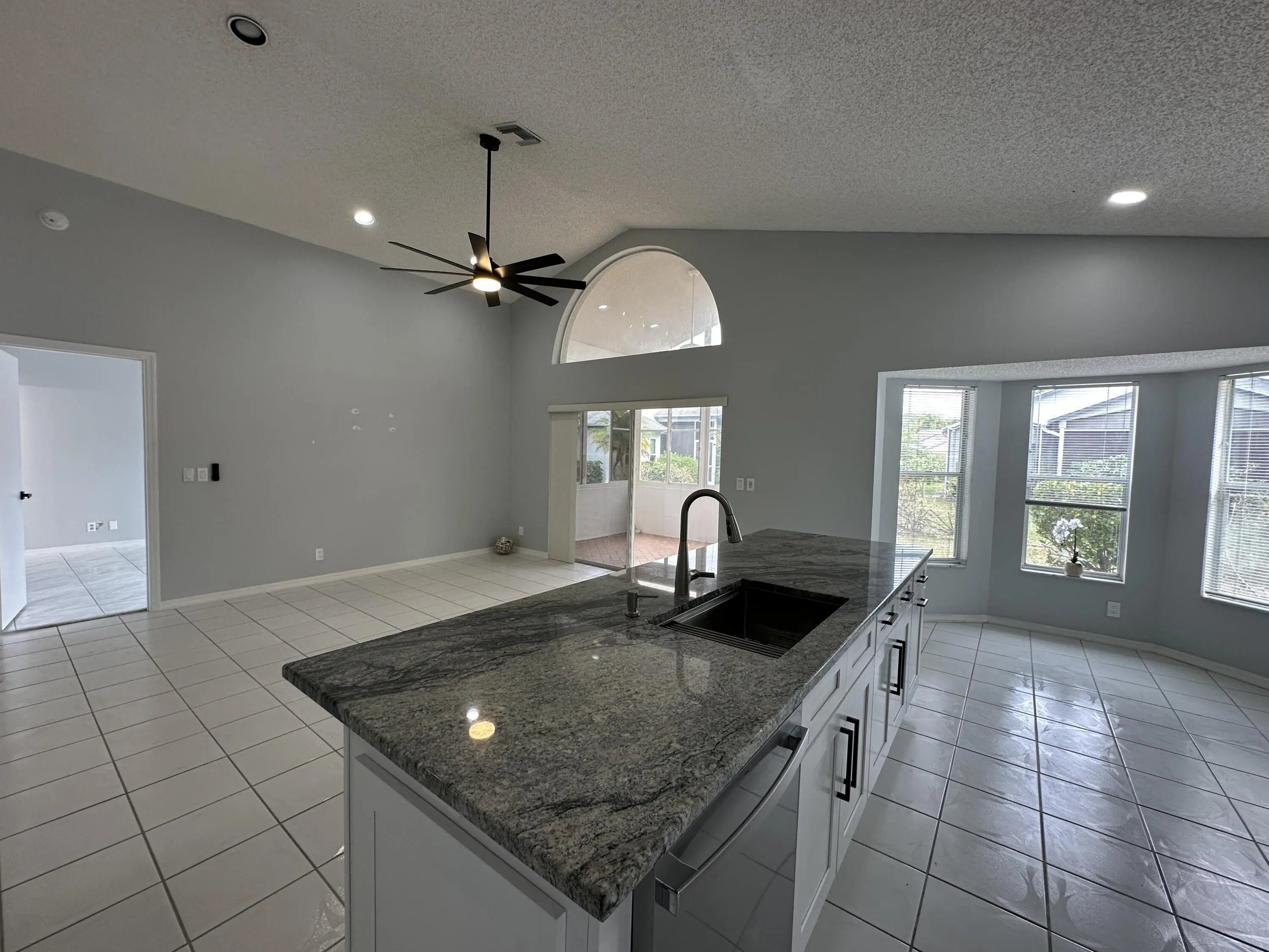Single Family Home in River Bridge; a Guard Gated Community with all the Amenities you could hope for and a LOW HOA Fee: Clubhouse, Pool, Spa, Tennis, Basketball, Playground, and Sidewalks lined with Mature Oak Trees. This 3/2 home(used as a 2/2 plus Den) has an amazing Kitchen Remodel, including White Wood Soft Close Cabinets, 42'' Uppers, Stainless Steel Appliances and Granite Tops with Large Island, completed in late 2023, along with Interior Paint, New Ceiling Fans and New Door Hardware throughout. The home has Vaulted Ceilings, Tile Throughout, Recessed Lighting, an Enclosed Sun Room and a 2 Car Garage. Pets Welcome.
