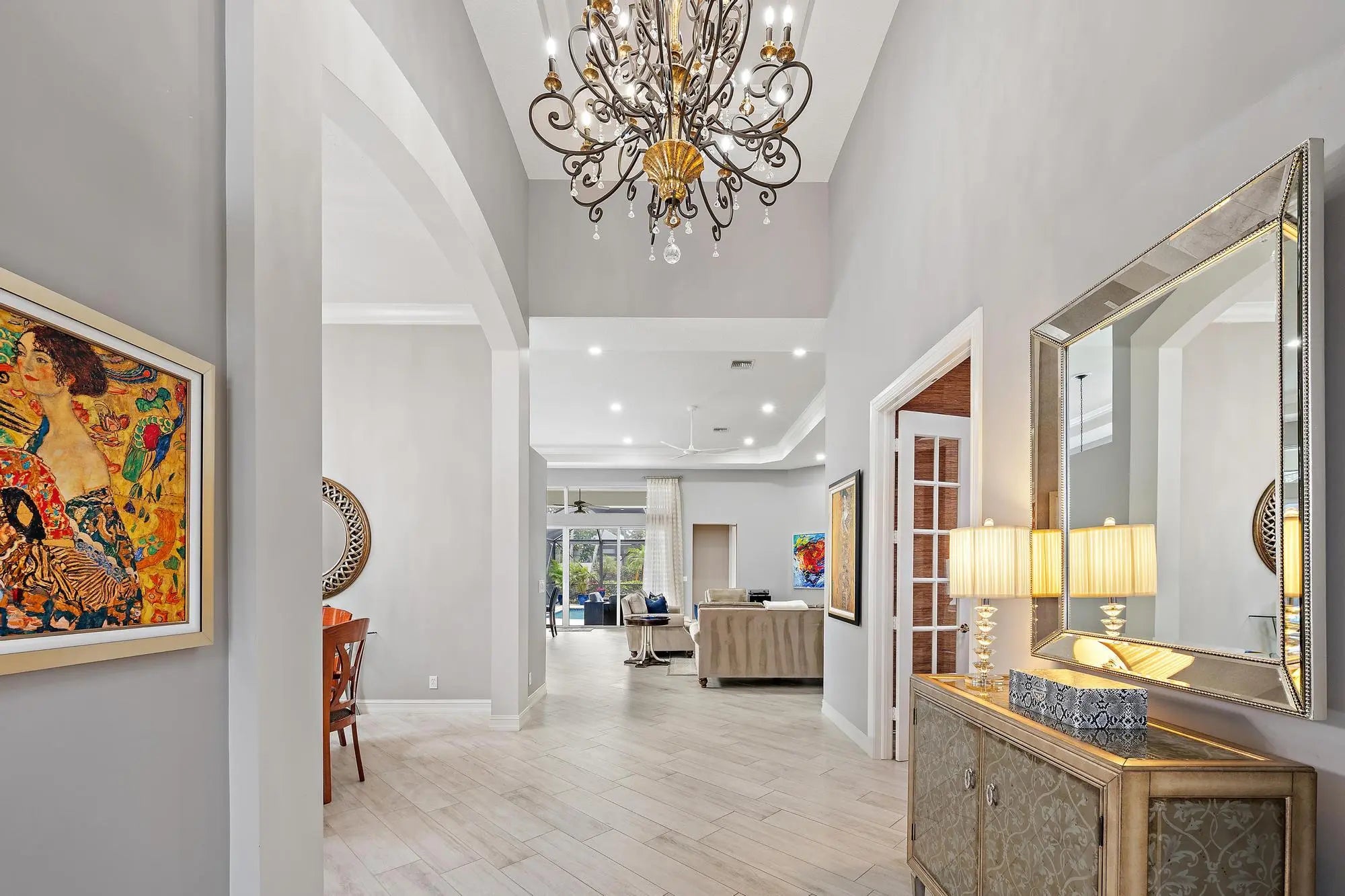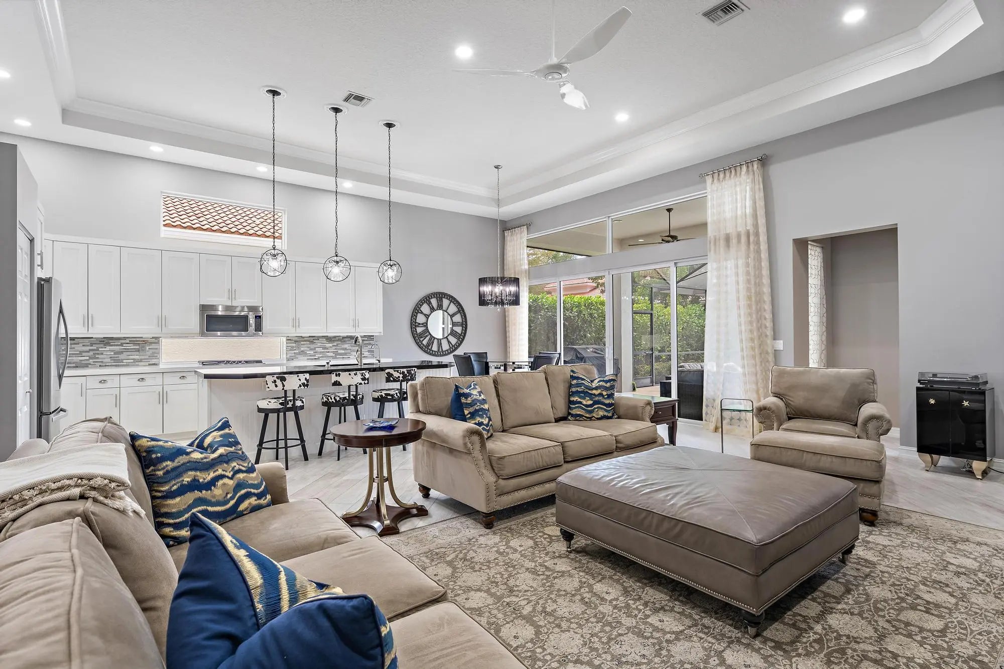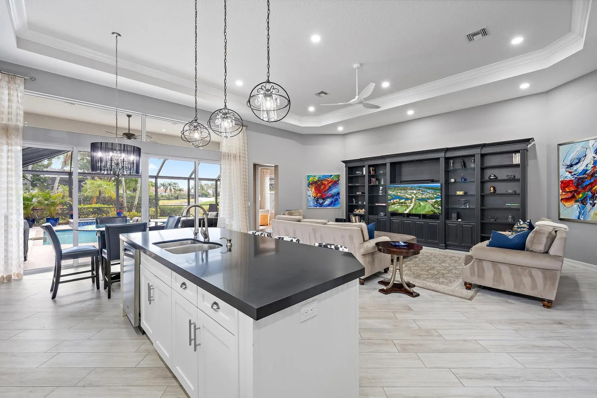 Renovated, refined, and exceptionally located in Villagio--just steps from the Club at Ibis-- this beautifully updated Portofino model offers the perfect blend of style, infrastructure upgrades, and an unbeatable setting. Positioned on the desirable Piazza across from the picturesque fountain, the residence enjoys a southern rear exposure overlooking the lush green of Tradition Course #17, capturing light, warmth, and tranquil golf views. Inside, the home has been thoughtfully transformed with all-new designer flooring throughout, including elegant porcelain tile and wood-look plank set on the diagonal, creating a cohesive and contemporary aesthetic. The popular 3BR/3BA+Den great room floor plan offers open, inviting living spaces ideal for both everyday comfort and entertaining. The kitchen has been reimagined with modern finishes, flowing seamlessly into the main living areas. Over the past several years, the home has undergone extensive improvements, ensuring both beauty and peace of mind. Impact glass windows and doors throughout, a whole-house generator, and a new HVAC system provide security and efficiency. Additional upgrades include a new hot water heater, complete whole-home water filtration system with reverse osmosis in the kitchen, new washer and dryer, new disposal, and replaced central vacuum equipment. Outdoor living has been elevated with brushed marble pavers on the pool deck, an upgraded lanai screen enclosure, and a new pool heater, all framed by a freshly painted exterior (2024). Interior paint was completed following installation of the impact glass, and custom Closet Wizard built-ins enhance storage throughout. The guest bathroom was beautifully renovated in August 2025, and both guest bedrooms feature new flooring. Even the details have been addressed, including a new garage door opener. Villagio is known for its charm, walkability, and proximity to Ibis's world-class amenities. As a resident of The Club at Ibis, you'll enjoy access to a 90,000-square-foot clubhouse, three Nicklaus-family championship golf courses, five dining venues, a state-of-the-art fitness complex and spa, and premier tennis and pickleball facilities.